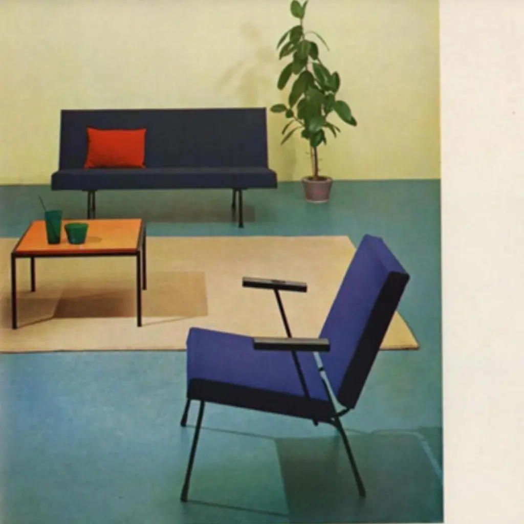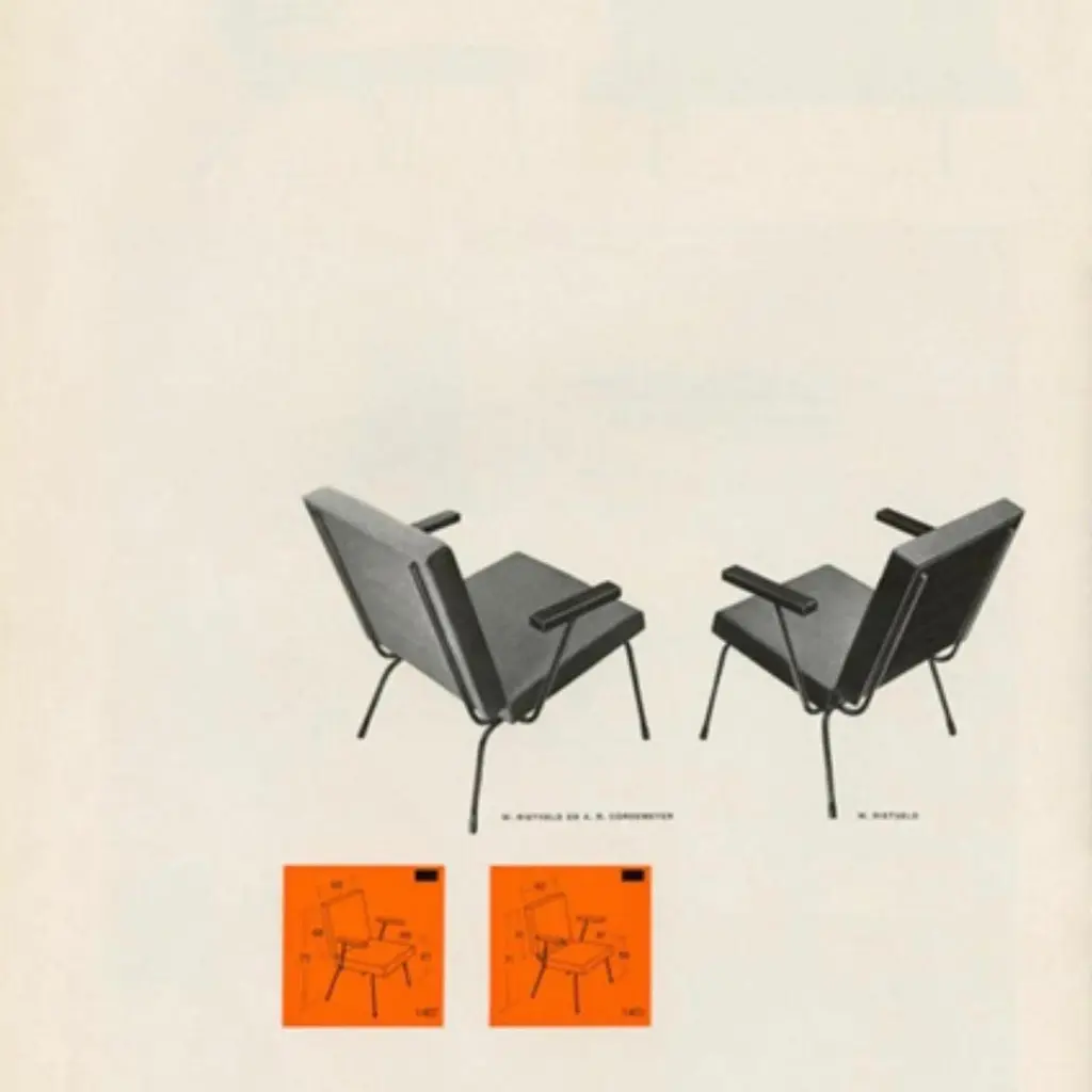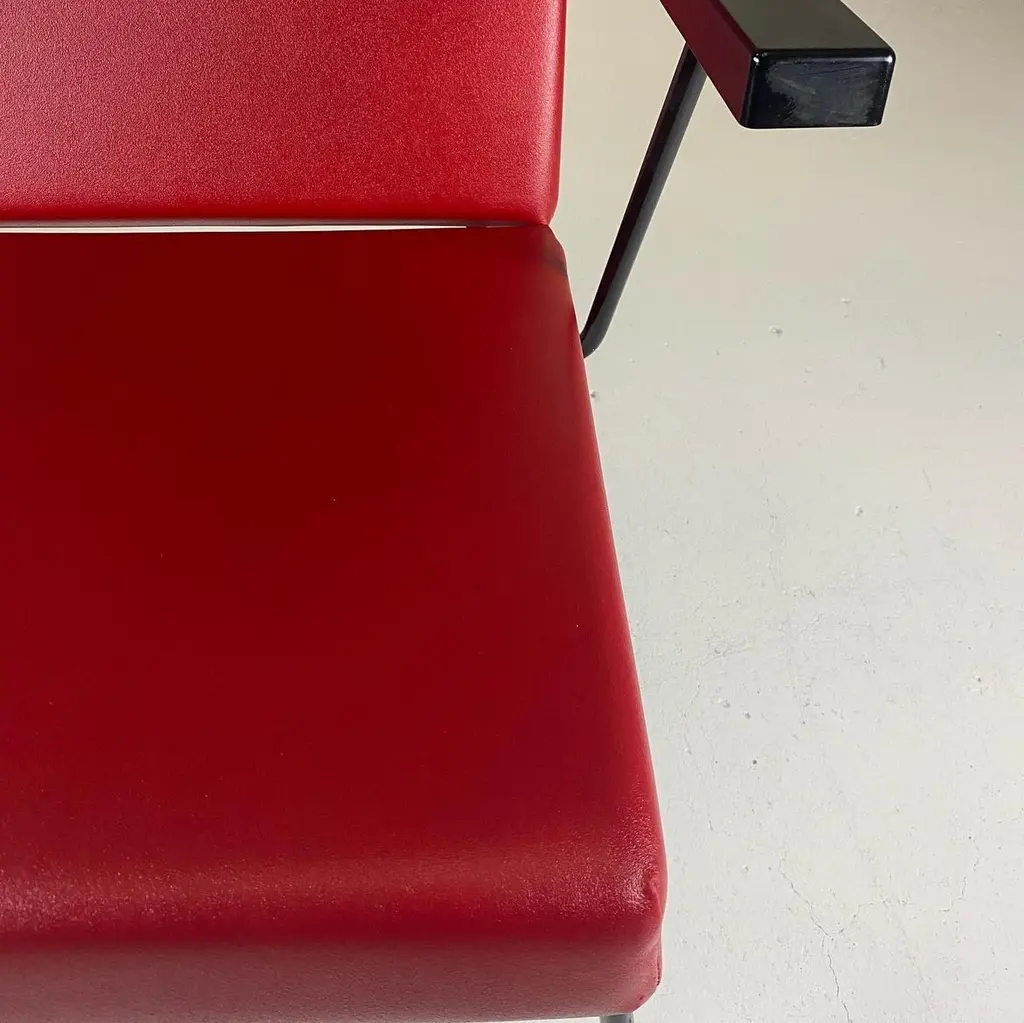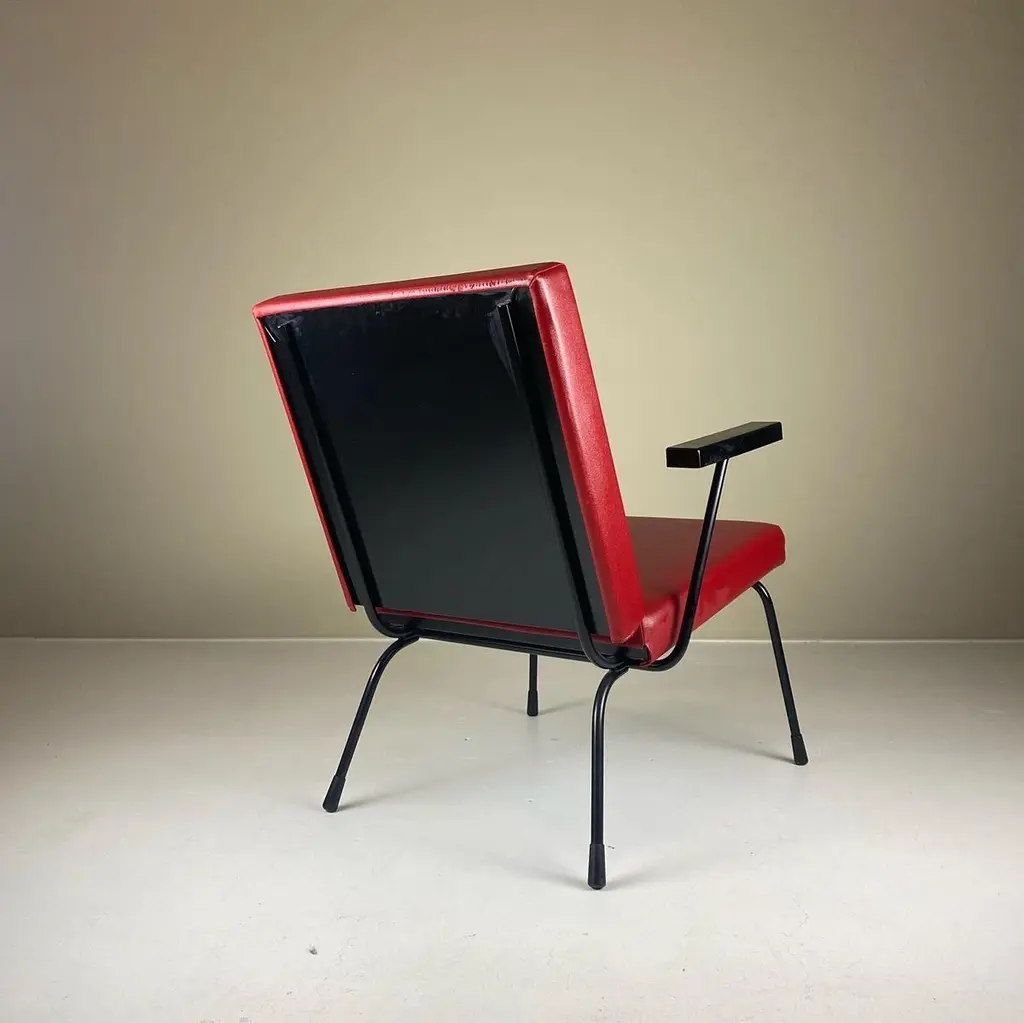 Launched in 1954 as an affordable armchair for Dutch homes and a design classic ever since, this 1407 armchair is designed by Wim Rietveld (son of Gerrit Rietveld) and Andre Cordemeyer for Dutch manufacturer Gispen. The chair was first shown at the 10th Milan Triennale (1954) and was awarded with a gold medal. The original design was named the 415 or 1401 Chair and was actually quite a bit smaller. It soon became a beautiful addition to the children’s room. This 1407 chair is definitely better proportioned and very suitable for the modern home.The listed set of 1407 chairs were produced in the 1990s — the latest version, with visible graphite black back — and is in a lovely pre-owned condition with only slight wear consisting with age and use. It features bakelite armrest and still has its, indestructible, original vinyl upholstery.Price is for the set of two, I have three sets available (one in red)General note: Shipping quotes as supplied by 1stdibs are only indicative. We will discuss and figure out the best possible shipment method (and rate) for every individual object.