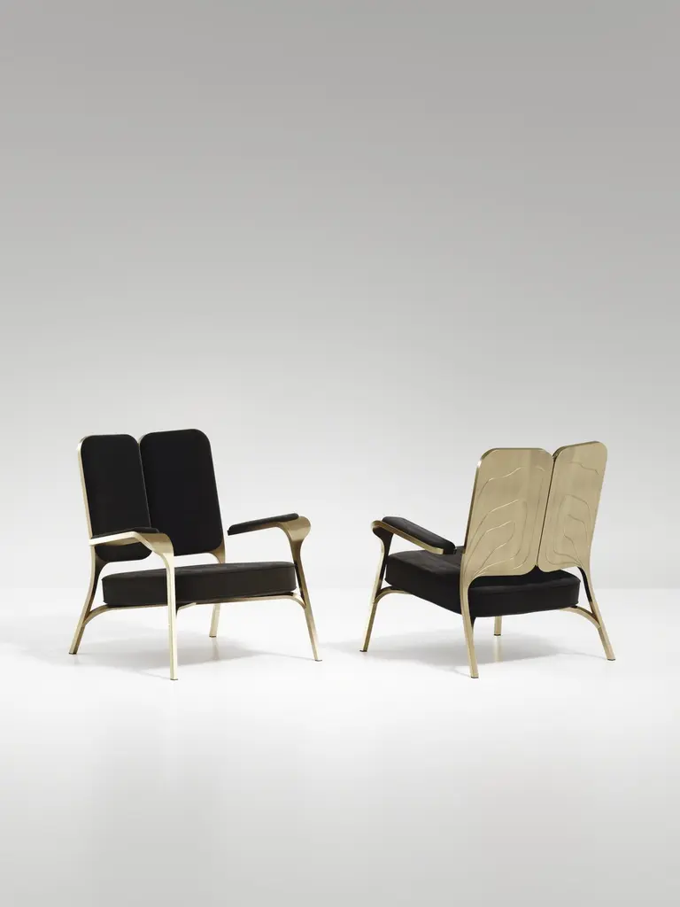 The Paris based label has distinguished themselves since their launch, with their iconic use of shagreen mixed with brass and other exotic materials. All furniture is handcrafted by skilled artisans, ultimately making each piece unique, designed in Paris and produced in the Philippines.The Set of 2 Gingko armchairs by R & Y Augousti are elegant and whimsical pieces. The upholstered blue velvet pieces provides comfort while exuding a playful aesthetic in its abstract nod to a butterfly with the form of its backrest and intricate engraving details. Custom finishing/sizing available on requestThe dimensions of this piece are :Armchair- 76 cm x 73 cm x 36.5 cm (seat height) / 80 cm (backrest height)All R & Y Augousti pieces are handmade by artisans, ultimately making each piece unique.Wipe clean with soft dry cloth.Acclaimed design duo Ria & Yiouri Augousti have established themselves since the 1990s as pioneers of modern-vintage style through their luxurious Art Deco inspired collections.The Paris based label has distinguished themselves since their launch, with their iconic use of shagreen mixed with brass and other exotic materials. All furniture is handcrafted by skilled artisans, ultimately making each piece unique. All shagreen-covered items should be kept out of direct sunlight, color variants may occur on the stingray and other exotic finishes, but this showcases the Parisian label's commitment to creating authentic luxurious products using natural components.