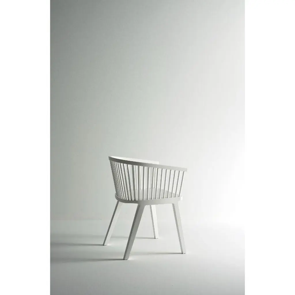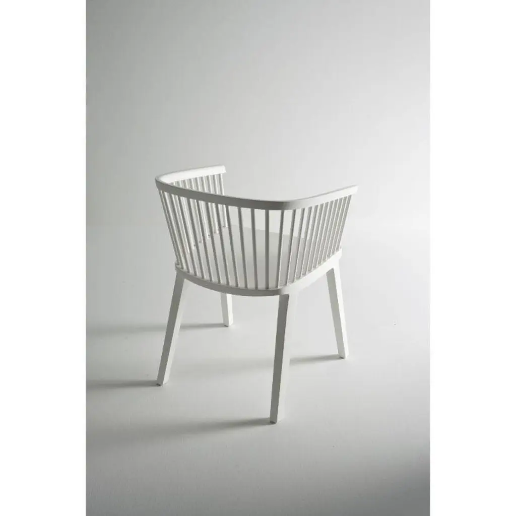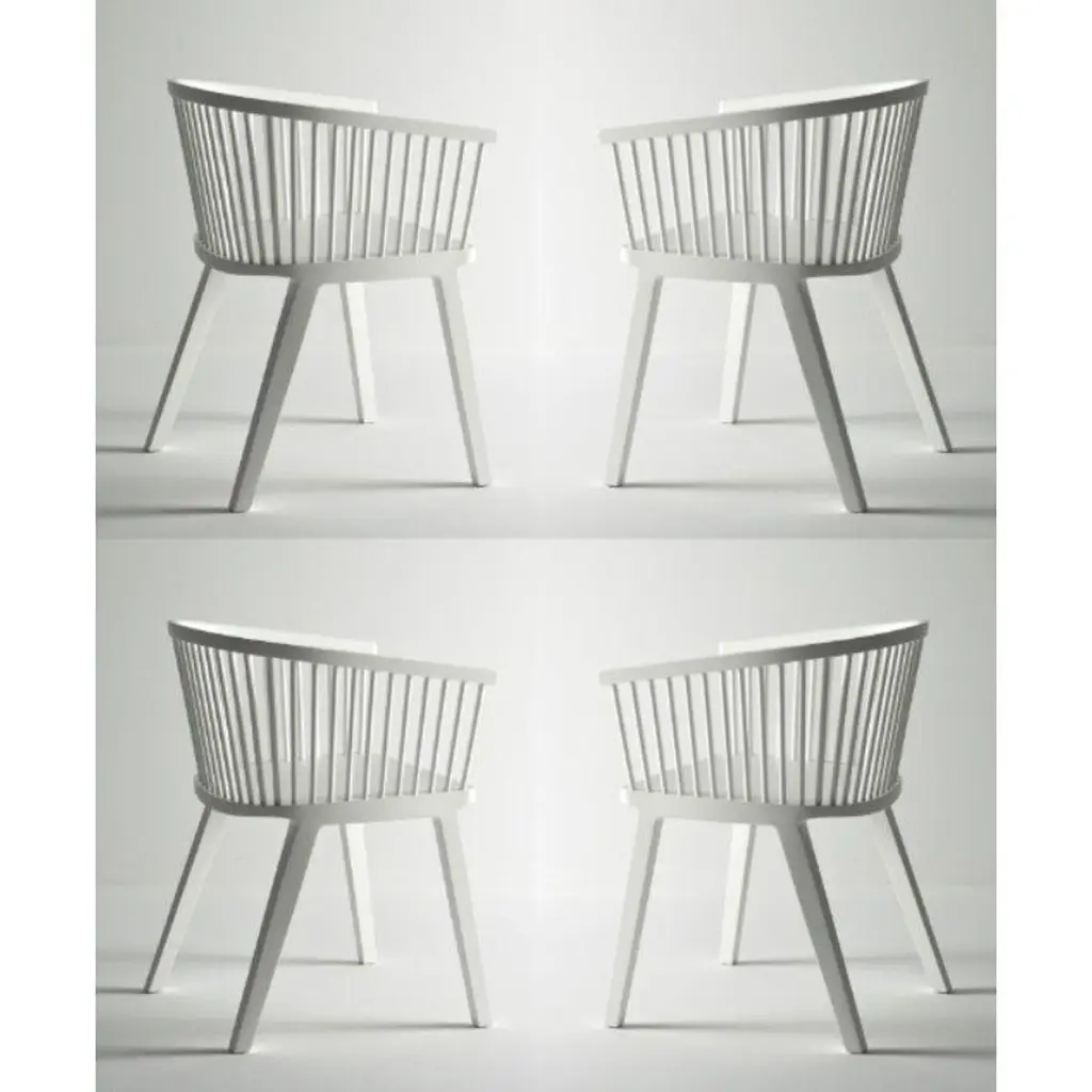 Set of 4, Secreto little armchair - white matt lacquer by Colé Italia with Lorenz KazDimensions: H 76, D 52, W 57, cmMaterials: Solid beech wood natural or lacquered finishingAlso Available: Secreto Little Armchair Black Matt Lacquer, Natural Beech & Different Upholstery Options.TC: C.O.M. fabric - send us your own materialCA: Cat A - Angel (polypropylene), Ganesha (synt. leather), Nord Wool (felt)CB: Cat B - Tiffany (polyestere), Lana (aquaclean)CC: Cat C - Velvetforthy (Velvet), Topia (wool), Novum (Wool), Opera (felt)CP: Cat P - Milano (full grain leather) Modern and traditional at the same time. Inspired to the traditional Windsor Chair with a clear brief brilliantly interpreted by duo Lorenz + Kaz — to work inspired by traditional furniture creating industrial design with artisan taste. A key element is the structure, which denotes the complexity linked to the manufacture and to different levels of details, especially in the back, composed of interlocking rods inserted into the base one by one by hand. Available in solid beech with a transparent water eco paint coat or matt lacquered in white or black. Secreto armchair can be dressed with an optional upholstered cushion for the back and the seat with lining in different fabric categoriesColé is a young Italian design brand, with a high-end production 100% made in Italy. Born from the experience of Matteo De Ponti, architect, who grew up in one of the most outstanding Milanese design families, and the artistic sensibility of Laura Macagno, degree in Economics and passionate of art and design. Our Mission is to create design icons, beautiful and comfortable pieces that can Stand the test of time, furnishing houses of international and sophisticated clients, and realized with craftsmanship, thus unique. “We love objects which own deep roots, excellent quality, and a strong evocative power. Archetypal forms dressed with new beauty without losing their classical composure”.Our expressive research is inspired by the utopian force of Italian eminences grises architects and designers of the ’50s, the Scandinavian design, the Bauhaus, ethnic handcraft and houses of famous writers of the XX century, all different as a style but united by the intense soul of those who worked and lived there.
