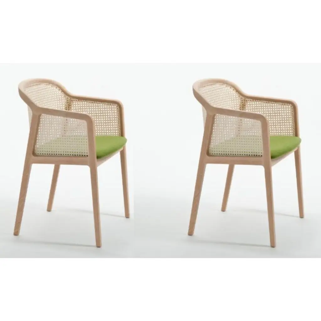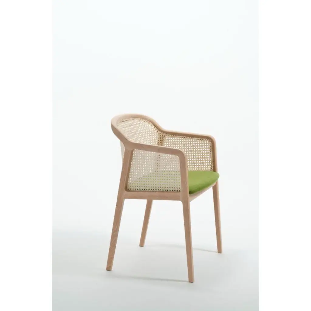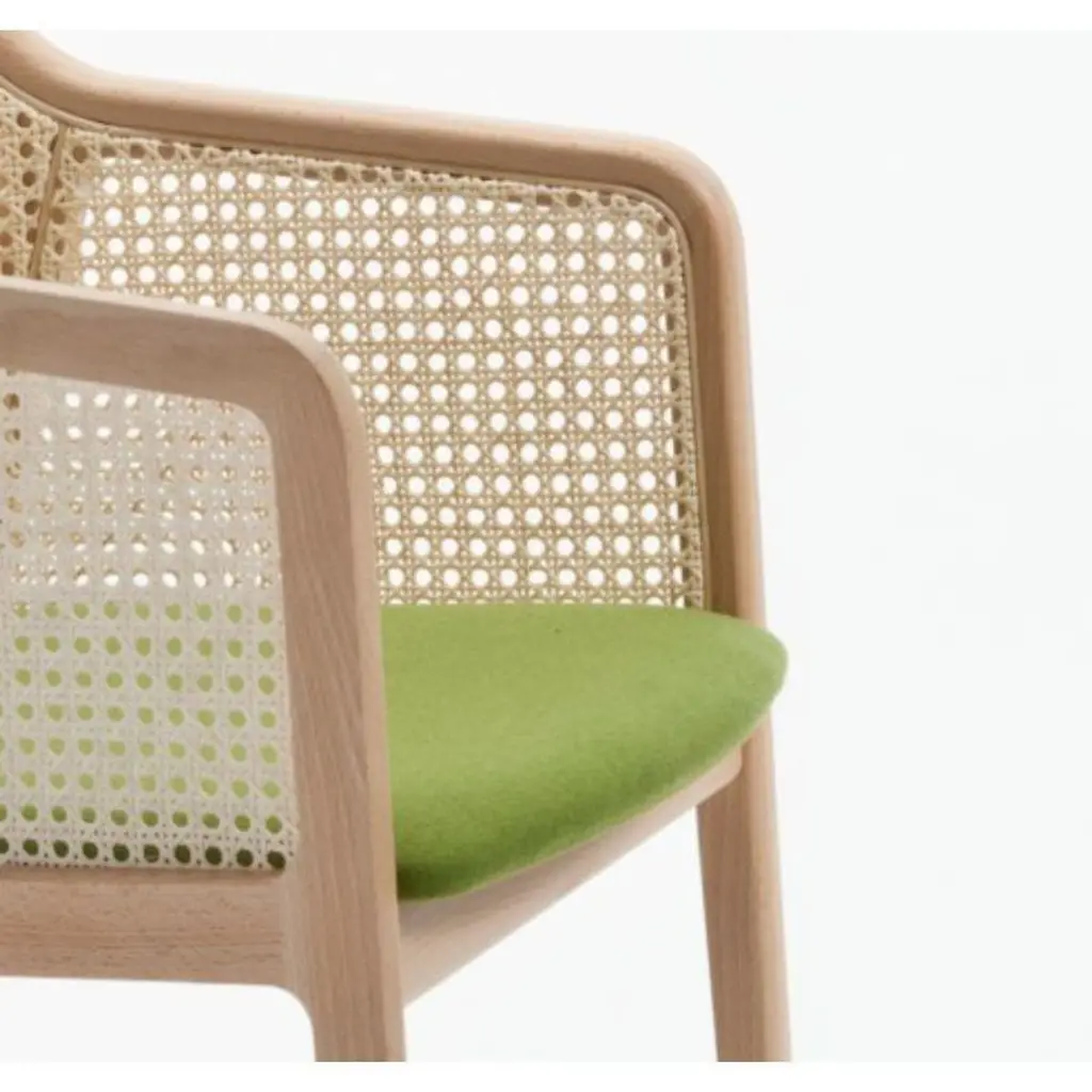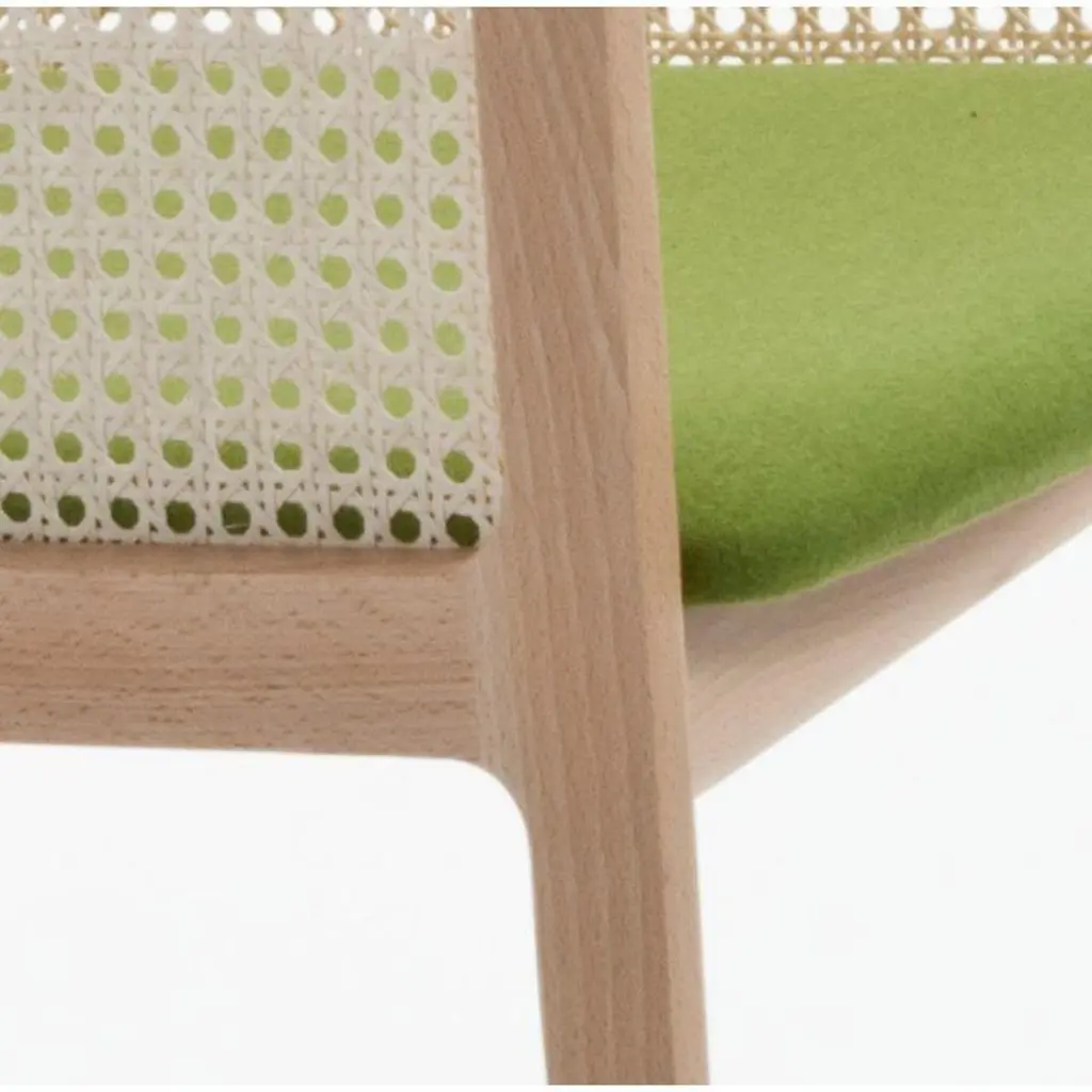 Set of 4, Vienna Little armchair, Beech Wood, Acid Green by Colé Italia with Emmanuel GallinaDimensions: H 78, W 53, D 50 cmMaterials: Stained Beech Wood Chair with Straw Back and Upholstered SeatAlso Available: CA Canaletto; WE Wengé; BK Black, Vienna Chair, Vienna Soft Little Armchair, & Different Materials.TC: C.O.M. fabric - send us your own materialCA: Cat A - Angel (polypropylene), Ganesha (synt. leather), Nord Wool (felt)CB: Cat B - Tiffany (polyestere), Lana (aquaclean)CC: Cat C - Velvetforthy (Velvet), Topia (wool), Novum (Wool), Opera (felt)CP: Cat P - Milano (full grain leather) Vienna is an extraordinarily comfortable and elegant collection of chairs and armchairs designed by Emmanuel Gallinawho loves to quote Brancusi when saying that “simplicity is complexity resolved”. Inspired to the 50’s of Marcel Gascoin,but also to Vienna at the end of the 19th century. A tribute to Alfred Sloan’s American pragmatism joined to Europeanstyling and, in this particular case, to the renowned Italian talent constantly aiming to harmonize beauty and functionality.In solid beech and straw, it is a perfect combination between digital machines and handcraft. The structure is in solidbeech. The back is in hand-braided Vienna straw fixed in a milling. The padded seat is available in different fabrics fittedfor contract use. In the variation Vienna Soft, both chair and armchair have totally upholstered seat and back.Colé is a young Italian design brand, with a high-end production 100% made in Italy. Born from the experience of Matteo De Ponti, architect, who grew up in one of the most outstanding Milanese design families, and the artistic sensibility of Laura Macagno, degree in Economics and passionate of art and design. Our Mission is to create design icons, beautiful and comfortable pieces that can Stand the test of time, furnishing houses of international and sophisticated clients, and realized with craftsmanship, thus unique. “We love objects which own deep roots, excellent quality, and a strong evocative power. Archetypal forms dressed with new beauty without losing their classical composure”.Our expressive research is inspired by the utopian force of Italian eminences grises architects and designers of the ’50s, the Scandinavian design, the Bauhaus, ethnic handcraft and houses of famous writers of the XX century, all different as a style but united by the intense soul of those who worked and lived there.