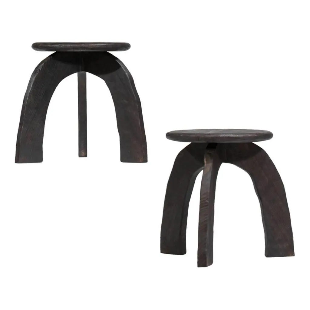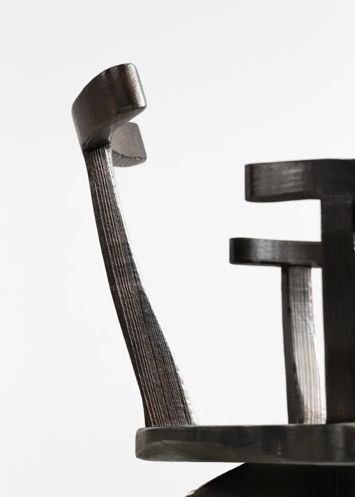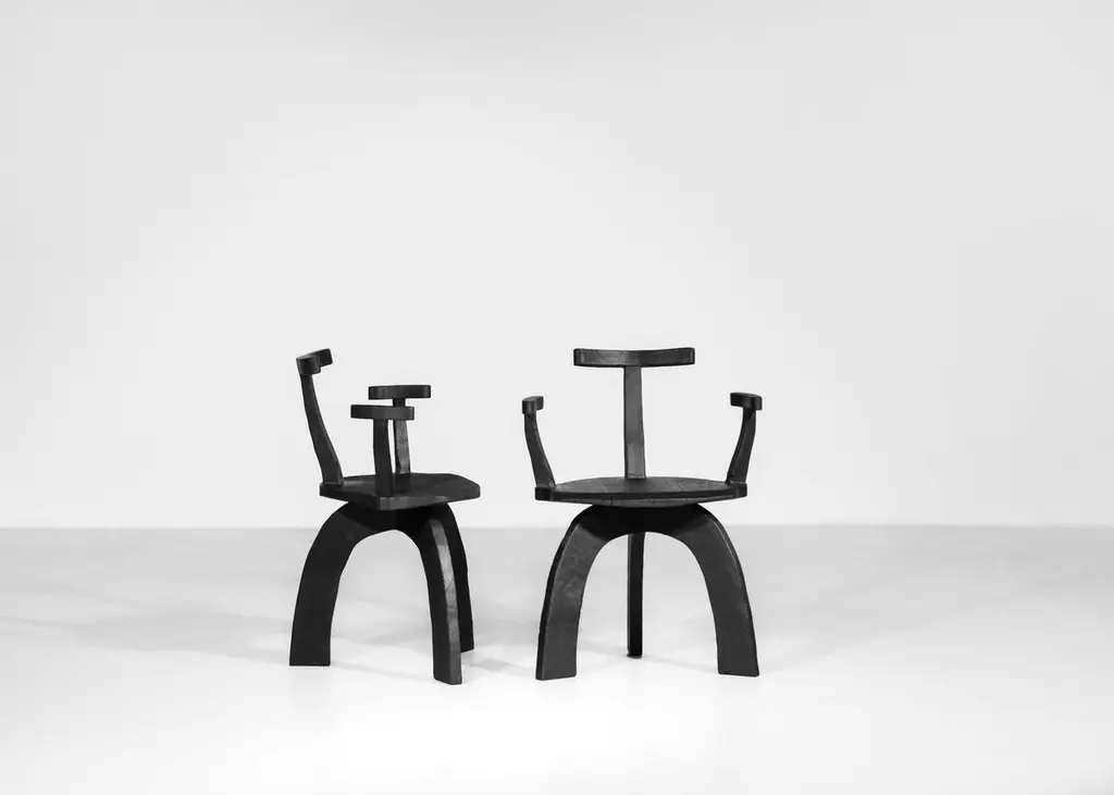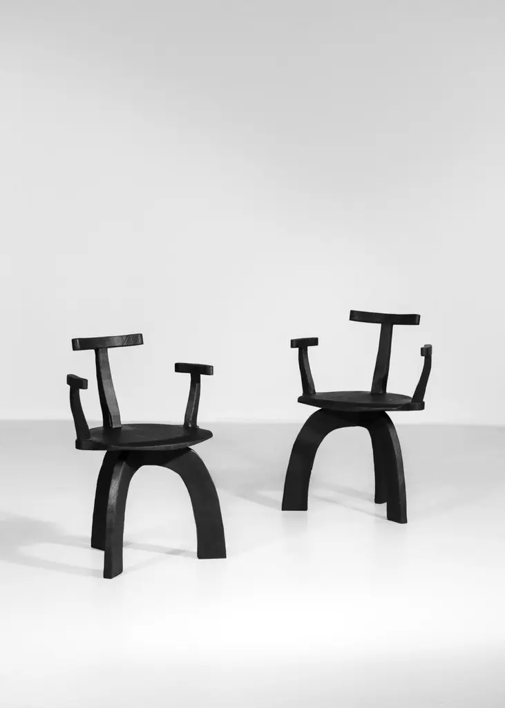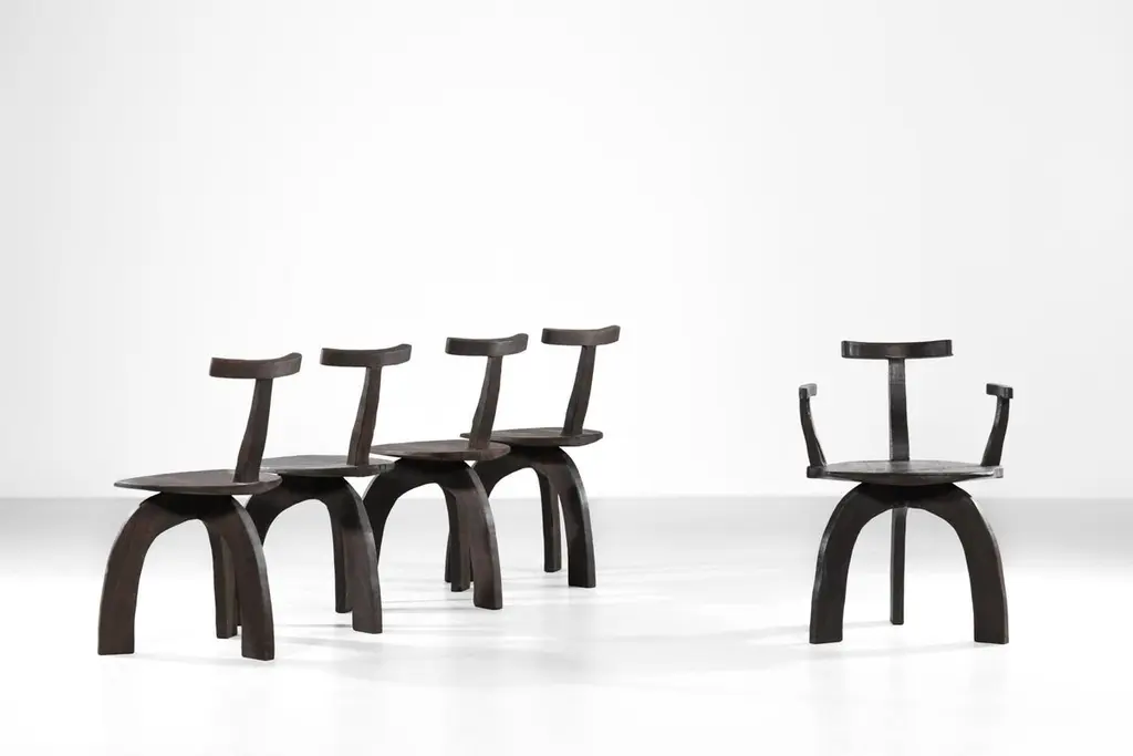 set of 8 armchairs.We are pleased to present our new collaboration with Vincent cabinetmaker.Sculptural design, comfy and robust, each piece is unique.Entirely handcrafted by Vincent in his own warehouse.Every pieces are assembled by traditional tenon mortise joint (no screw)The burnt finish reveals the veins of the wood but also protect the wood.High quality work.In style of Pierre Chapo, Olavi Hanninen, Charlotte Perriand.