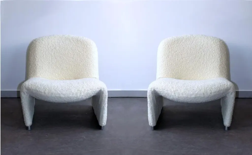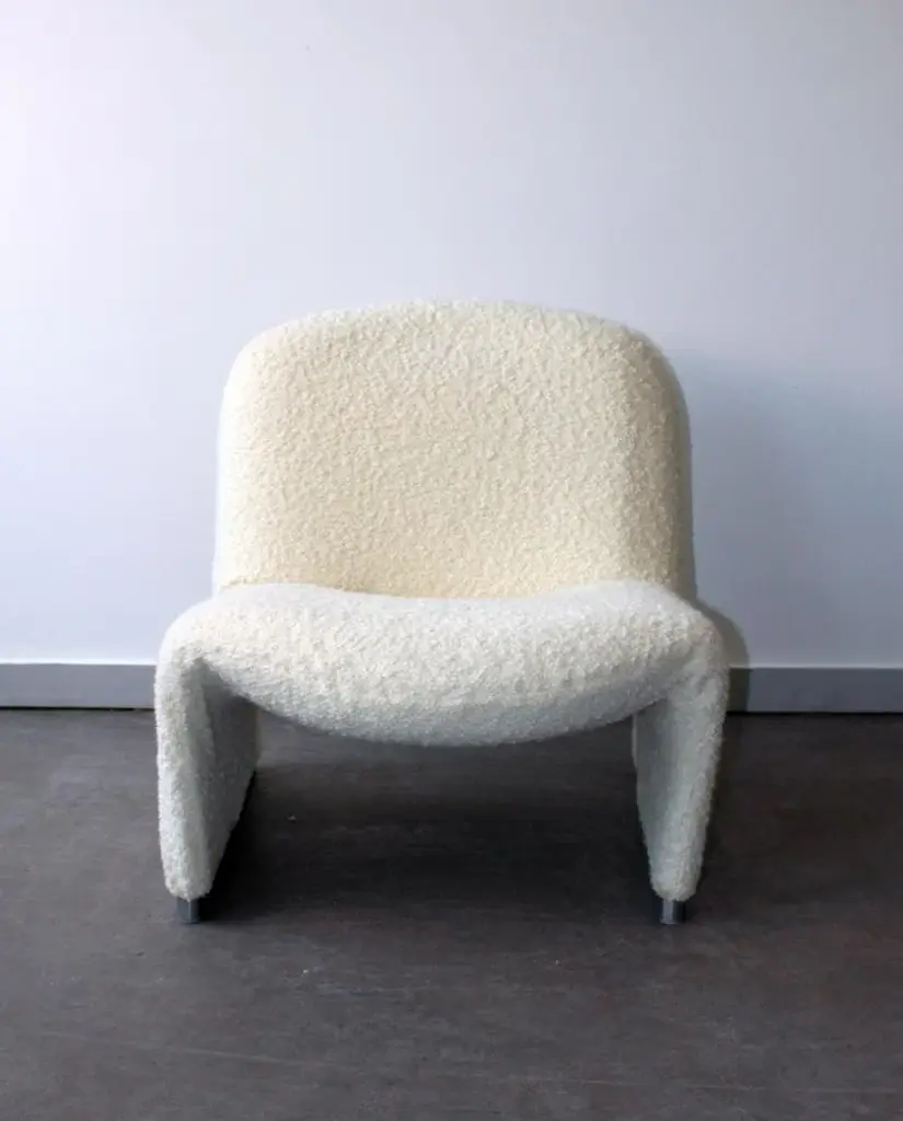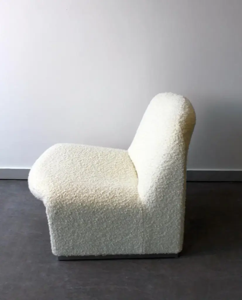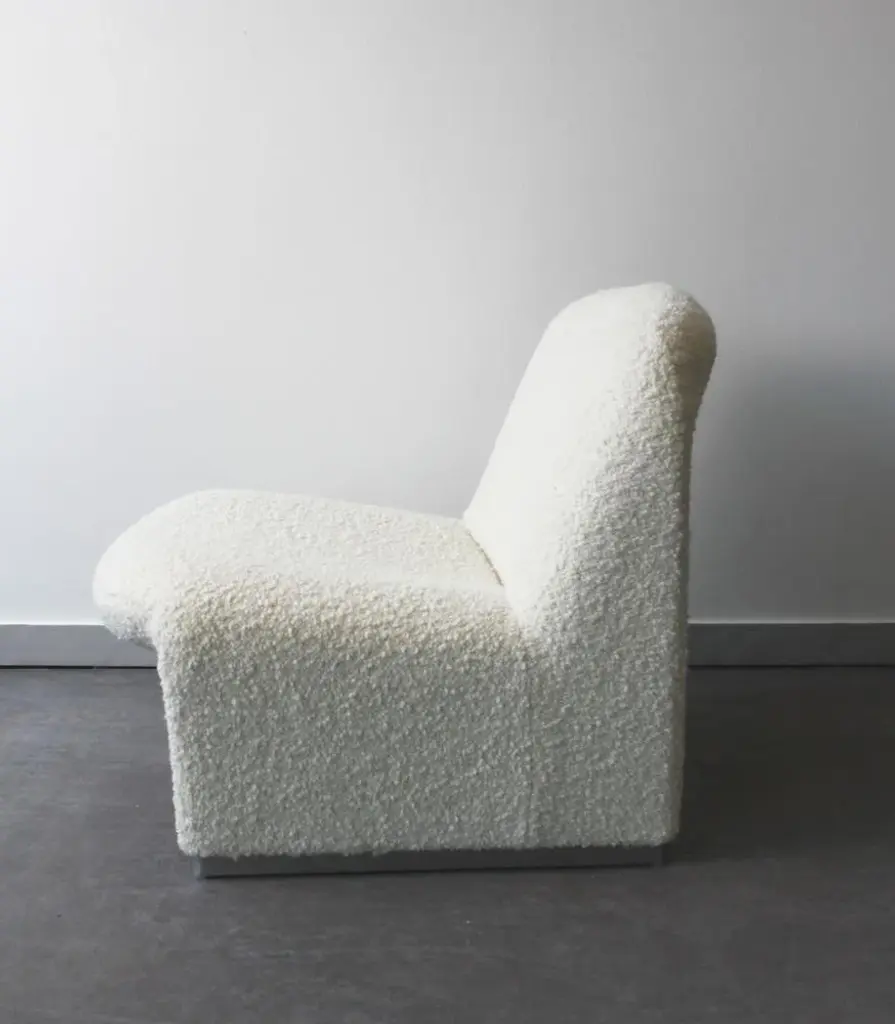 The famous Giancarlo Piretti chair in high density thermoformed foam on a steel structure. Covering in imitation sheep fur, for a moment of relaxation or a timeless reading break on this little cocooning cloud, with a timeless design. This piece is attributed to the mentioned designer/maker. It has no attribution mark and no official proof of authenticity, however it is well documented in design history. I take full responsibility for any authenticity issues arising from misattribution