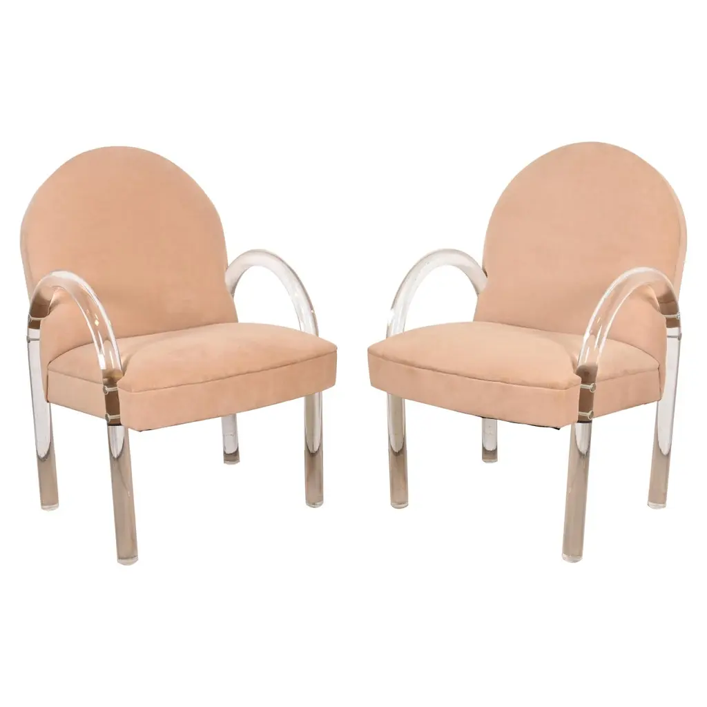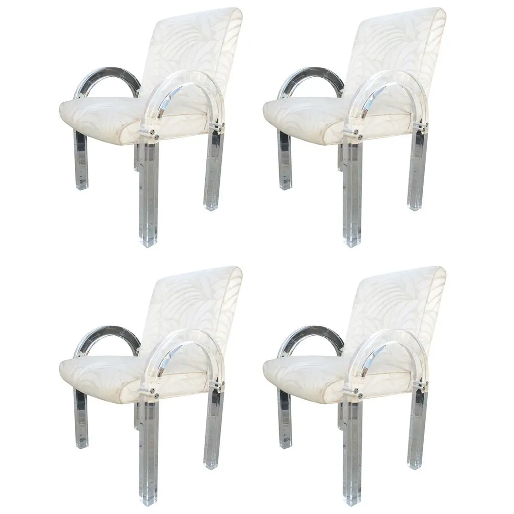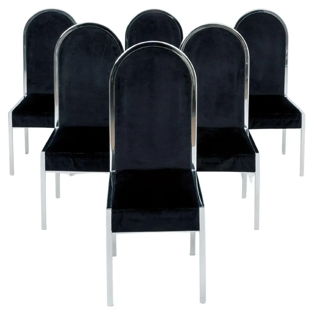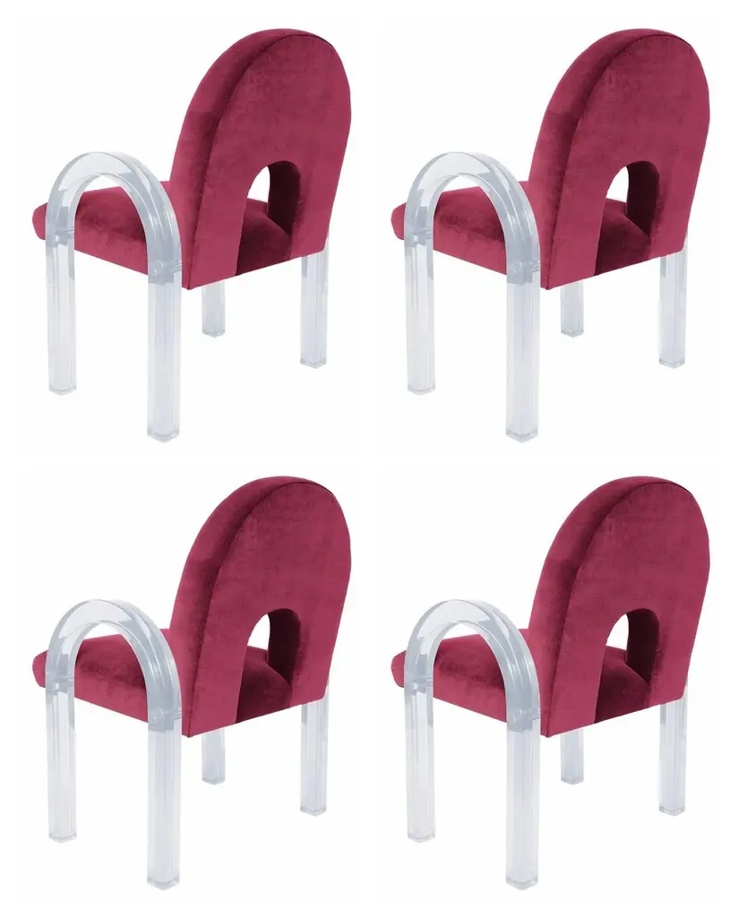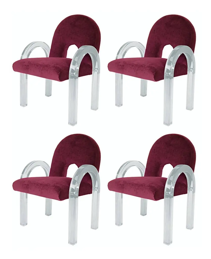 Stunning set of four armchairs designed and manufactured by Charles Hollis Jones as part of the "Arch" line.The Arch line was created after Charles started working with the owner of the Raiders, Al Davis – while designing a set of chairs for his executive office in Beverly Hills with the feeling of a football helmet, and the silhouette of a dome. The chairs are in very good original condition, they can be upholstered in COM or COL for an additional fee.The chairs are part of an original set of four, one chair is signed (Charles Hollis Jones Set of 4, 1/4 the rest of the chairs are signed 2/4-3/4-4/4).The set is dated 1970.Measurements:Height: 35 in. (89 cm).Width: 24.75 in. (63 cm).Depth: 28 in. (71 cm).Seat height: 19 in. (48 cm).If you are coming to our show room to see a piece please call ahead of time because due to our large inventory some items are available by appointment only.