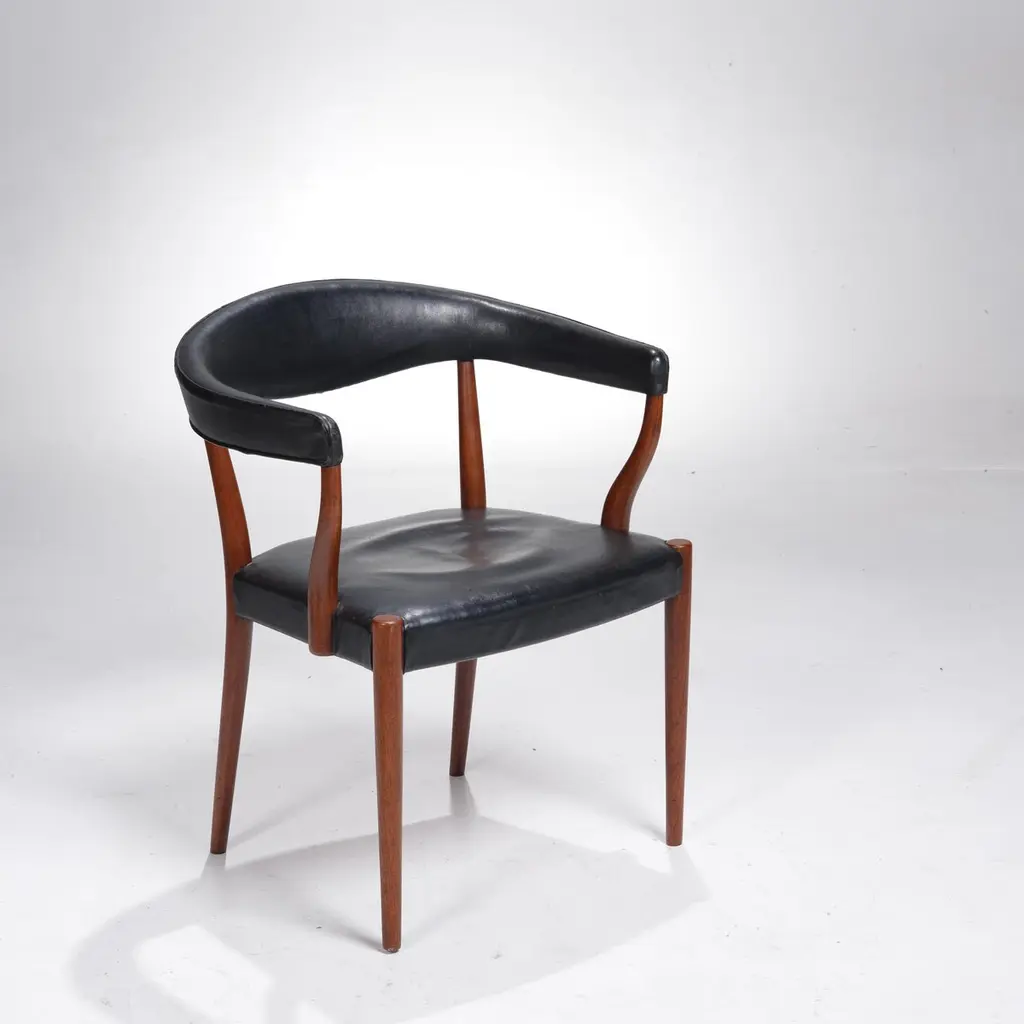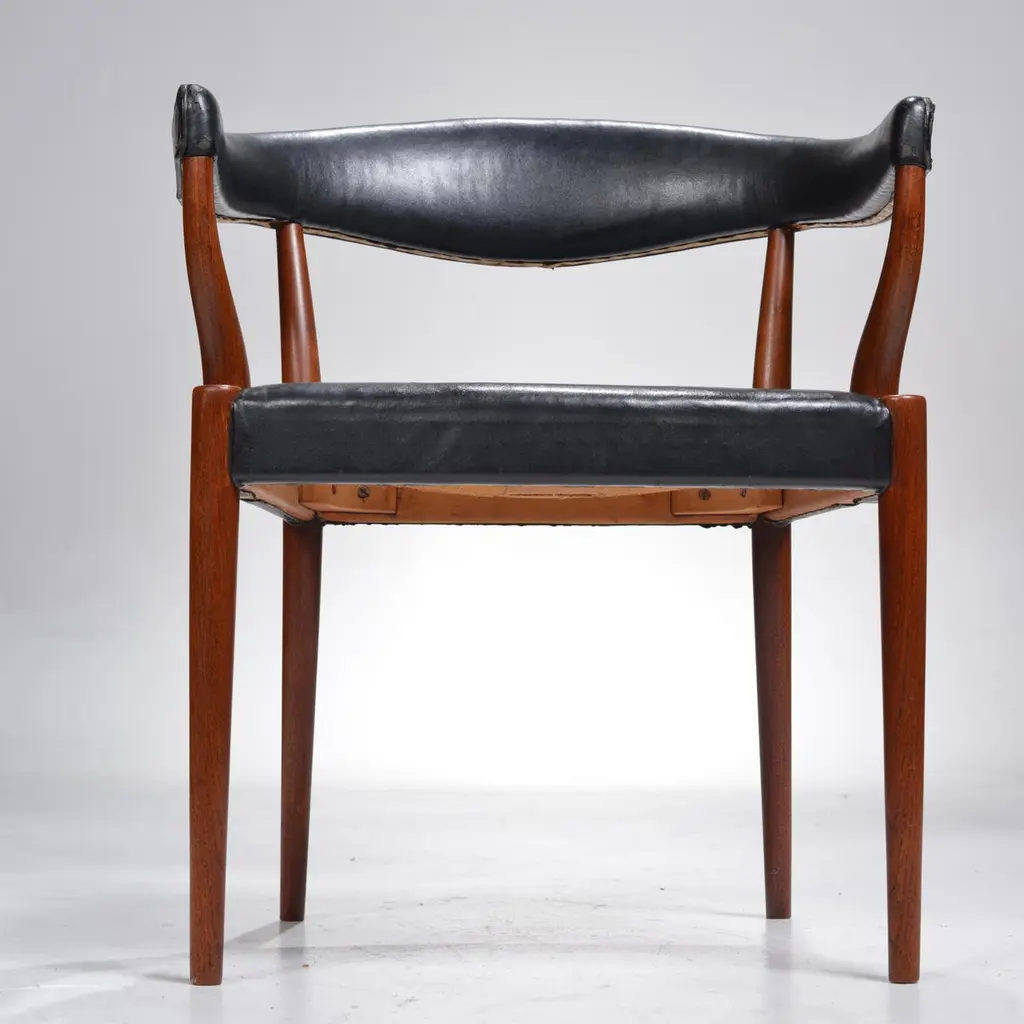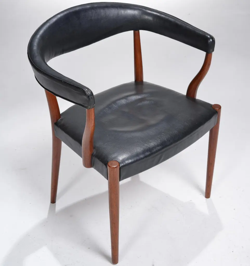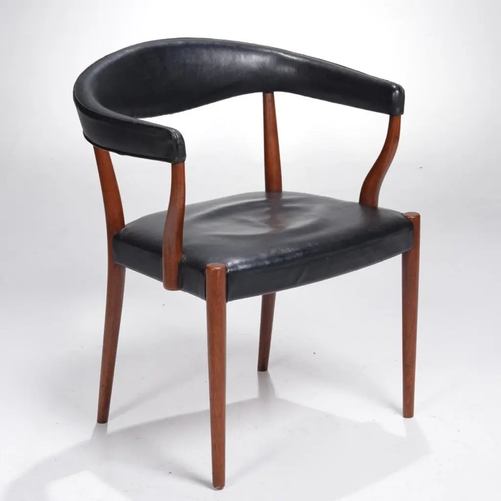 Four model B49 armchairs by Jacob Kjaer. Constructed in teak with seat and curved back upholstered with original black leather. On Display in our Los Angeles showroom. Priced per chair.
