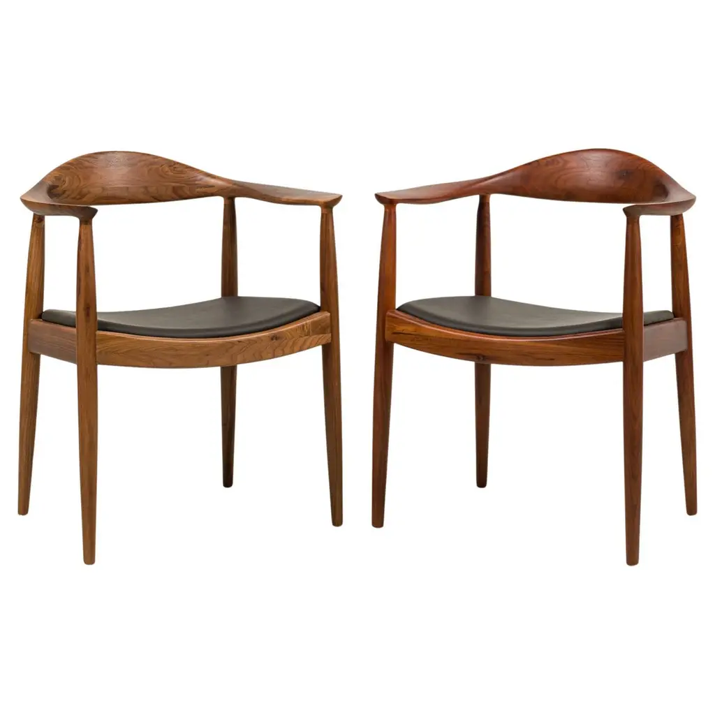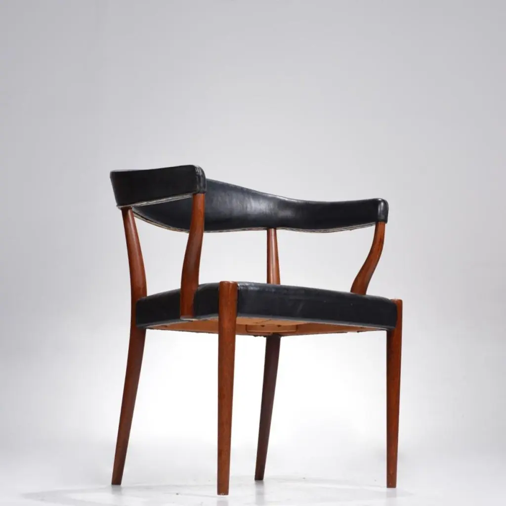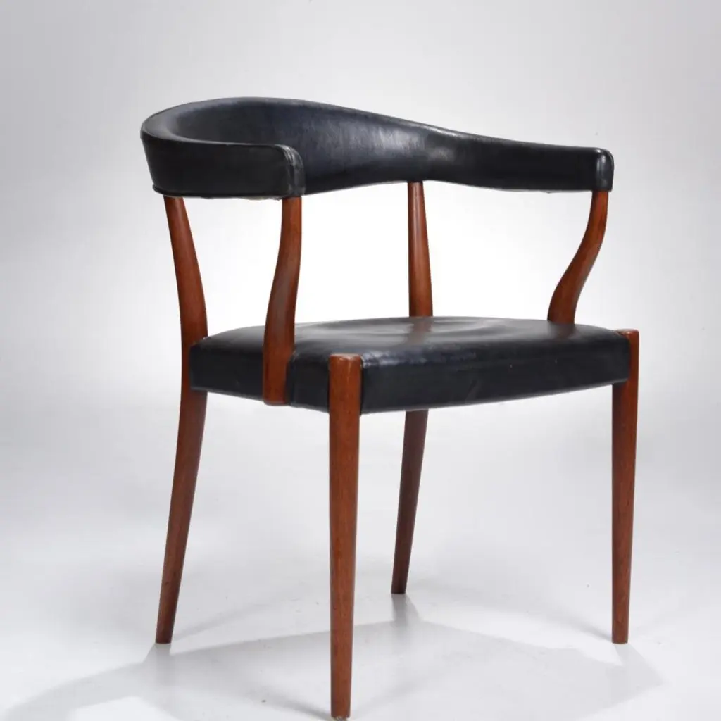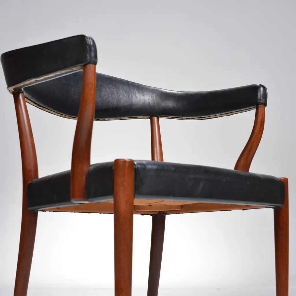 Four model B49 armchairs by Jacob Kjaer. Constructed in teak with seat and curved back upholstered with original black leather. On Display in our Los Angeles showroom. Priced per chair.