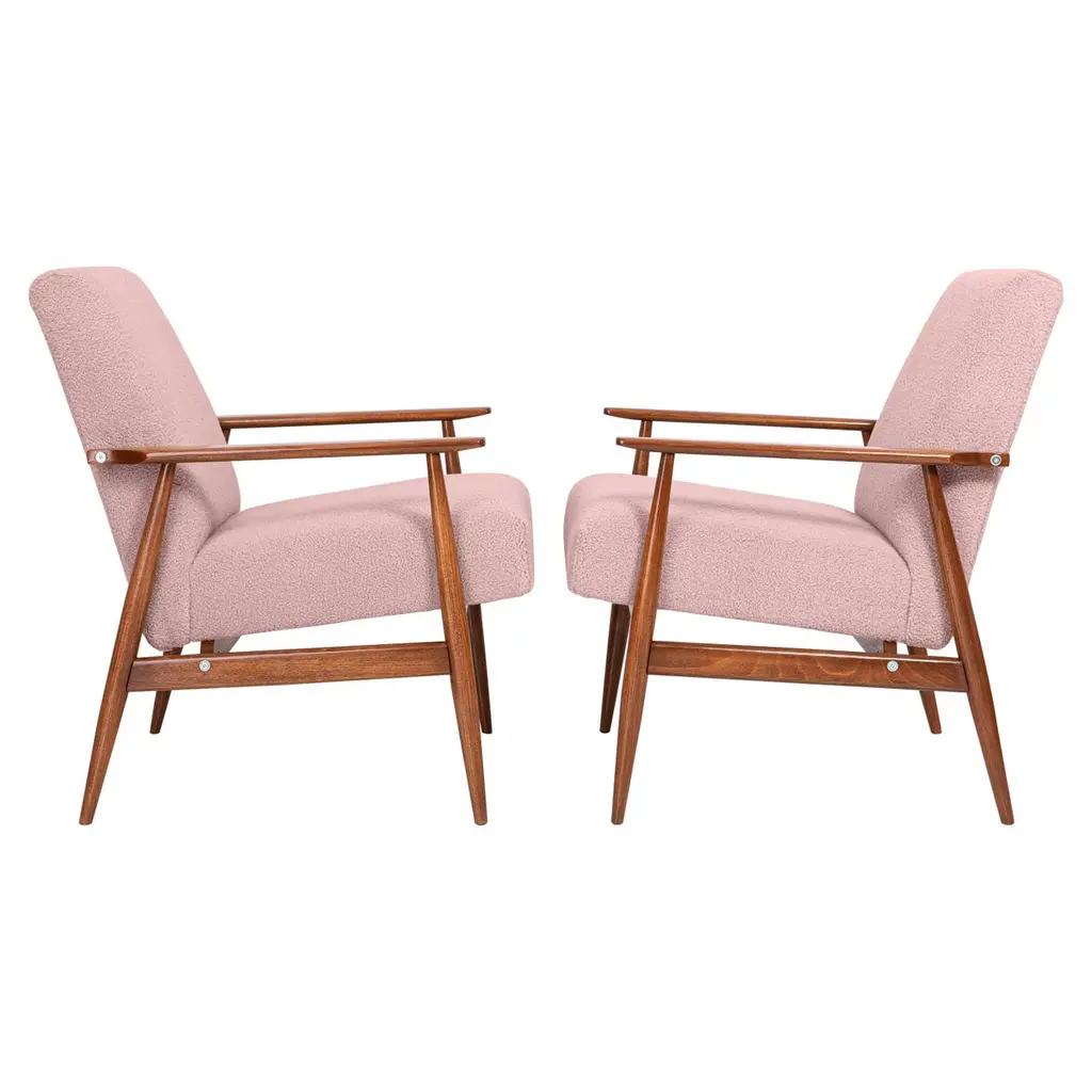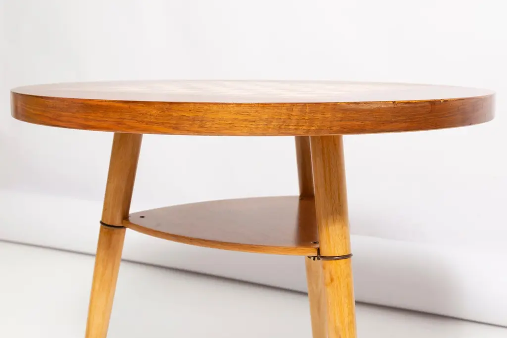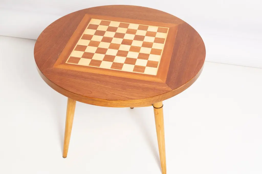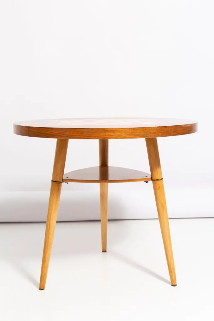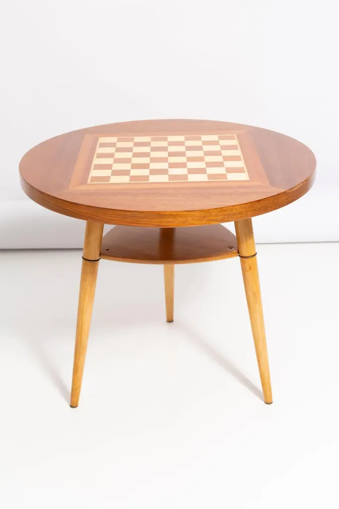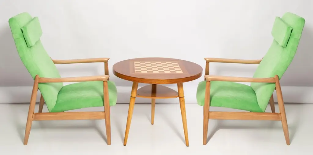 A pair of light lime green velvet armchairs, designed by Edmund Homa, a Polish architect, designer of Industrial Design and interior architecture, professor at the Academy of Fine Arts in Gdansk. The armchairs were made in the 1960s in the Gosciecinska Furniture Factory. They are made from solid beechwood. The GFM type armchair is regarded one of the best Polish armchair design from the previous age. The armchairs have been thoroughly renovated. The tension belts have been changed, new upholstery foams. Beautiful antique chess table from the 1960s. It was manufactured in Poland in 1960s. The table was made of wood and veneer plywood, it was refreshed. Very good original vintage condition. Table size: 60cm, height 57cm. The set looks really amazing all together. Cheap shipping guaranteed.