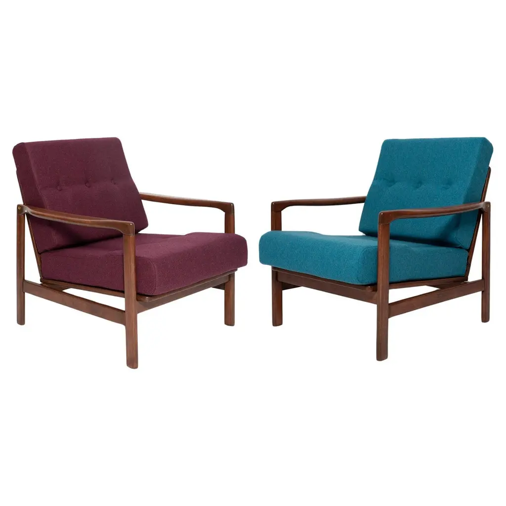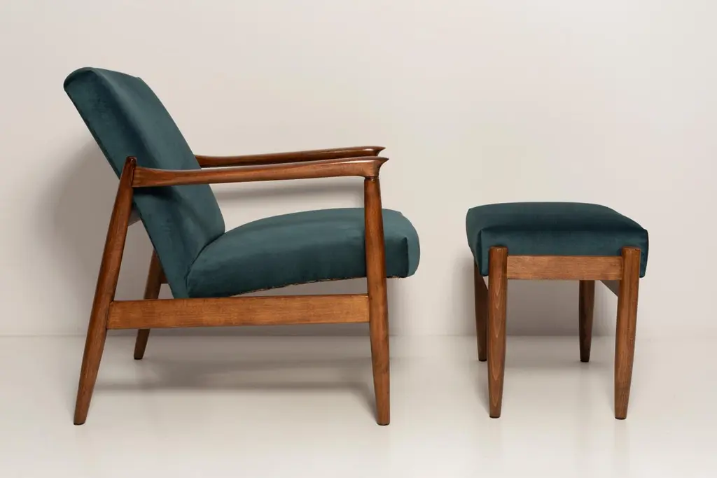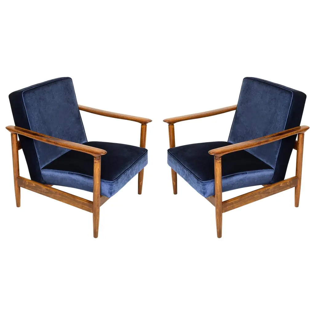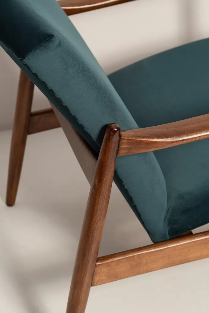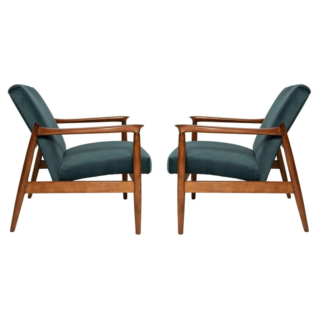 A pair of beautiful armchairs, designed by Edmund Homa. The armchairs were made in the 1960s in the Gosciecinska Furniture factory. They are made from solid beechwood. The GFM type armchair is regarded one of the best polish armchair design from the previous age. The armchairs have been thoroughly renovated. The tension belts have been changed, new upholstery foams, upholstery material has been used, petrol blue upholstery fabric of the highest quality. We can prepare this armchairs also in another wood and fabric option.