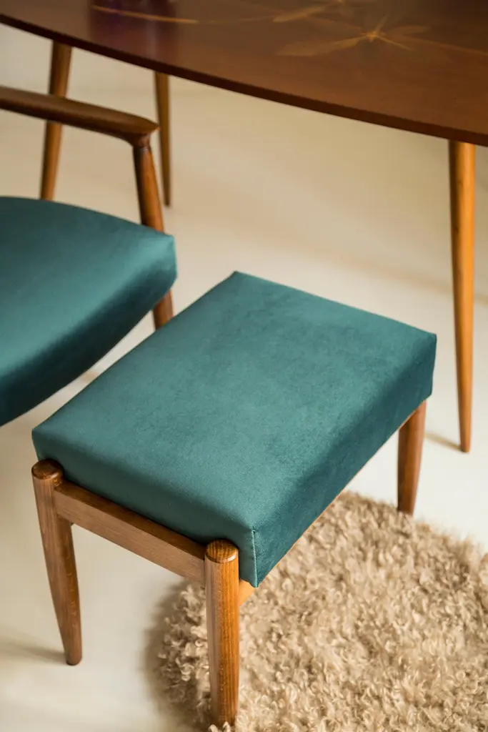 Set Of Petrol Blue Vintage Armchairs And Stools, Edmund Homa, 1960s