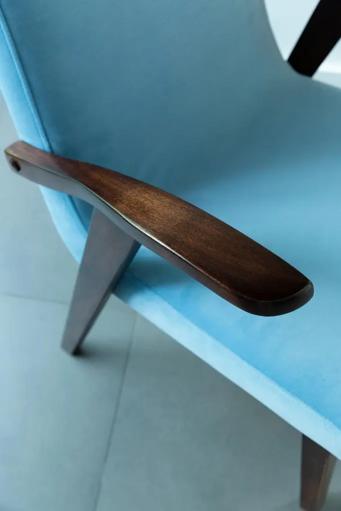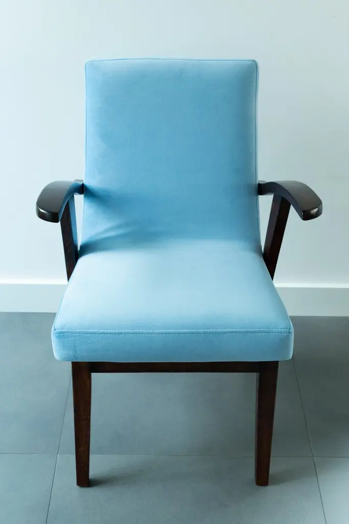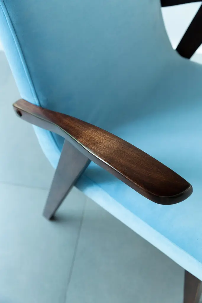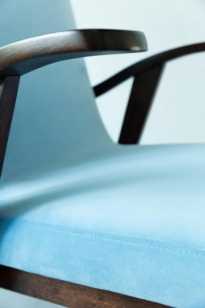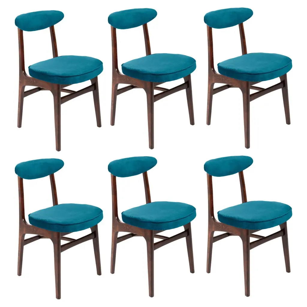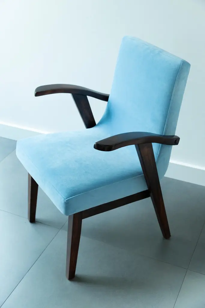Armchair designed by Mieczyslaw Puchala. Dark brown wood combined with a baby blue beautiful velvet gives it elegance and nobility. The chair has undergone a full carpentry and upholstery renovation. The wood is in excellent condition after full renovation, finished with semi-matte varnish. Produced in the 1960s in Poland. We can prepare set of 2, 4, 8 or more also in another wood and velvet color. Please check the last picture with velvet color samples.
