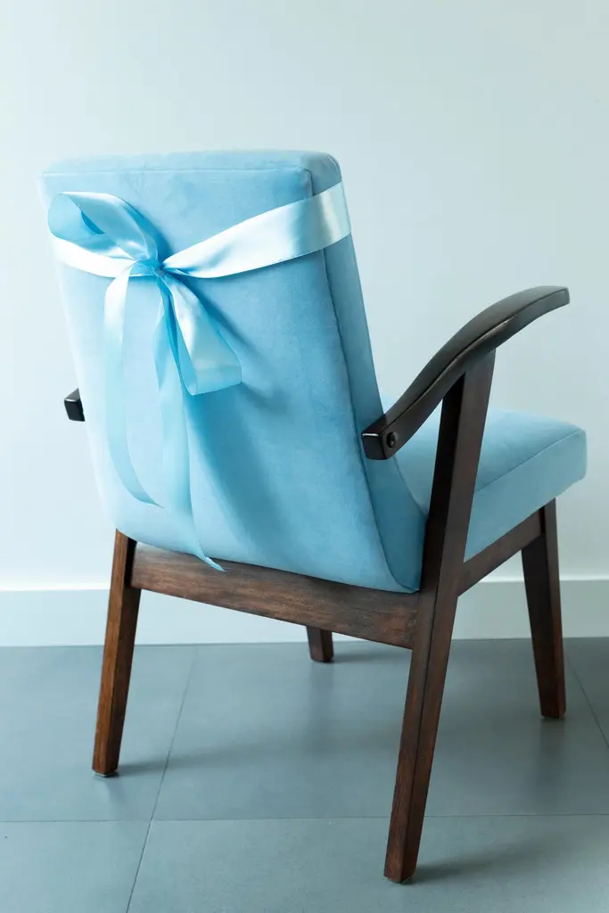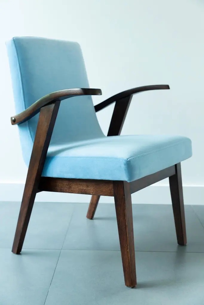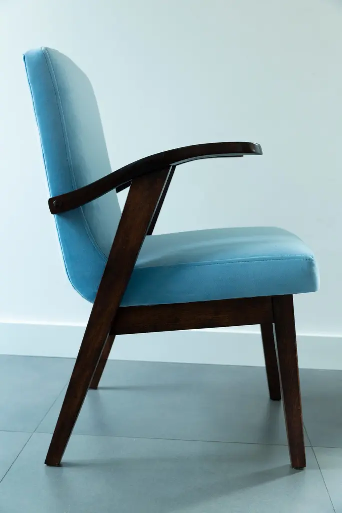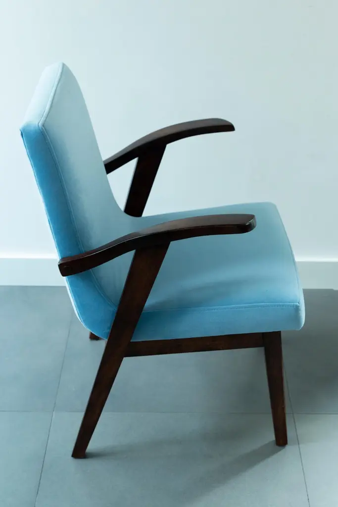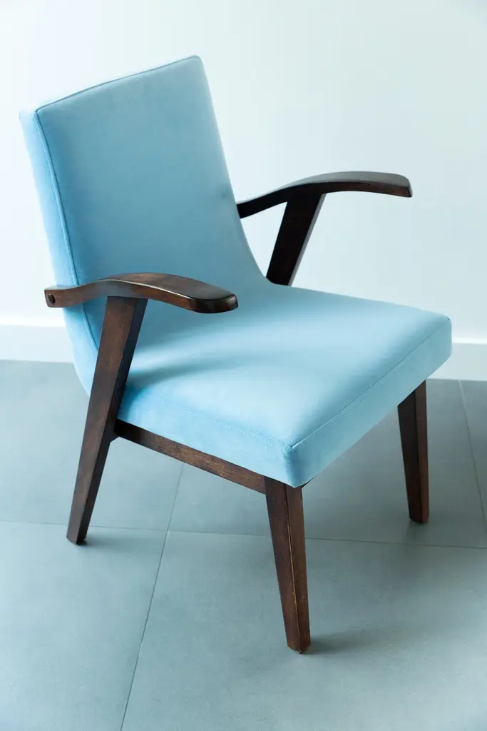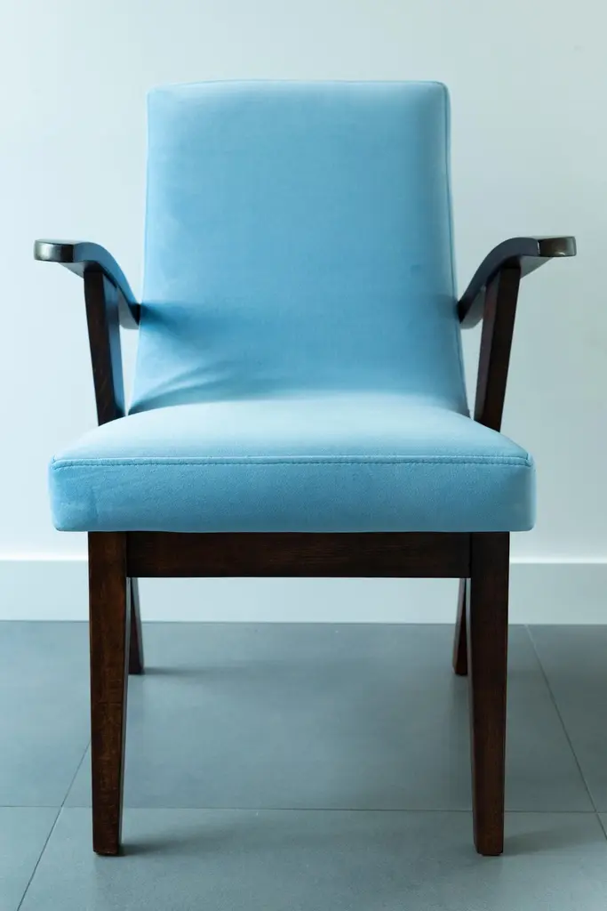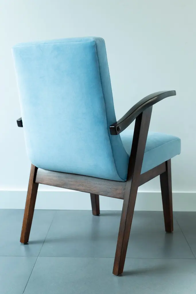 Armchair designed by Mieczyslaw Puchala. Dark brown wood combined with a baby blue beautiful velvet gives it elegance and nobility. The chair has undergone a full carpentry and upholstery renovation. The wood is in excellent condition after full renovation, finished with semi-matte varnish. Produced in the 1960s in Poland. We can prepare set of 2, 4, 8 or more also in another wood and velvet color. Please check the last picture with velvet color samples.