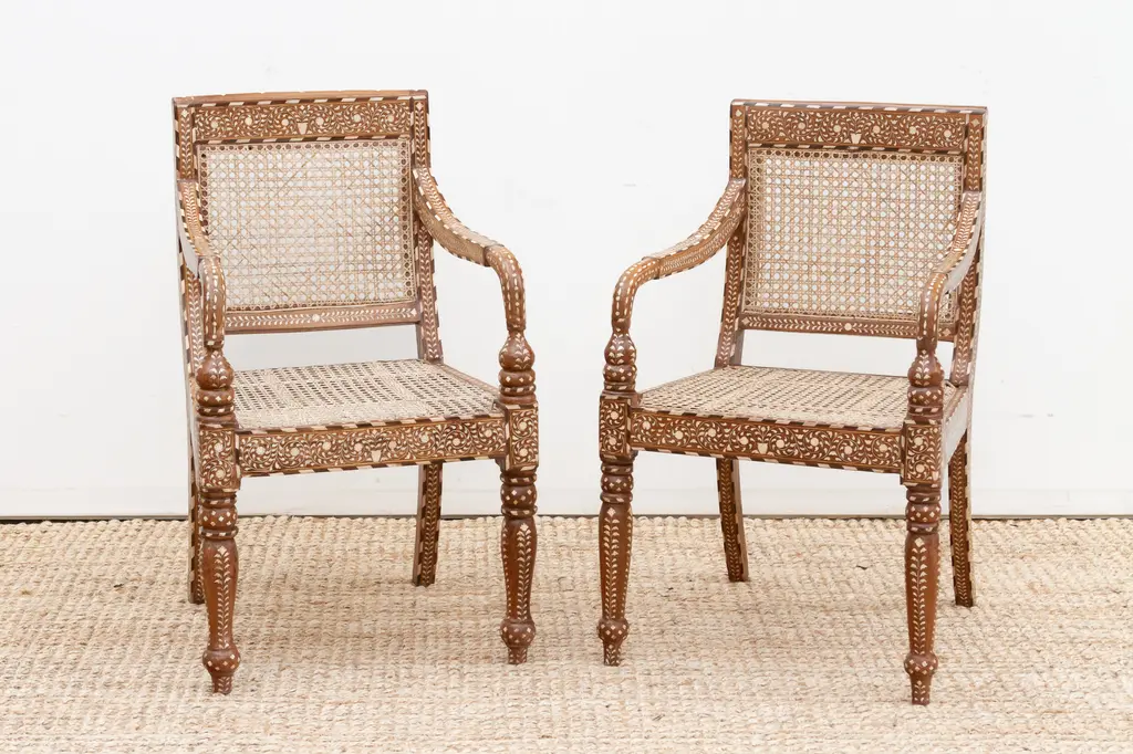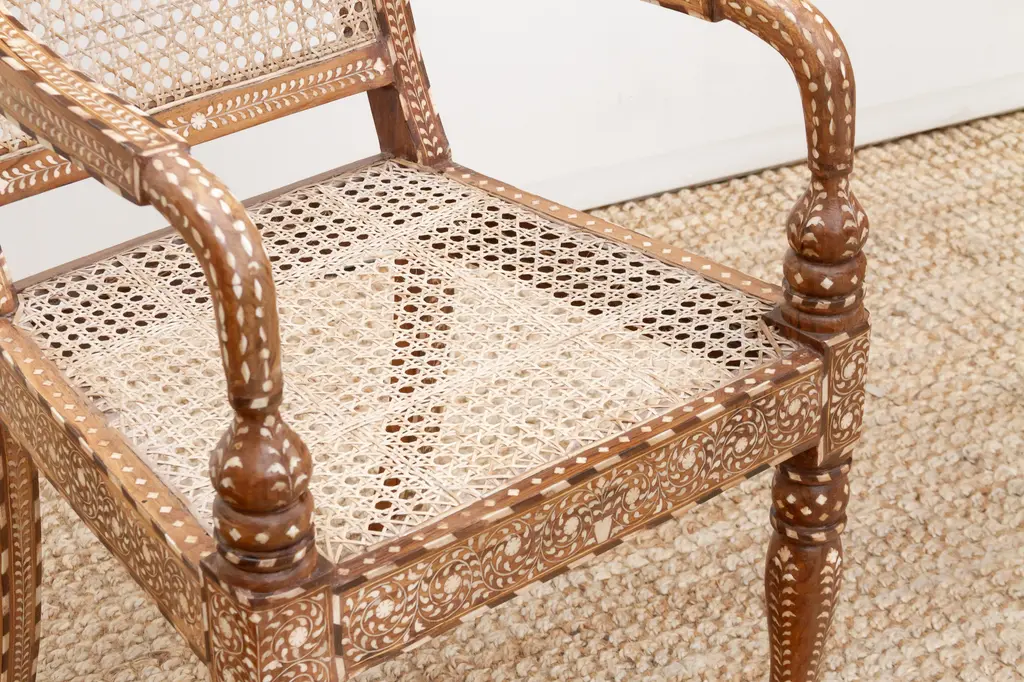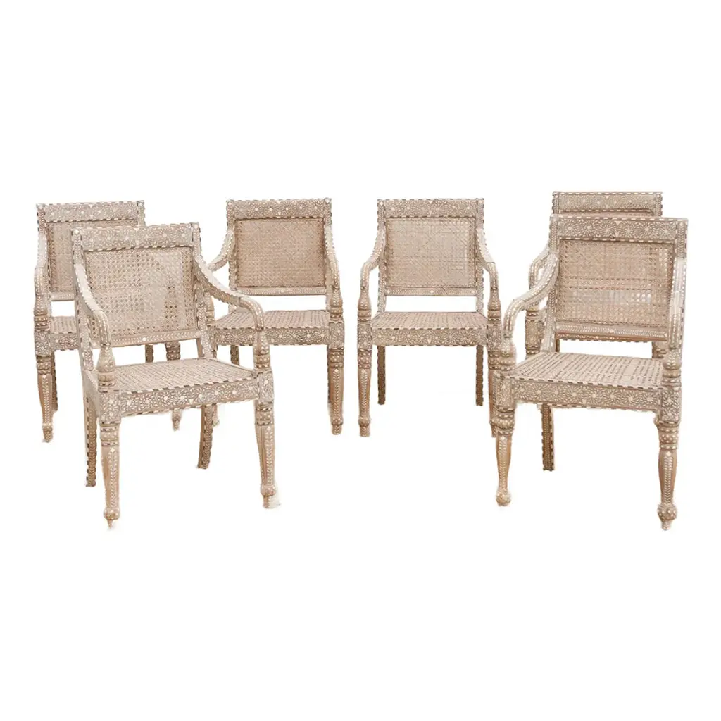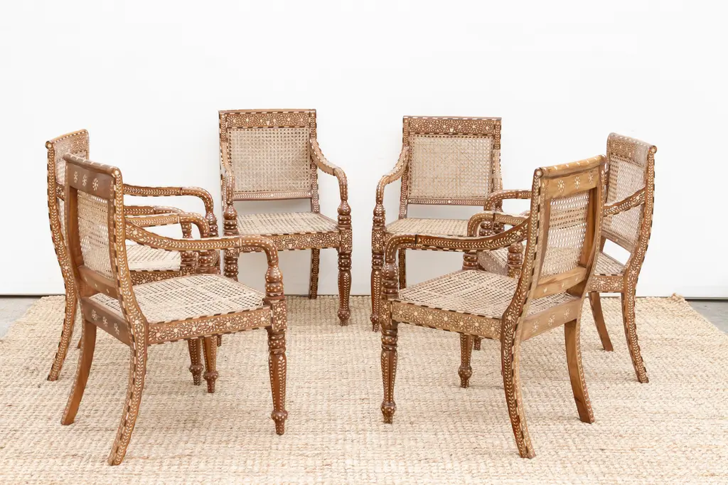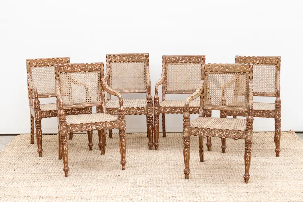 Bring refined elegance and historical charm to your space with this set of six inlaid armchairs. Featuring breathable cane seats and intricately detailed wood frames, these chairs blend British Colonial design with skilled craftsmanship. Hand-cut inlay patterns, curved arms, and turned legs highlight their artistry, making them a timeless statement of luxury, heritage, and style.