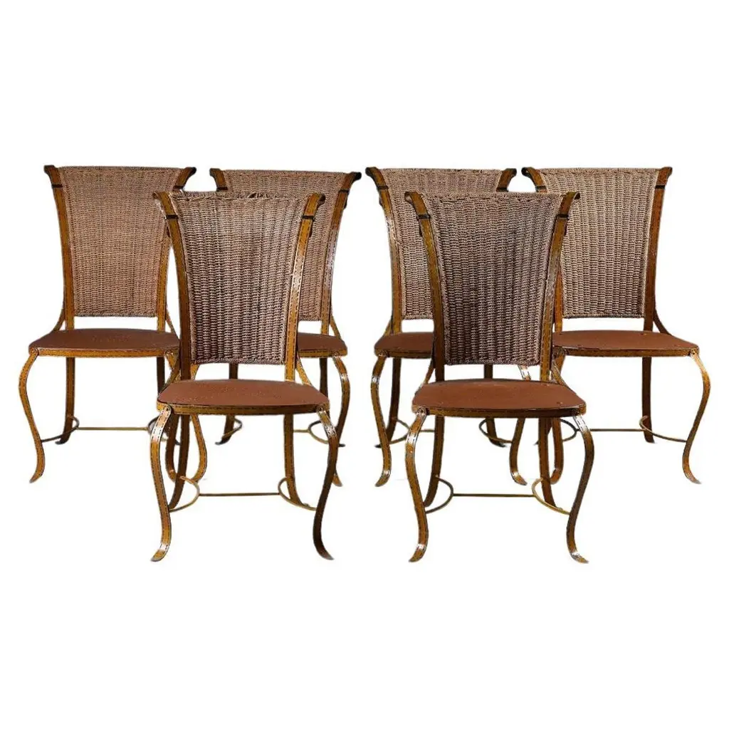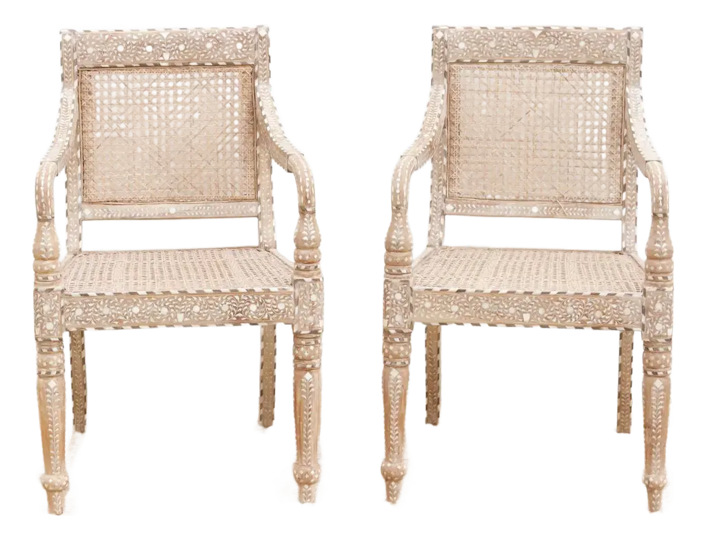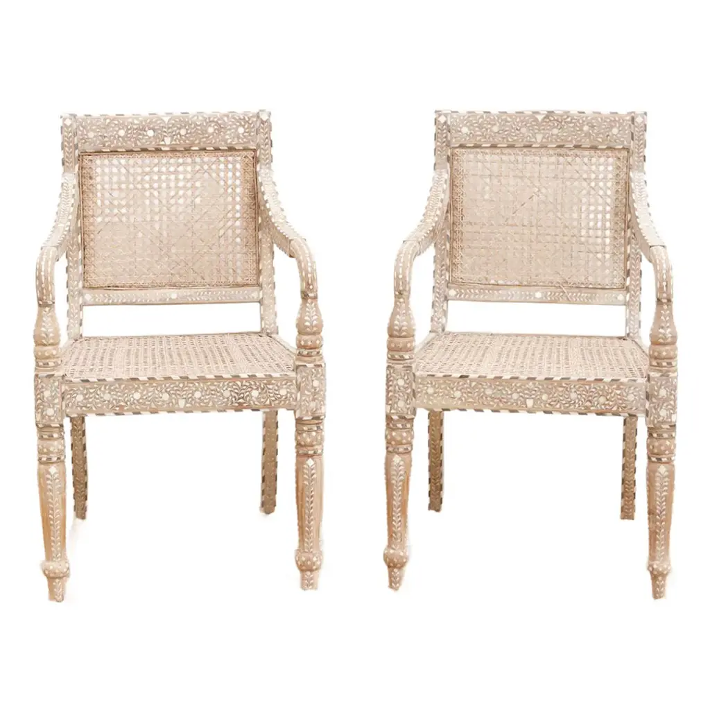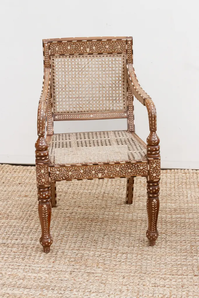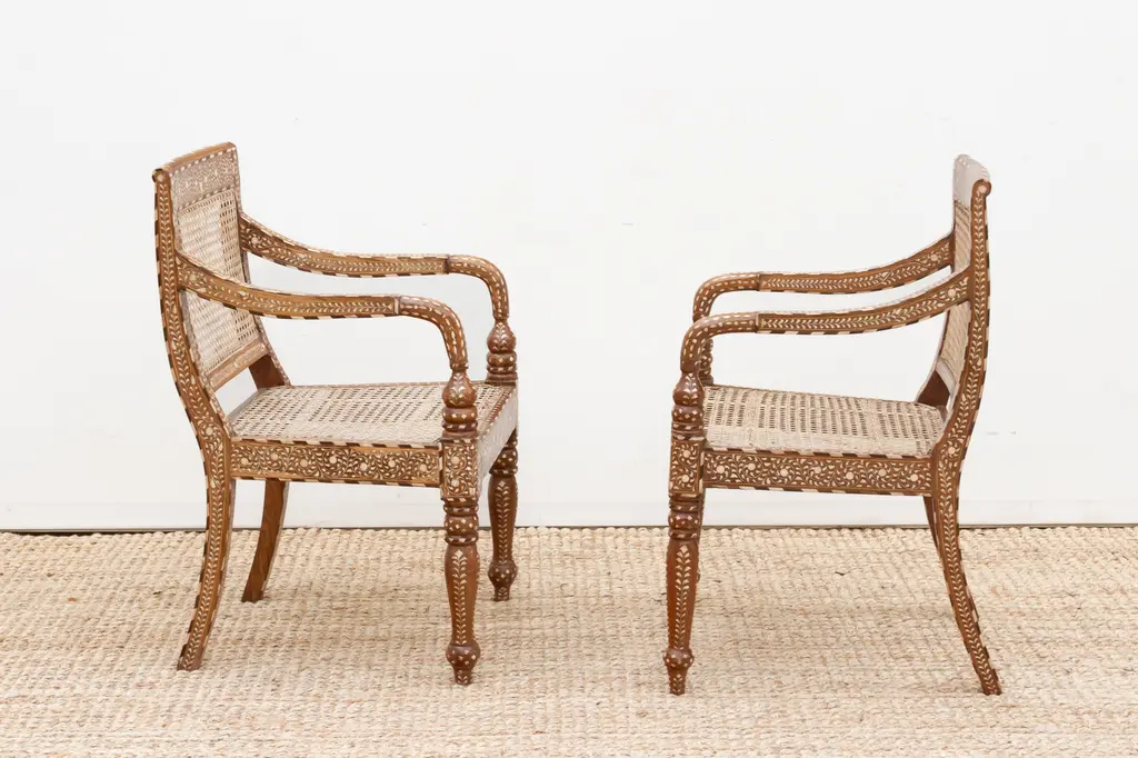 Bring refined elegance and historical charm to your space with this set of six inlaid armchairs. Featuring breathable cane seats and intricately detailed wood frames, these chairs blend British Colonial design with skilled craftsmanship. Hand-cut inlay patterns, curved arms, and turned legs highlight their artistry, making them a timeless statement of luxury, heritage, and style.