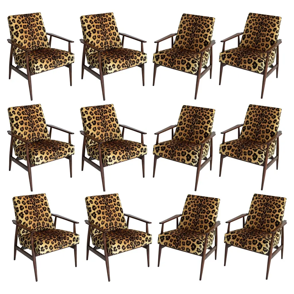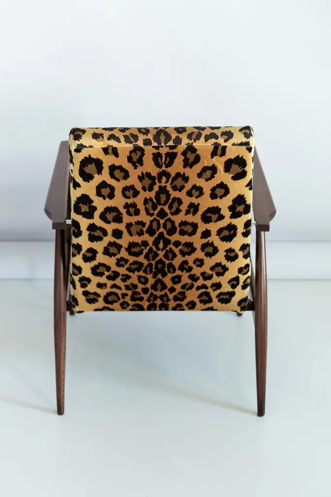 Set of six beautiful, restored armchairs designed by Henryk Lis. Furniture after full carpentry and upholstery renovation. The fabric, which is covered with a backrest and a seat, is a high-quality Italian velvet upholstery printed in leopard pattern. The armchairs will be perfect in Minimalist spaces, both private and public. We can prepare this armchairs in different color of fabric and wood.