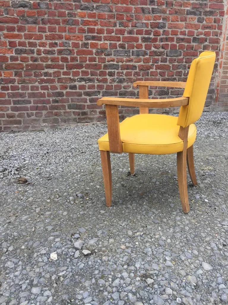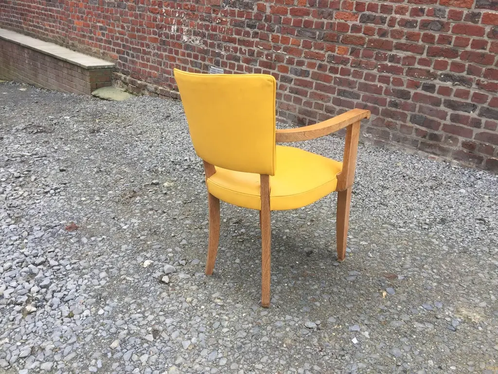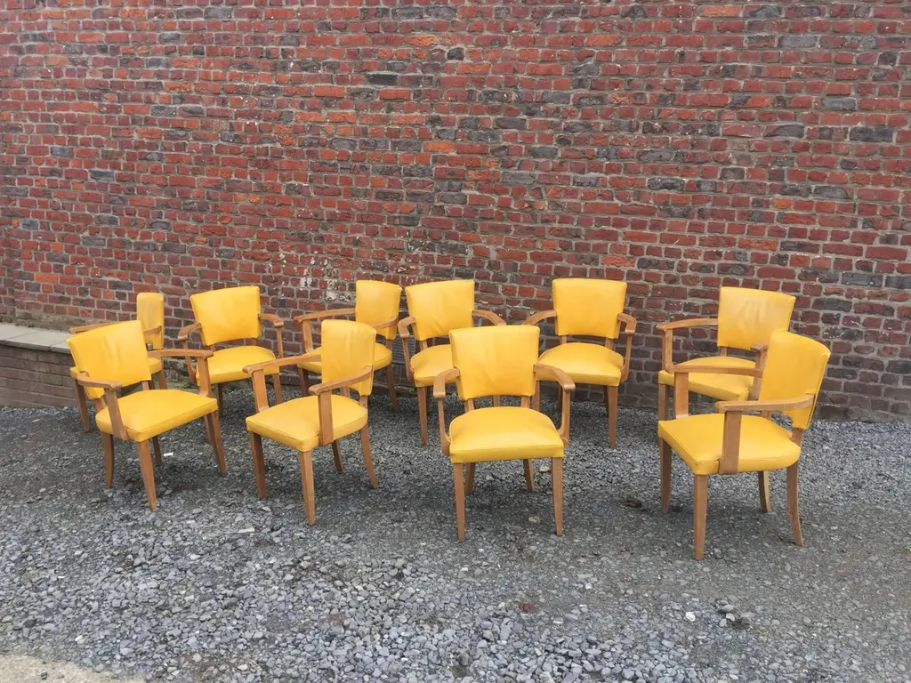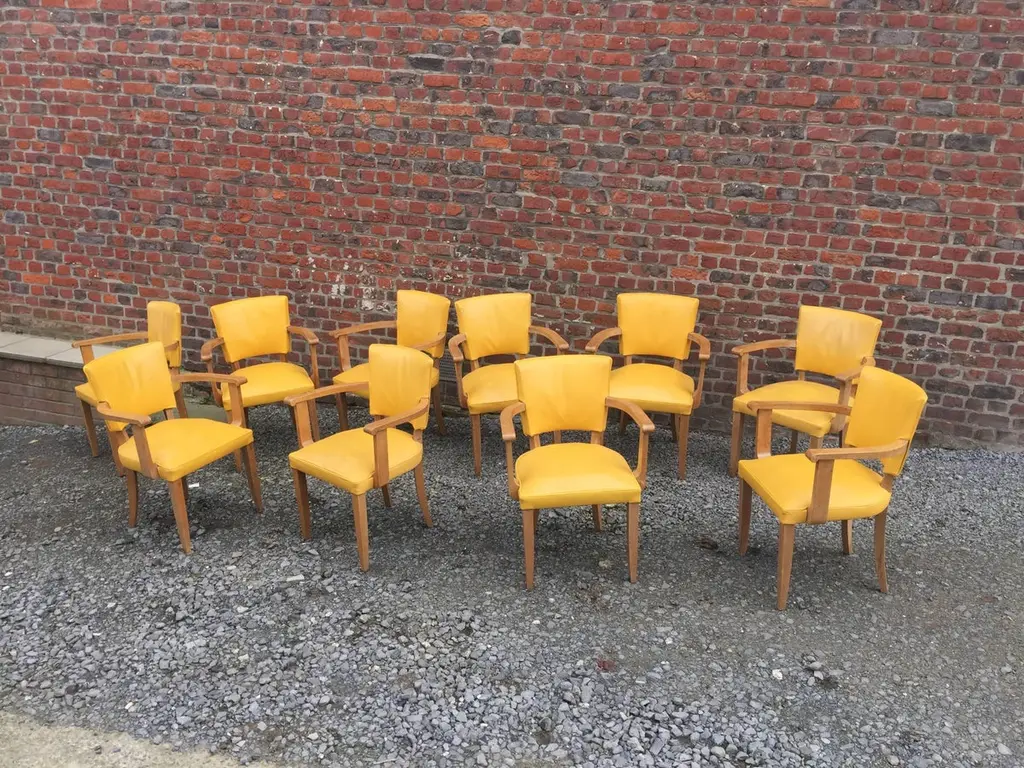 Set of ten Art Deco armchairs in oak and leather, circa 1940.