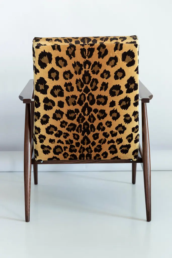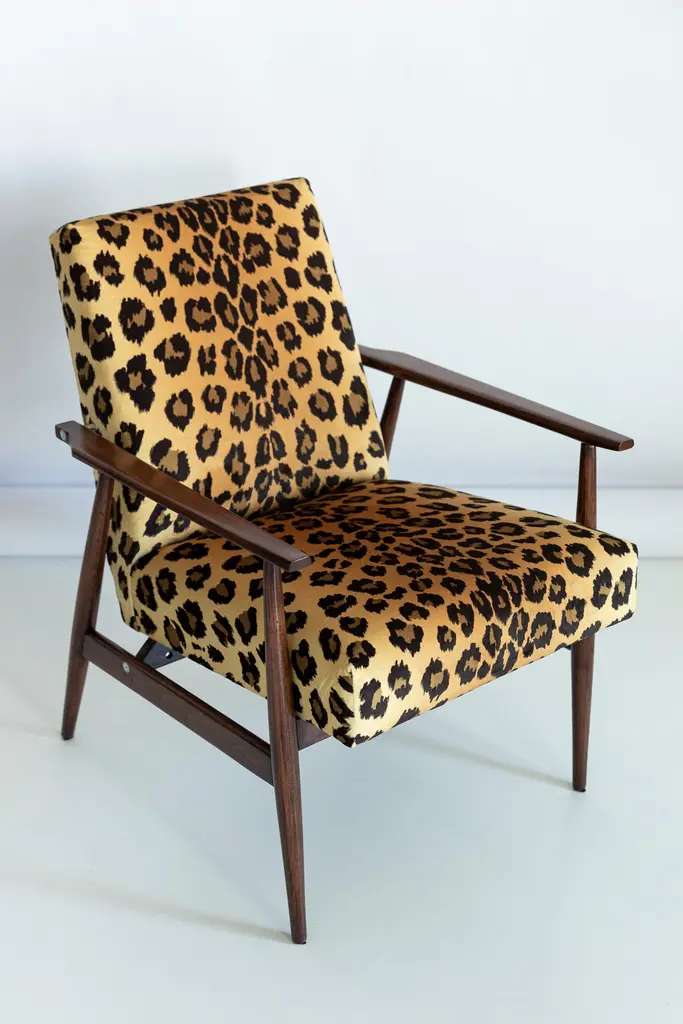 Set of twelve beautiful, restored armchairs designed by Henryk Lis. Furniture after full carpentry and upholstery renovation. The fabric, which is covered with a backrest and a seat, is a high-quality Italian velvet upholstery printed in leopard pattern. The armchairs will be perfect in Minimalist spaces, both private and public. We can prepare this armchairs in different color of fabric and wood. Check the last picture with velvet print samples.