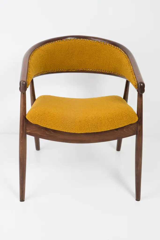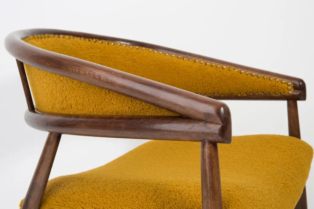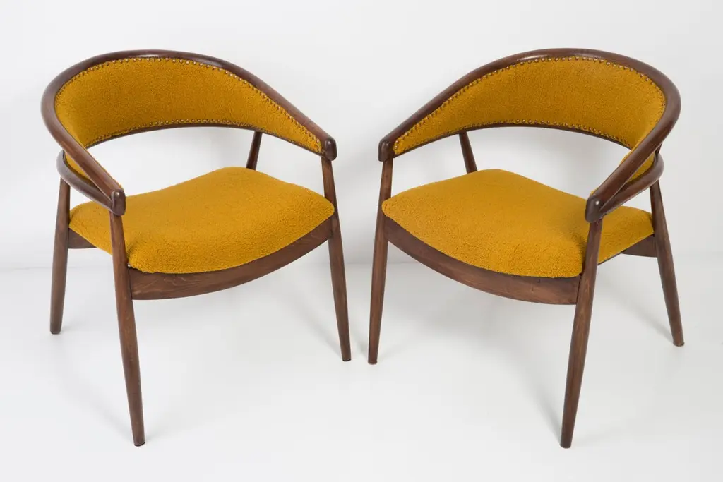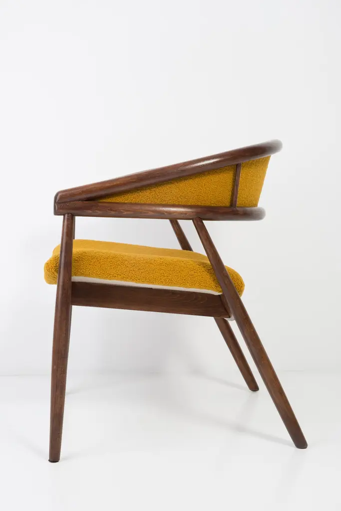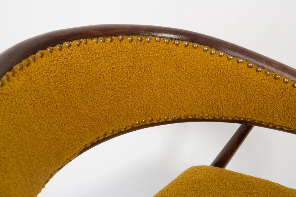 James Mont (1904-1978) "King Cole" armchairs, circa 1955. They are super-comfortable armchairs made in the 1960s. The armchairs made of bentwood. Very unique, comfortable and beautiful. Perfect for Minimalist interiors. The armchairs are after carpentry and upholstery renovation. The fabric used is an italian Yellow Ochra Boucle. We can prepare this set also in another boucle color.