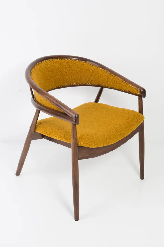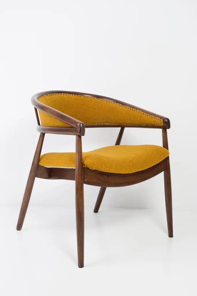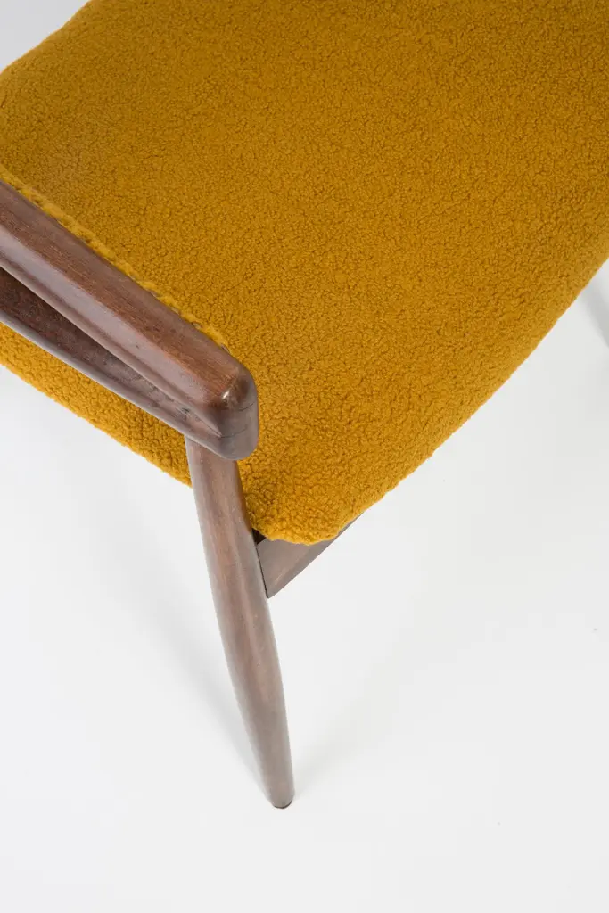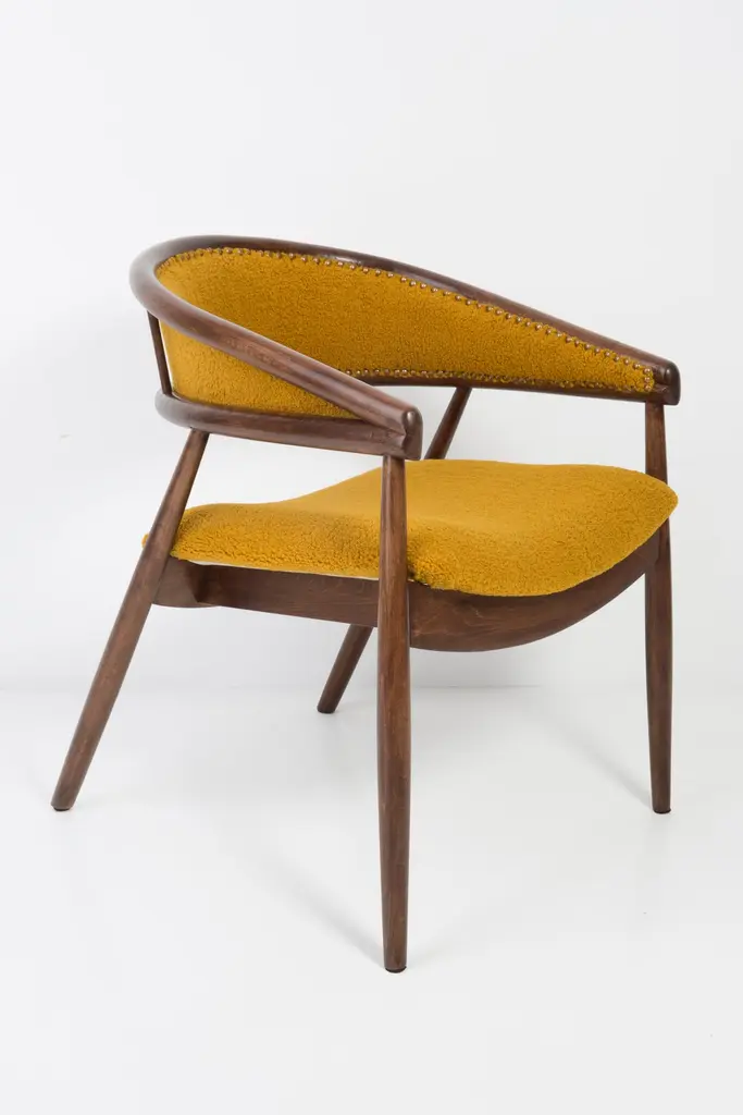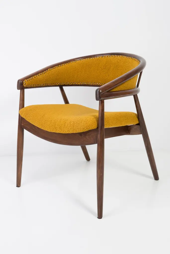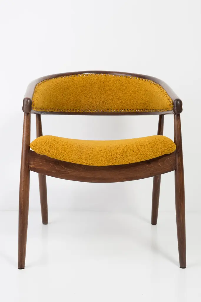 James Mont (1904-1978) "King Cole" armchairs, circa 1955. They are super-comfortable armchairs made in the 1960s. The armchairs made of bentwood. Very unique, comfortable and beautiful. Perfect for Minimalist interiors. The armchairs are after carpentry and upholstery renovation. The fabric used is an italian Yellow Ochra Boucle. We can prepare this set also in another boucle color.