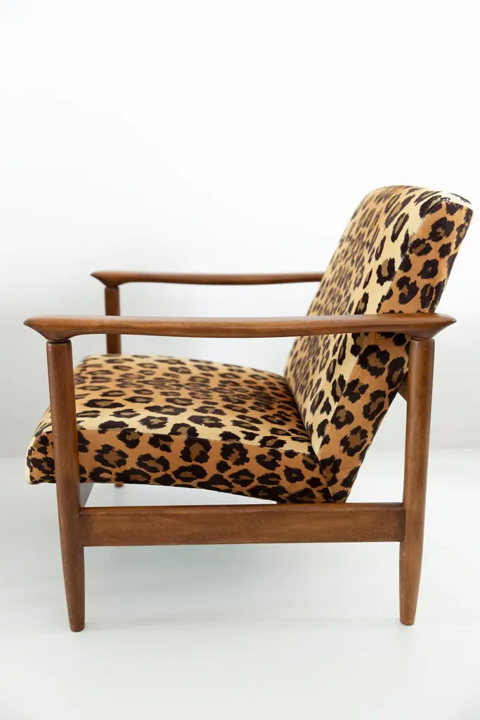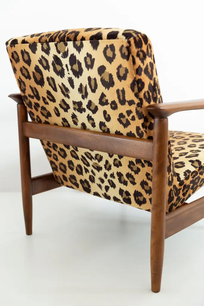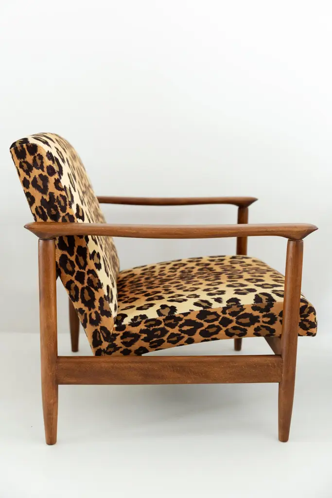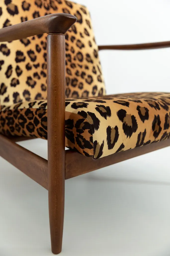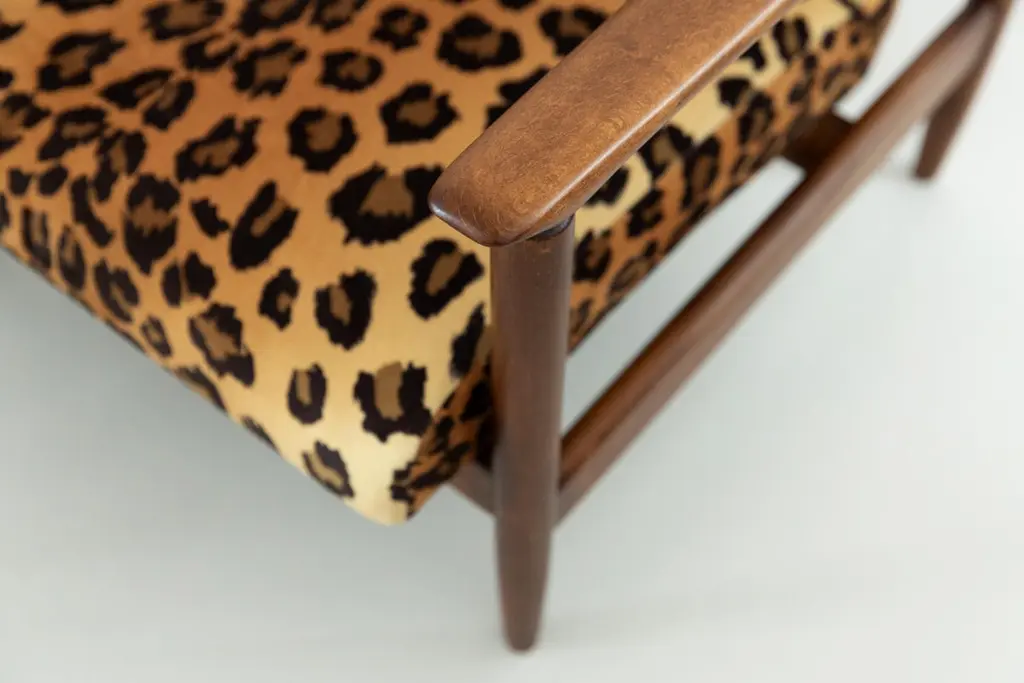 A pair of armchairs GFM-142, designed by Edmund Homa. The armchairs were made in the 1960s in the Gosciecinska furniture factory. They are made from solid beech wood. The GFM-142 armchair is regarded one of the best polish armchair design from the previous age. The armchairs have been thoroughly renovated. The tension belts have been changed, new upholstery foams, leopard velvet upholstery it's Italian fabric of the highest quality. We can prepare this set also in another animal print velvet.