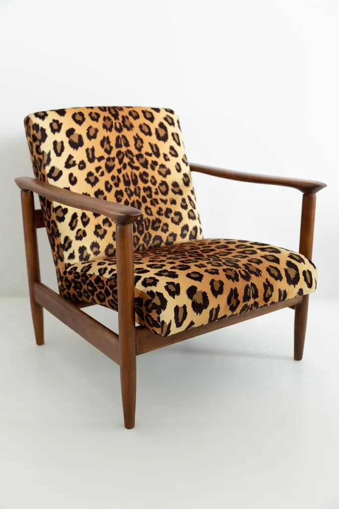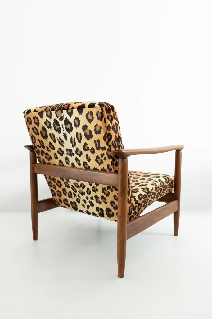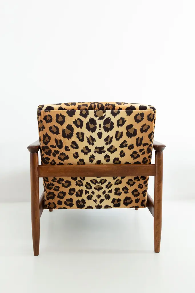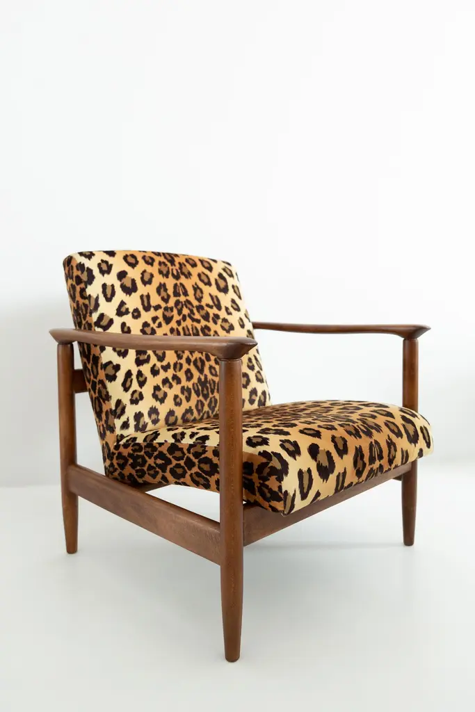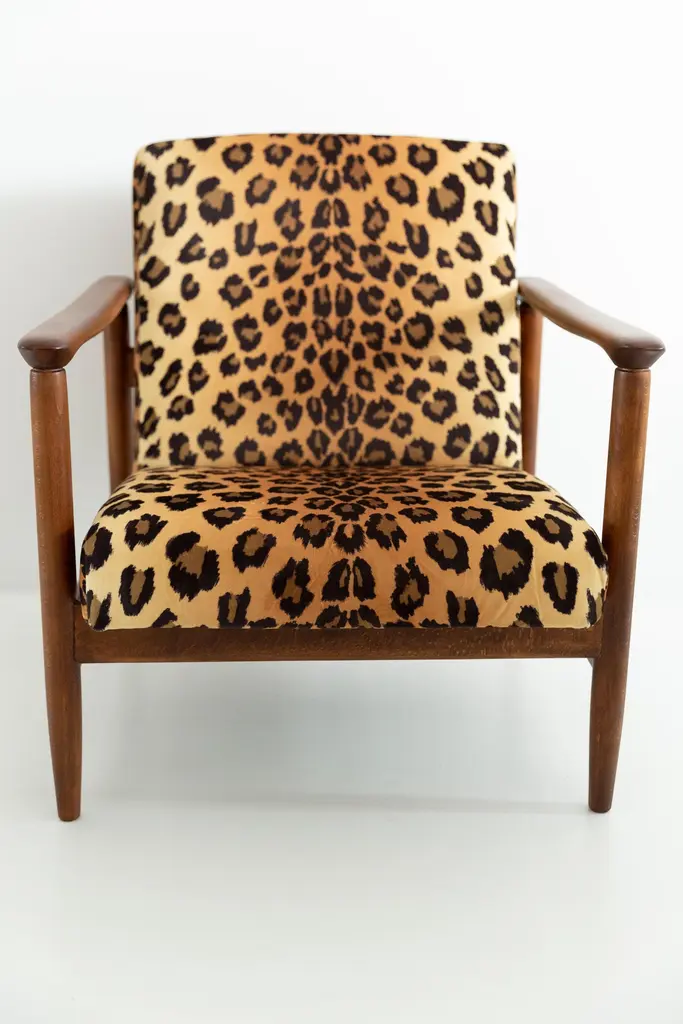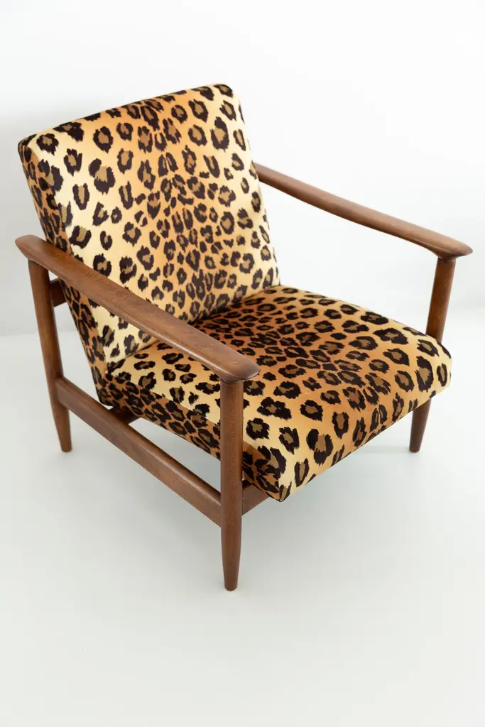 A pair of armchairs GFM-142, designed by Edmund Homa. The armchairs were made in the 1960s in the Gosciecinska furniture factory. They are made from solid beech wood. The GFM-142 armchair is regarded one of the best polish armchair design from the previous age. The armchairs have been thoroughly renovated. The tension belts have been changed, new upholstery foams, leopard velvet upholstery it's Italian fabric of the highest quality. We can prepare this set also in another animal print velvet.