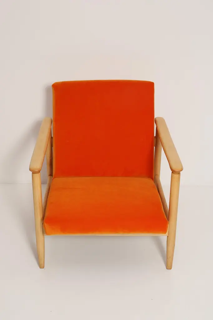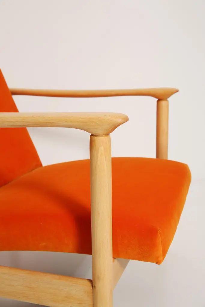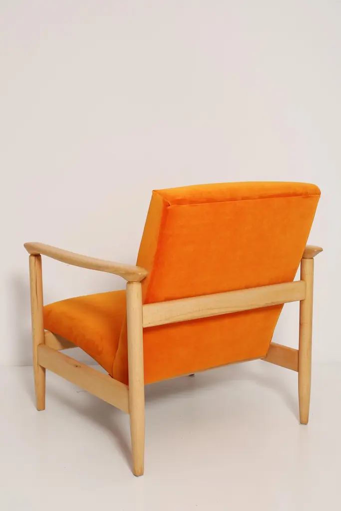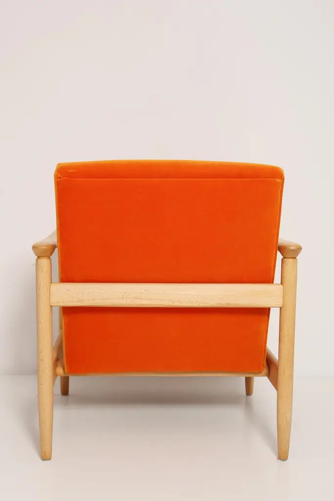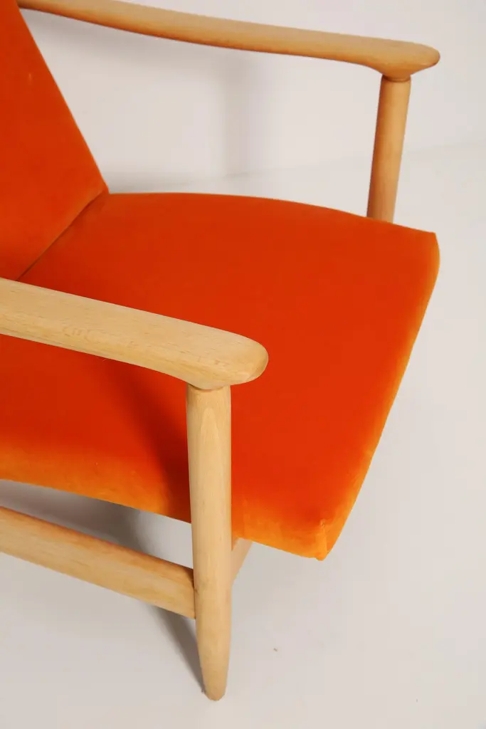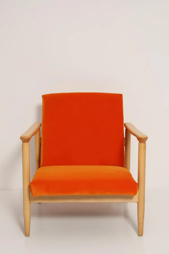 Beautiful bright orange velvet Armchairs GFM-142, designed by Edmund Homa, a polish architect, designer of Industrial Design and interior architecture, professor at the Academy of Fine Arts in Gdansk. The armchairs was made in the 1960s in the Gosciecinska furniture factory from solid beech wood. The GFM-142 armchair is regarded one of the best polish armchair design from the previous age.The armchairs has been thoroughly renovated. The tension belts have been changed, new upholstery foams, leopard velvet upholstery it's Italian velvet of the highest quality. Extremely comfortable model! We can prepare this set also in a set with foot stool. You can choose other wood and velvet color. Please check the last picture with velvet color samples and ask for more informations.