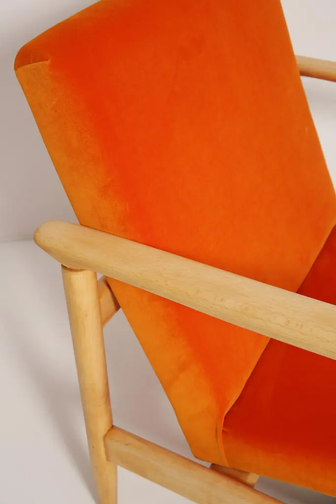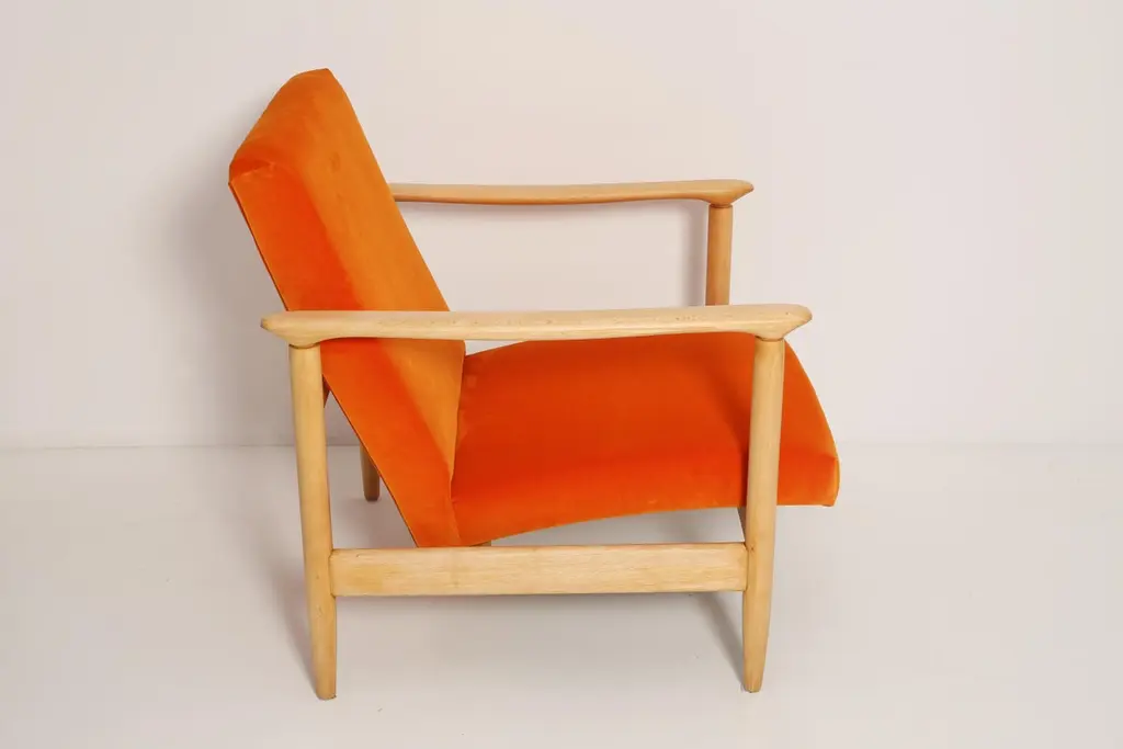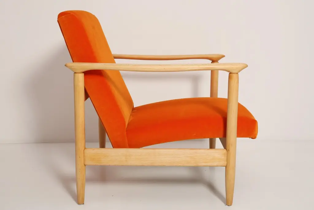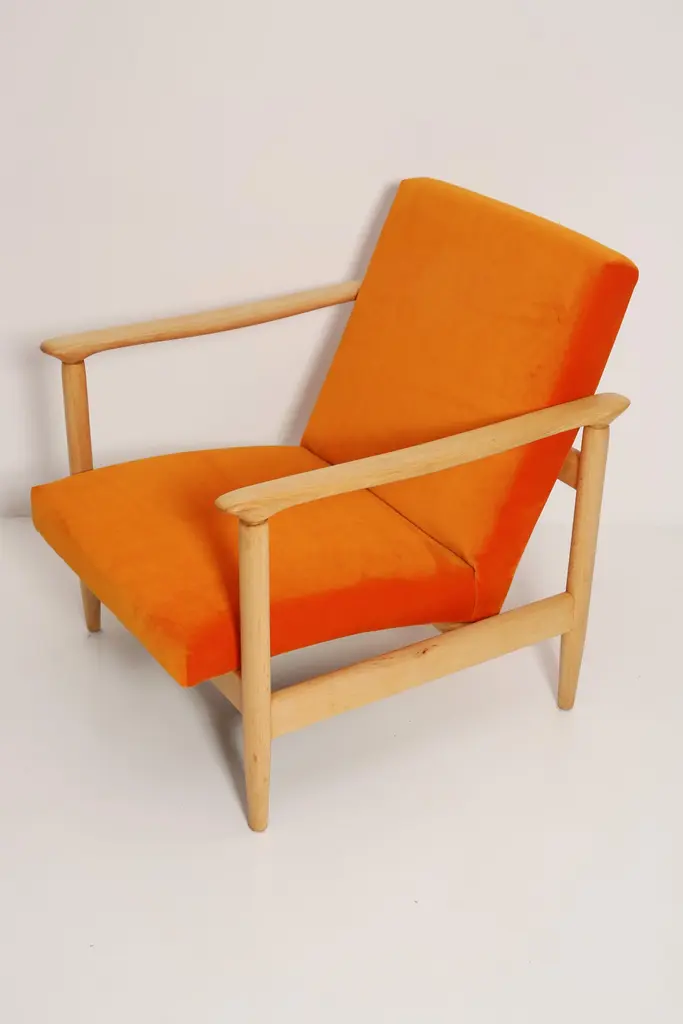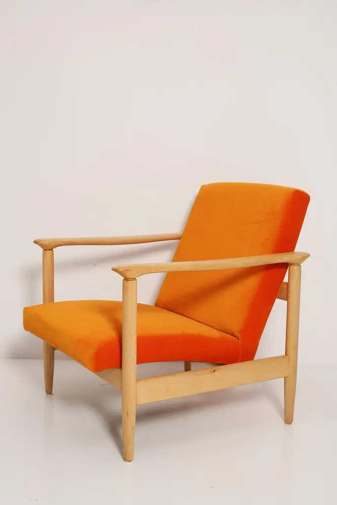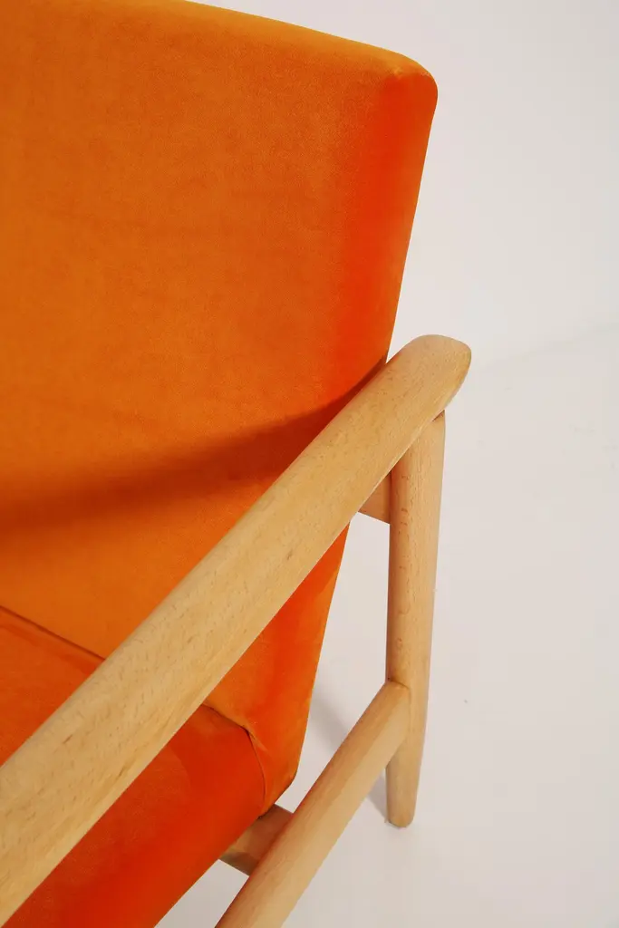 Beautiful bright orange velvet Armchairs GFM-142, designed by Edmund Homa, a polish architect, designer of Industrial Design and interior architecture, professor at the Academy of Fine Arts in Gdansk. The armchairs was made in the 1960s in the Gosciecinska furniture factory from solid beech wood. The GFM-142 armchair is regarded one of the best polish armchair design from the previous age.The armchairs has been thoroughly renovated. The tension belts have been changed, new upholstery foams, leopard velvet upholstery it's Italian velvet of the highest quality. Extremely comfortable model! We can prepare this set also in a set with foot stool. You can choose other wood and velvet color. Please check the last picture with velvet color samples and ask for more informations.
