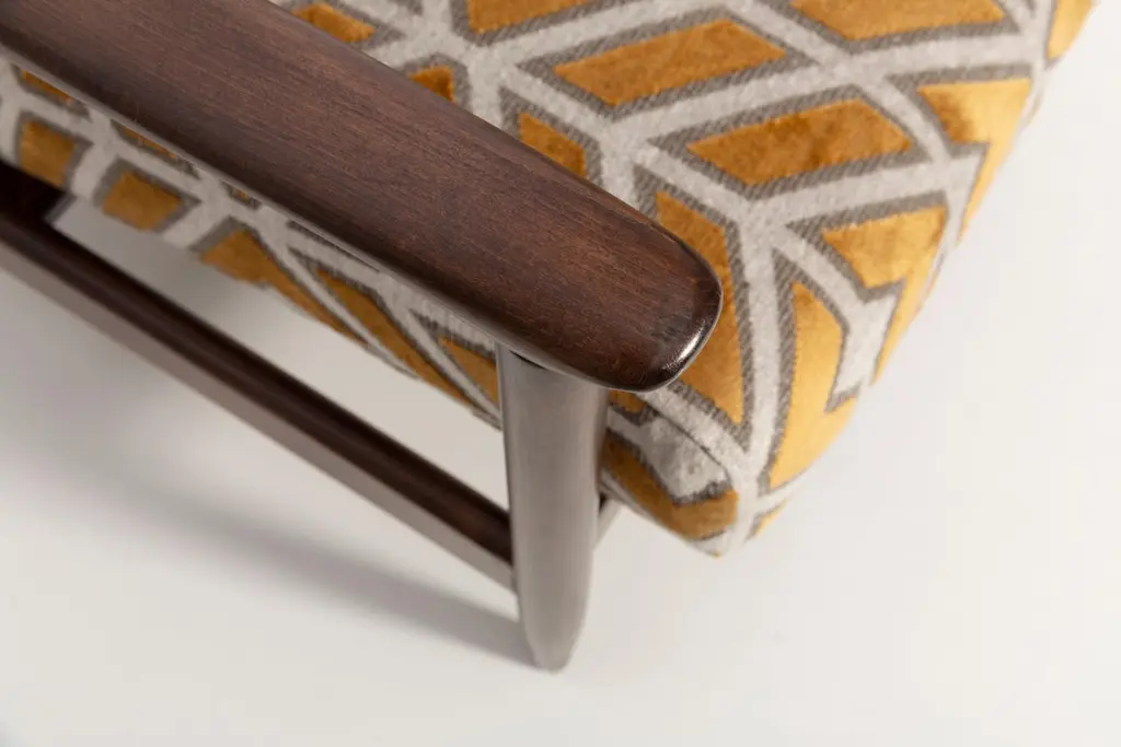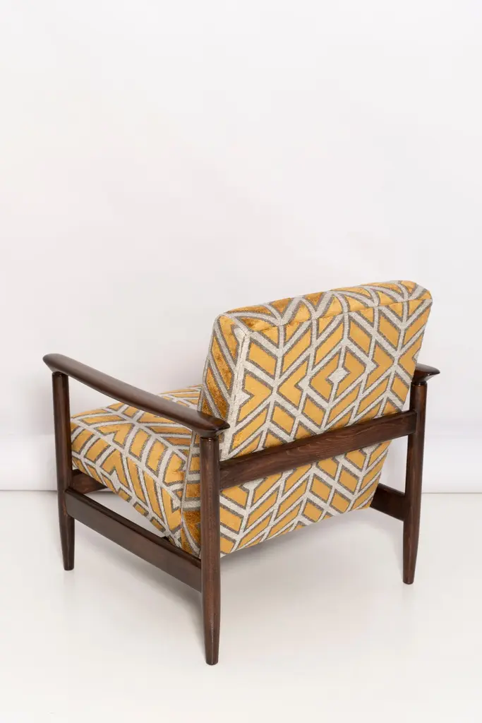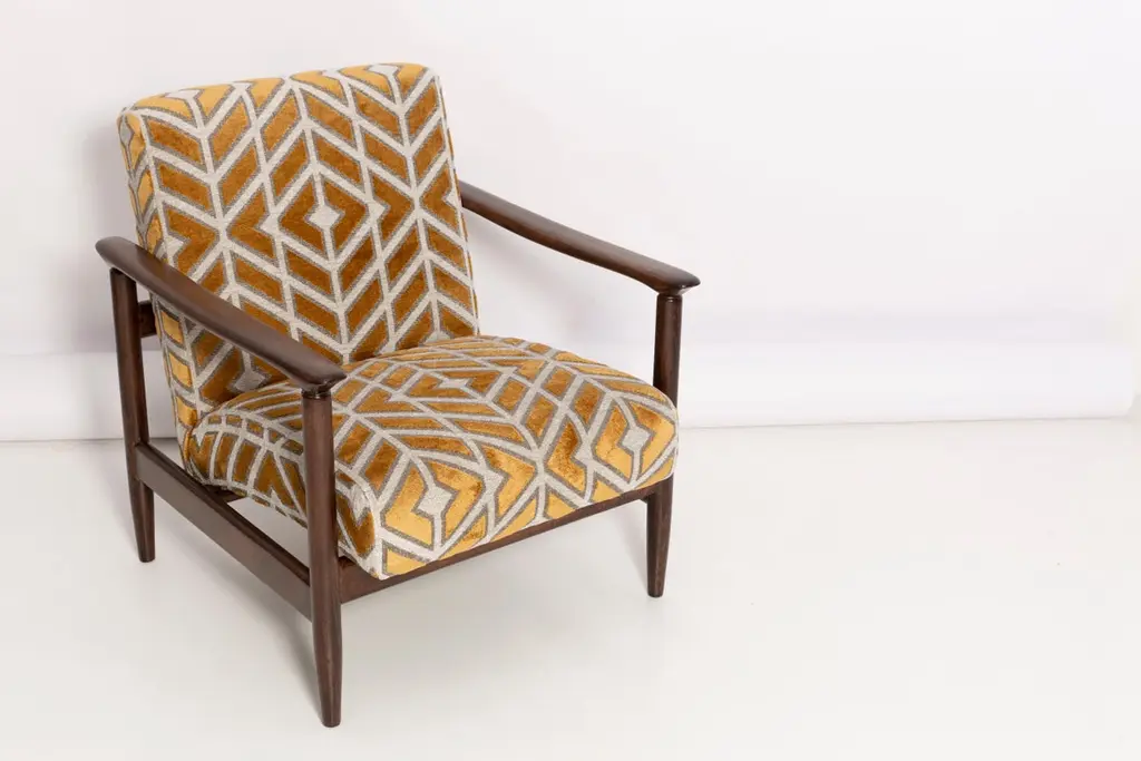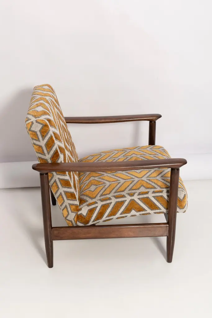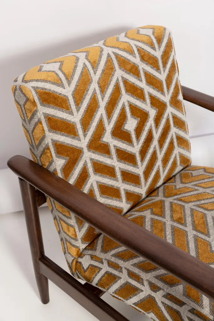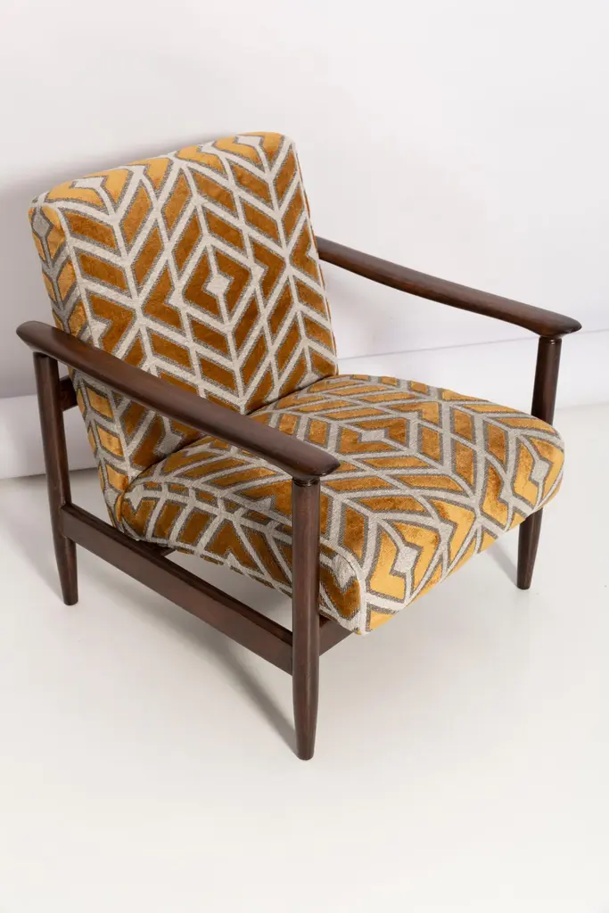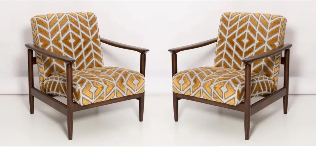 A pair of mid century armchairs GFM-142, designed by Edmund Homa. The armchairs were made in the 1960s in the Gosciecinska Furniture Factory. They are made from solid beech wood. The GFM-142 armchair is regarded one of the best Polish armchair design from the previous age. The armchairs have been thoroughly renovated. The tension belts have been changed, new upholstery foams - upholstery fabric of the highest quality - spanish guell lamadrid pattern velvet. We can prepare this set also in another fabric and wood color. Please check the last picture with color samples. Waiting time is 3-5 weeks.