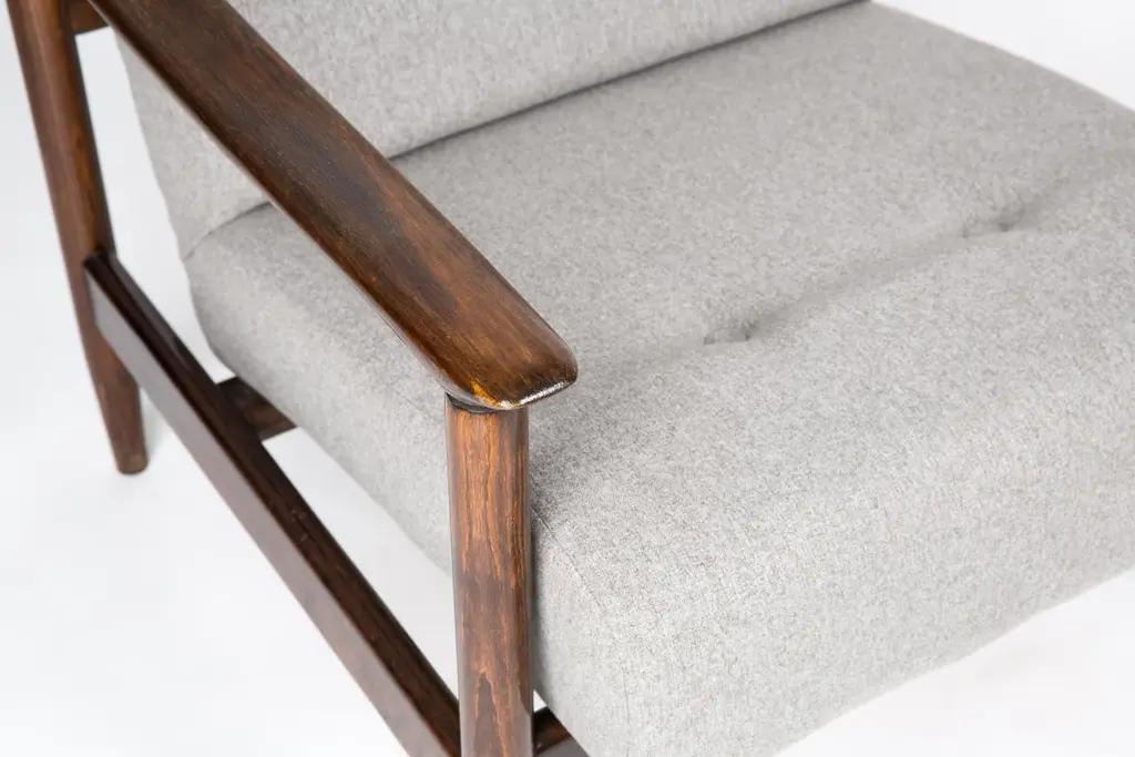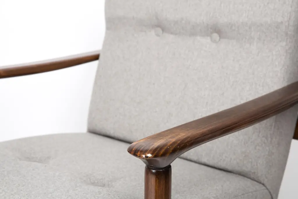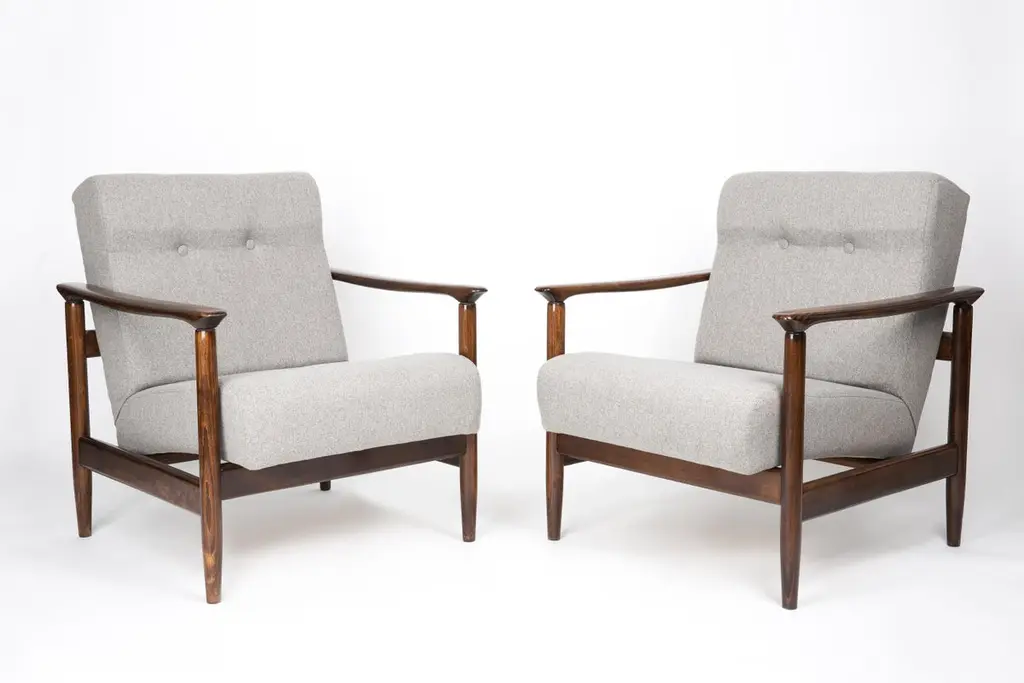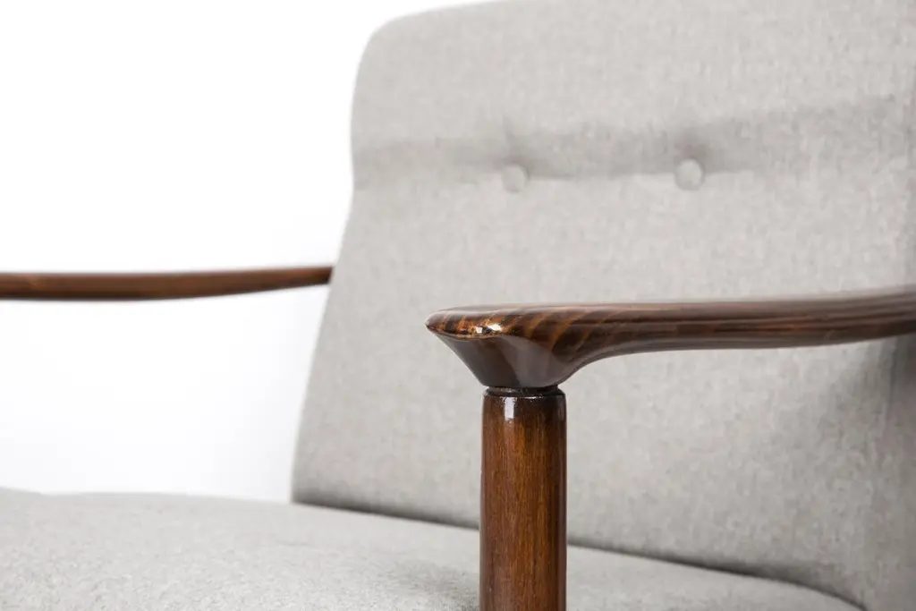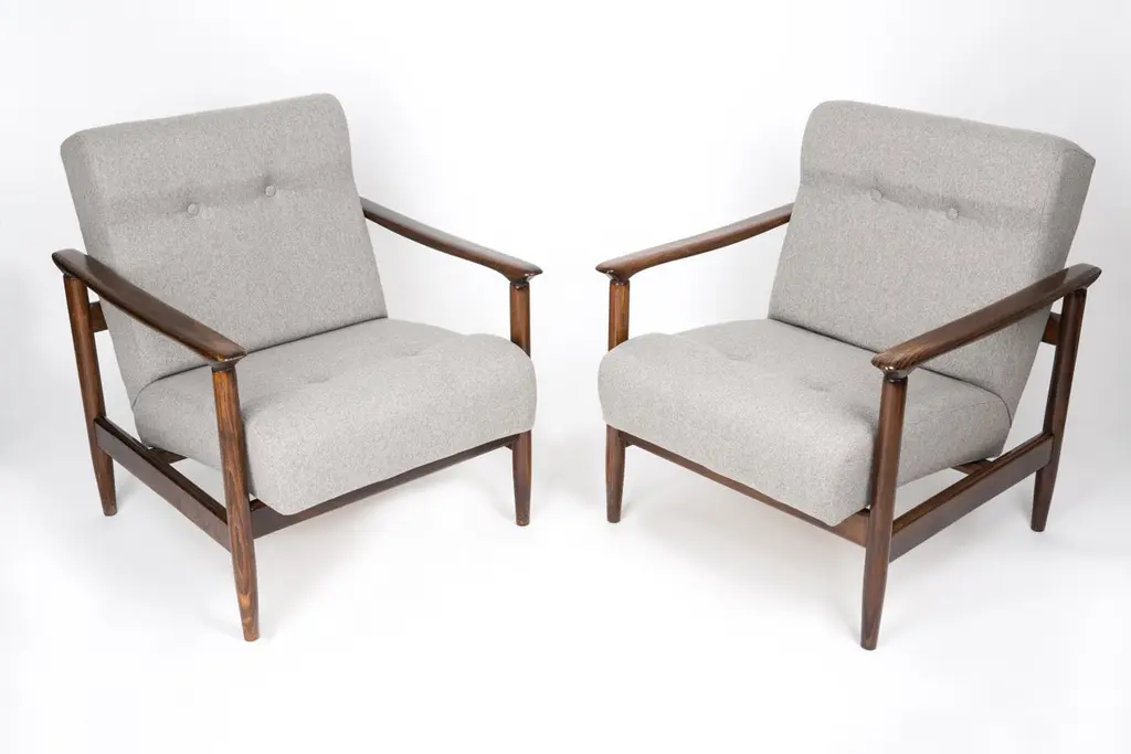 A pair of mid century armchairs GFM-142, designed by Edmund Homa. The armchairs were made in the 1960s in the Gosciecinska Furniture Factory. They are made from solid beech wood. The GFM-142 armchair is regarded one of the best Polish armchair design from the previous age. The armchairs have been thoroughly renovated. The tension belts have been changed, new upholstery foams - upholstery material has been used - beige upholstery fabric of the highest quality. We can prepare this set also in another fabric and wood color. Please check the last picture with color samples. Waiting time is 2-3 weeks.