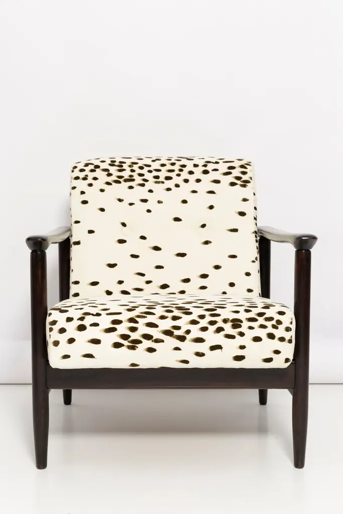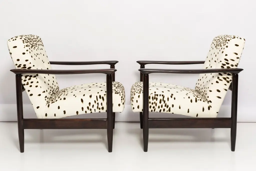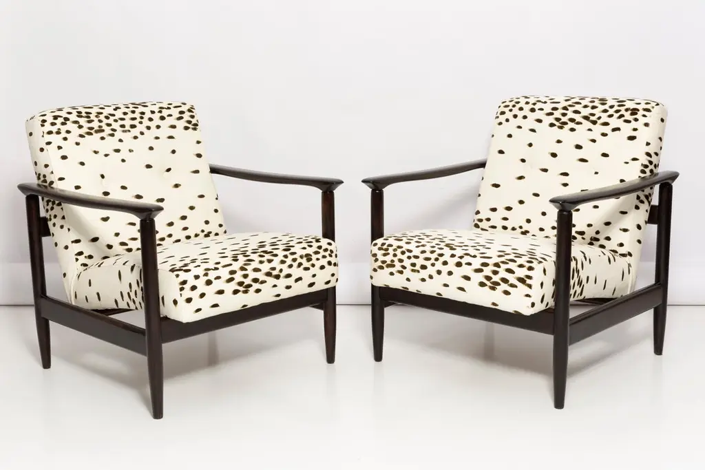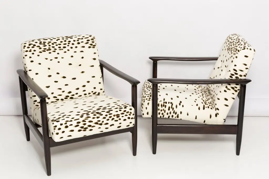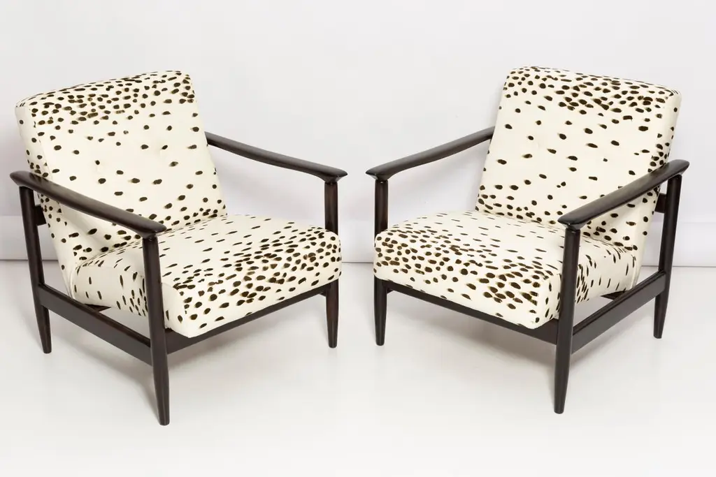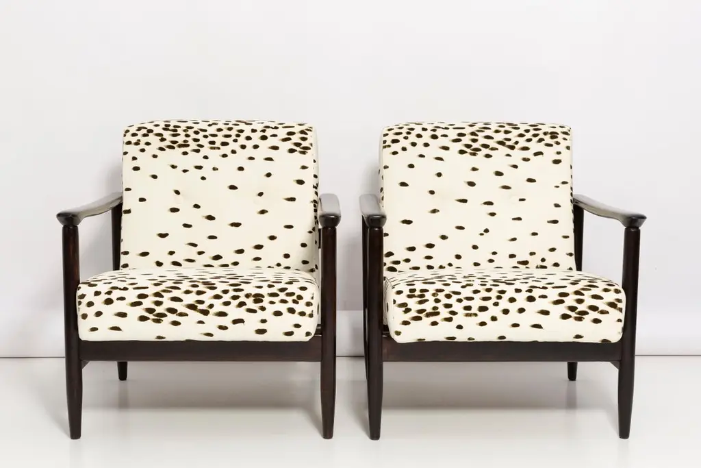 A pair of mid century armchairs GFM-142, designed by Edmund Homa. The armchairs were made in the 1960s in the Gosciecinska Furniture Factory. They are made from solid beech wood. The GFM-142 armchair is regarded one of the best Polish armchair design from the previous age. The armchairs have been thoroughly renovated. The tension belts have been changed, new upholstery foams - upholstery fabric of the highest quality - velvet in dalmatian print.Inspired by the coat of a damaltien, Tottenham Dalmatian velvet features a pea pattern on a plain background. Originally painted with brushstrokes, the design of this textile has dark spots. The set is printed on a velvet for a luxurious result and a pleasant texture to the touch.We can prepare this set also in another fabric and wood color. Please check the last picture with color samples. Waiting time is 3-5 weeks.