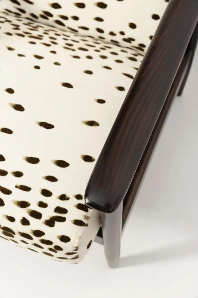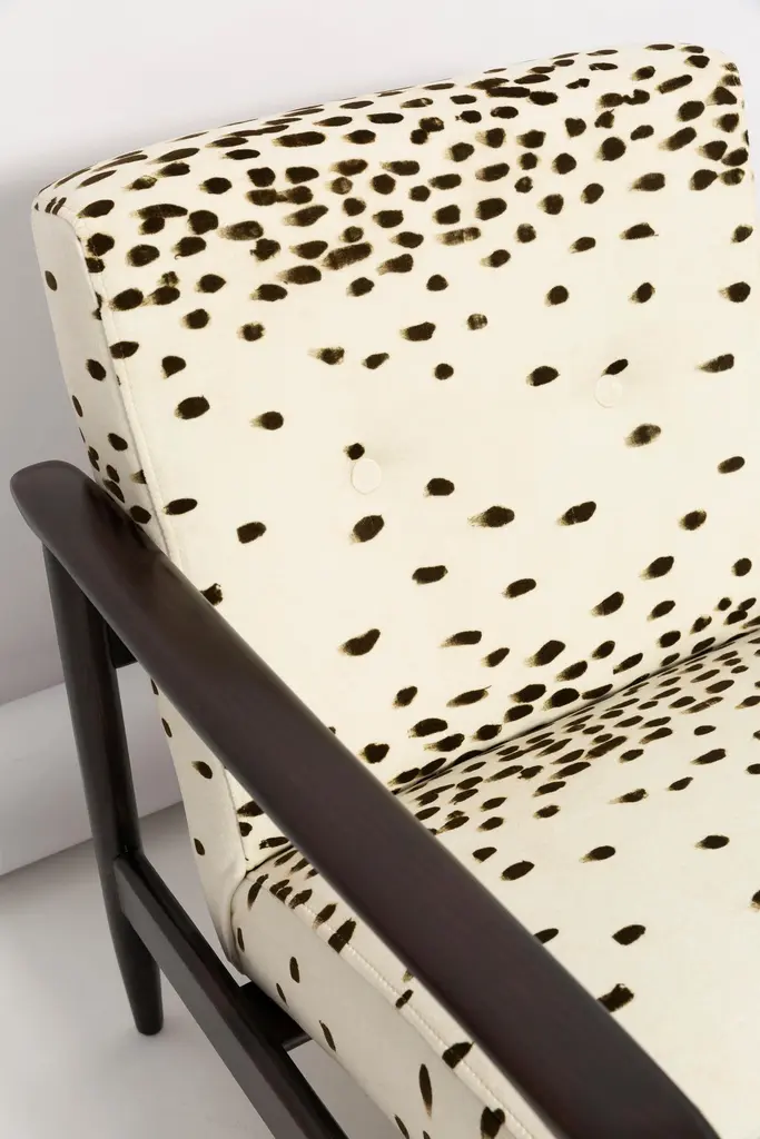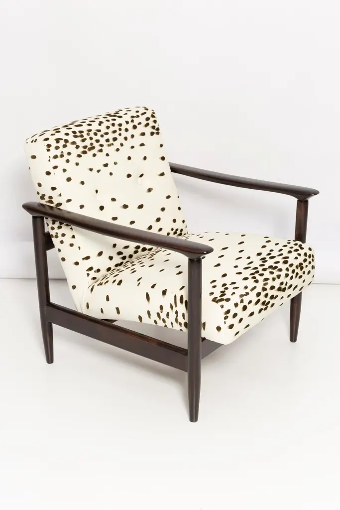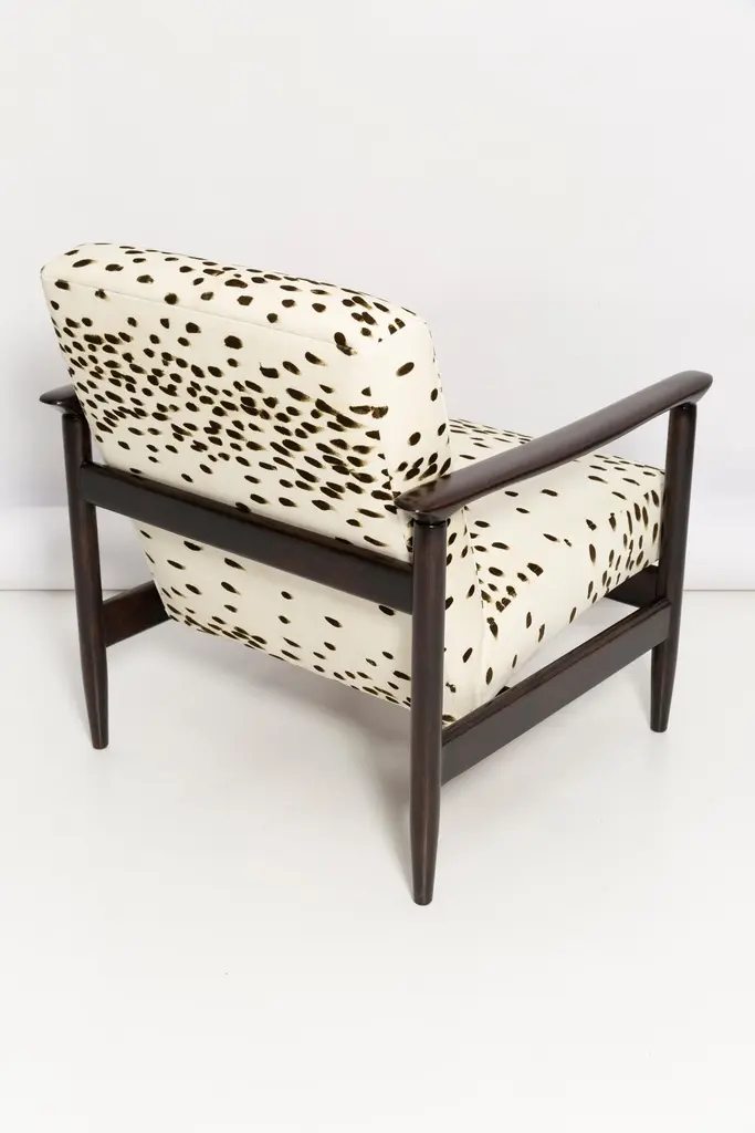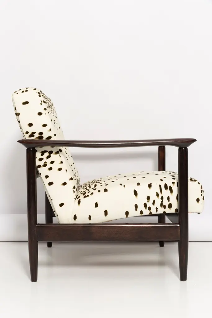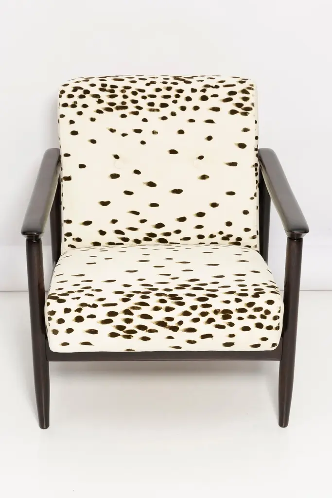 A pair of mid century armchairs GFM-142, designed by Edmund Homa. The armchairs were made in the 1960s in the Gosciecinska Furniture Factory. They are made from solid beech wood. The GFM-142 armchair is regarded one of the best Polish armchair design from the previous age. The armchairs have been thoroughly renovated. The tension belts have been changed, new upholstery foams - upholstery fabric of the highest quality - velvet in dalmatian print.Inspired by the coat of a damaltien, Tottenham Dalmatian velvet features a pea pattern on a plain background. Originally painted with brushstrokes, the design of this textile has dark spots. The set is printed on a velvet for a luxurious result and a pleasant texture to the touch.We can prepare this set also in another fabric and wood color. Please check the last picture with color samples. Waiting time is 3-5 weeks.