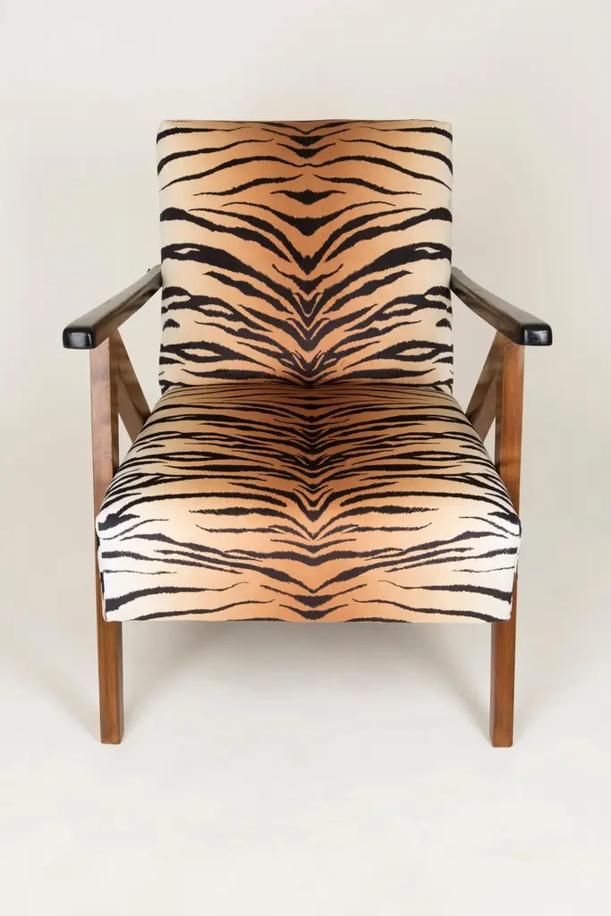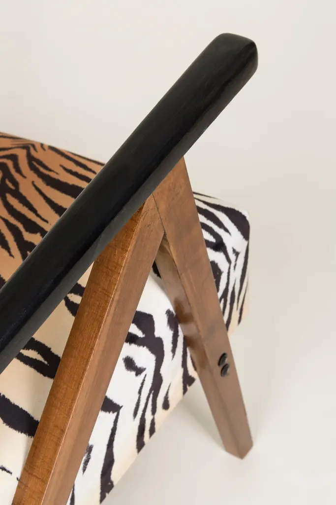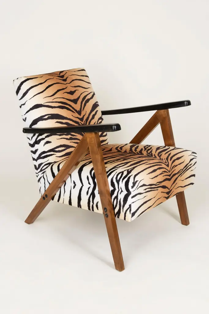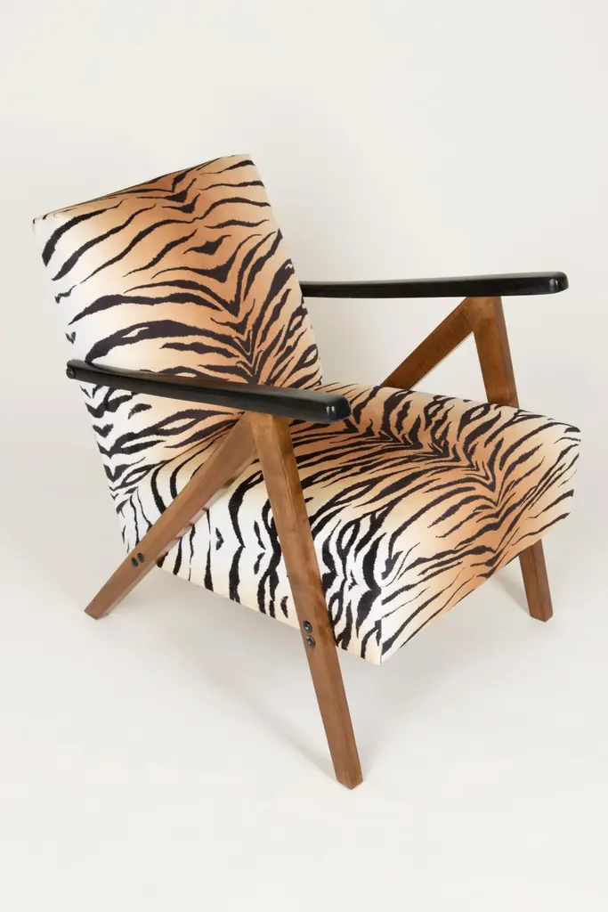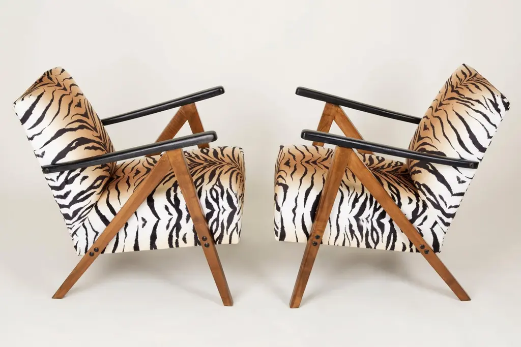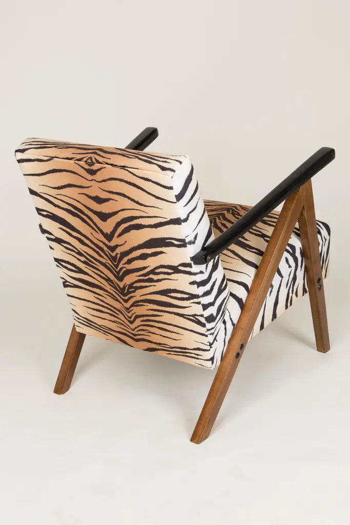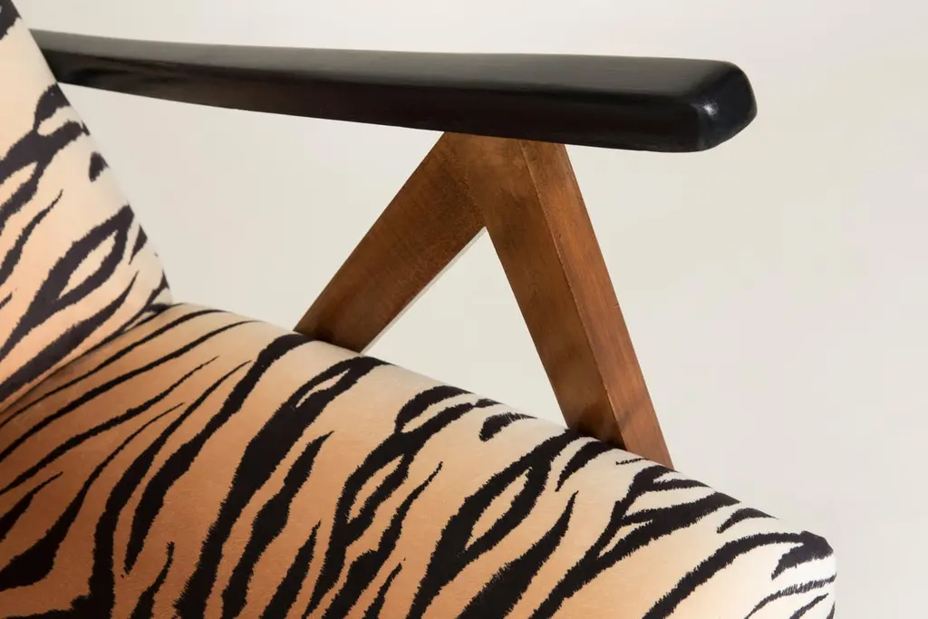 German chairs produced at the turn of the 1960s and 1970s. This is a limited edition and a part of "into the wild" collection of our restored products. The armchairs are after a thorough renovation of upholstery and carpentry. The wooden frame is thoroughly cleaned and covered with a semi-matte varnish in the color of a nut and black. Upholstery made of high quality fabric in beautiful tiger print. The armchairs have a very original design.