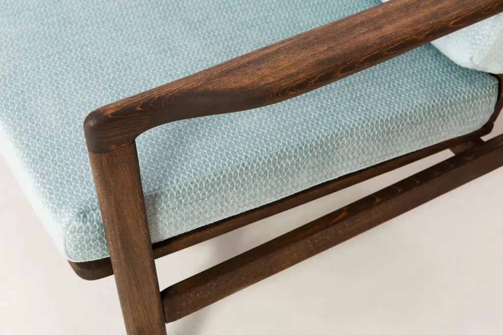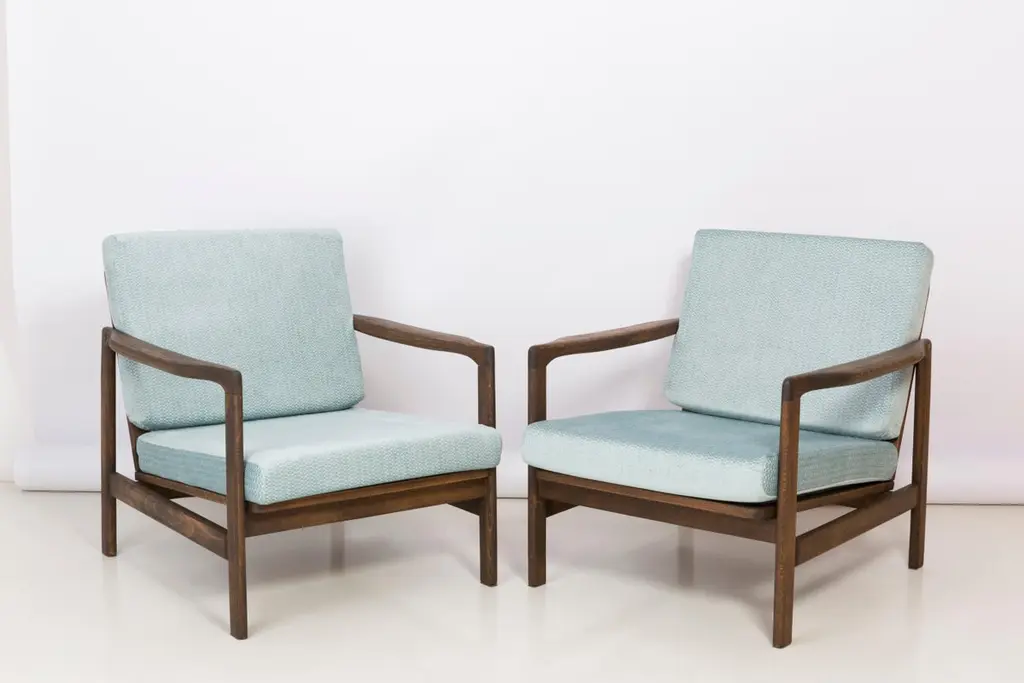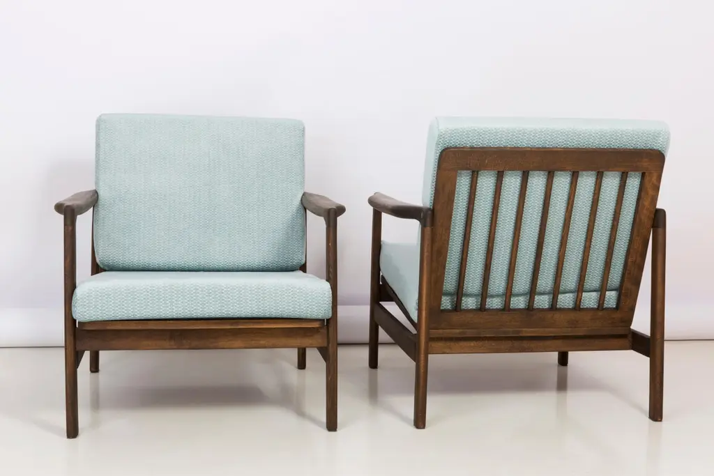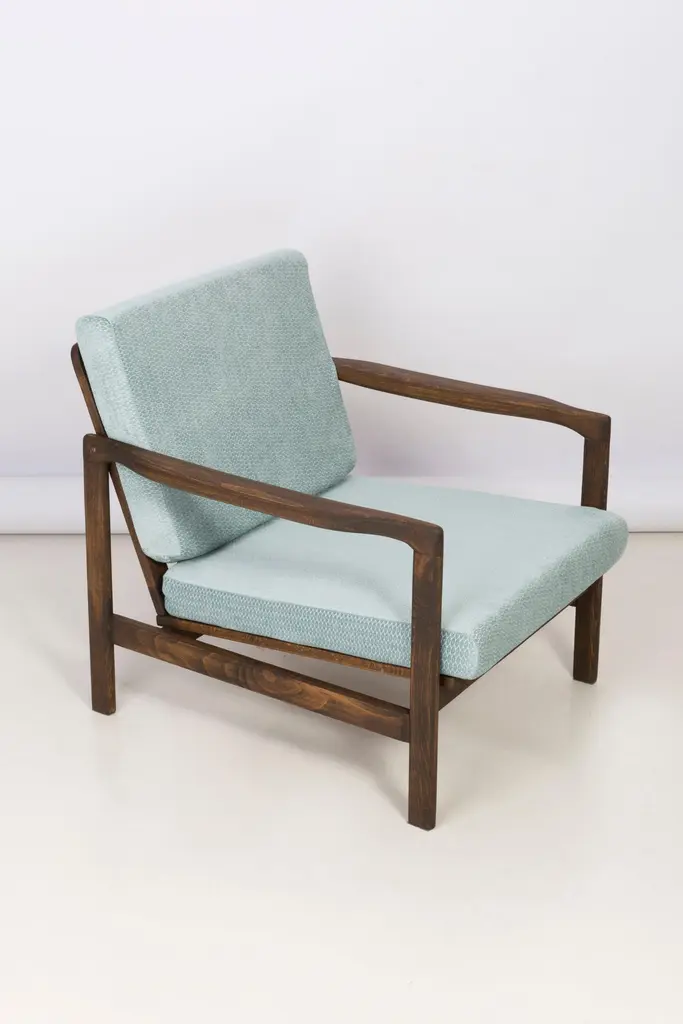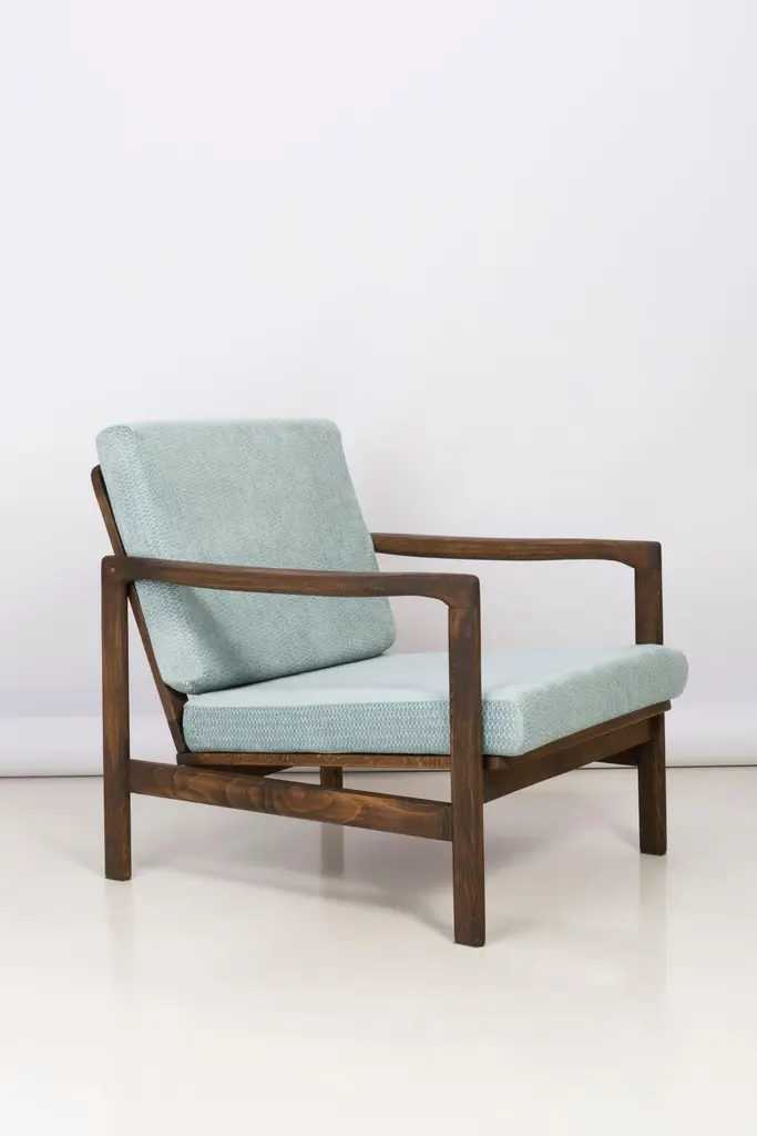 The B-7522 armchairs was designed in the 1960s by Zenon Baczyk, it was produced by Swarzedz furniture factories in Poland. Furniture kept in perfect condition, after full upholstery and wood renovation. Stabile and very comfortable armchair, dressed in high-quality velour.
