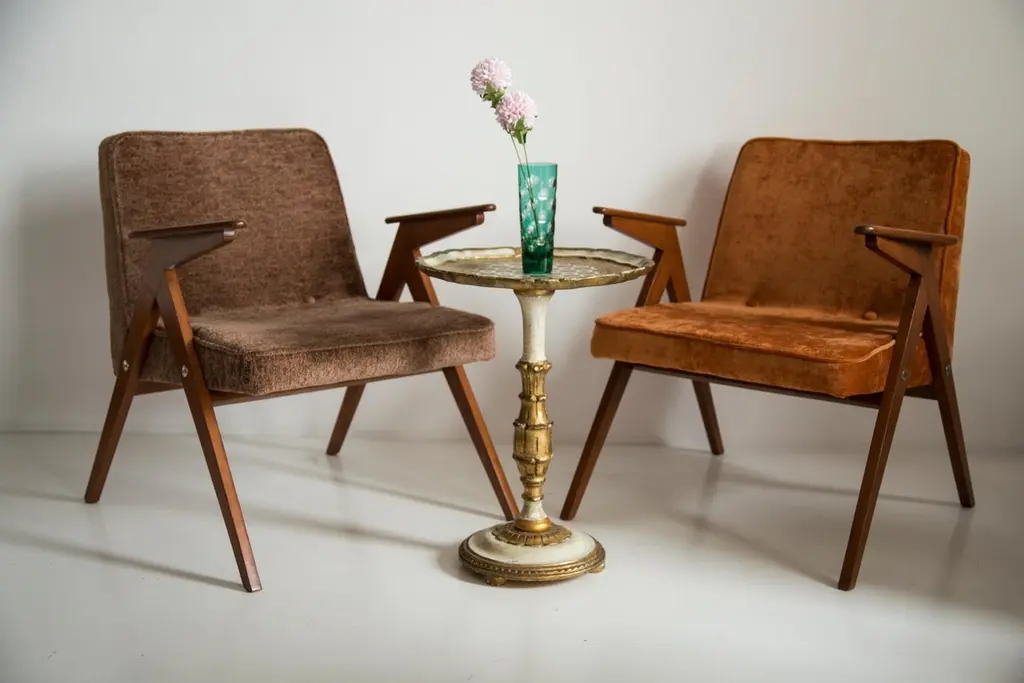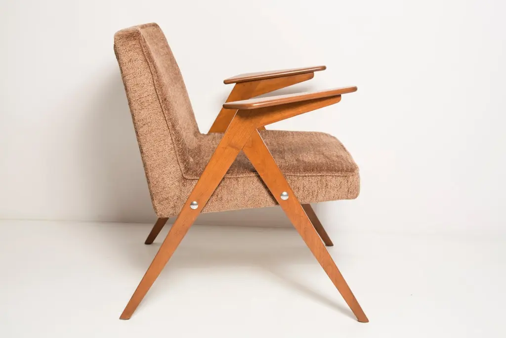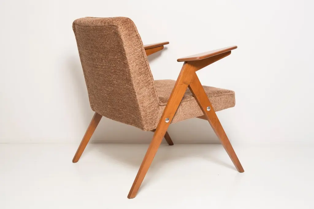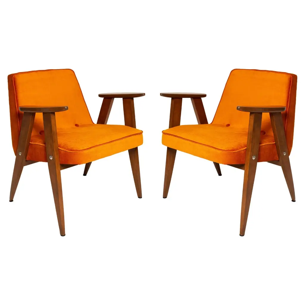 The Bunny Armchair is an icon of the polish design of the PRL period.The famous armchair was designed in 1962 by the Polish interior designer and furniture designer Jozef Marian Chierowski. Produced in the Lower Silesian Furniture Factory in Swiebodzice.The chair has a simple, modernist form. It consists of an upholstered seat combined with a wooden backrest. The organic shape is typical of the 1960s style.The chair is very ergonomic and comfortable, as the furniture designs of that time were largely focused on the user. Due to its small size, the furniture fits perfectly into the interiors of contemporary apartments, perfectly meeting the needs of customers.The chair is in perfect condition after a professional renovation. We can prepare this set also in another wood and fabric color. Please check color samples on the last pictures.Here set of two is available.