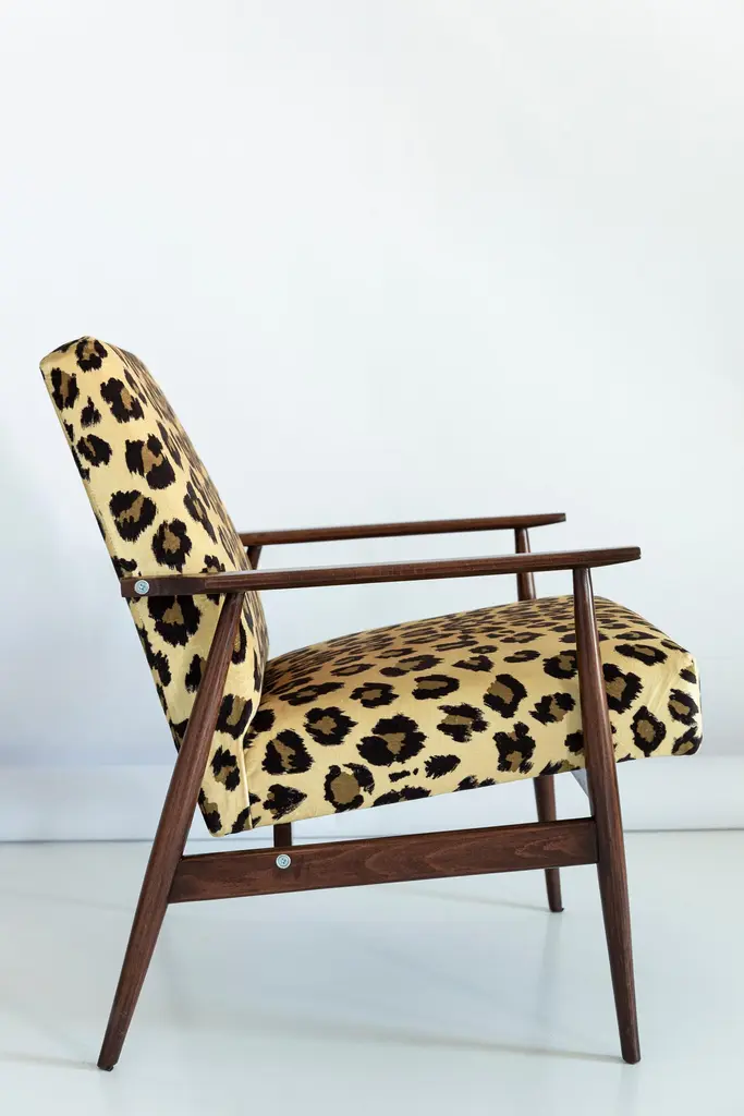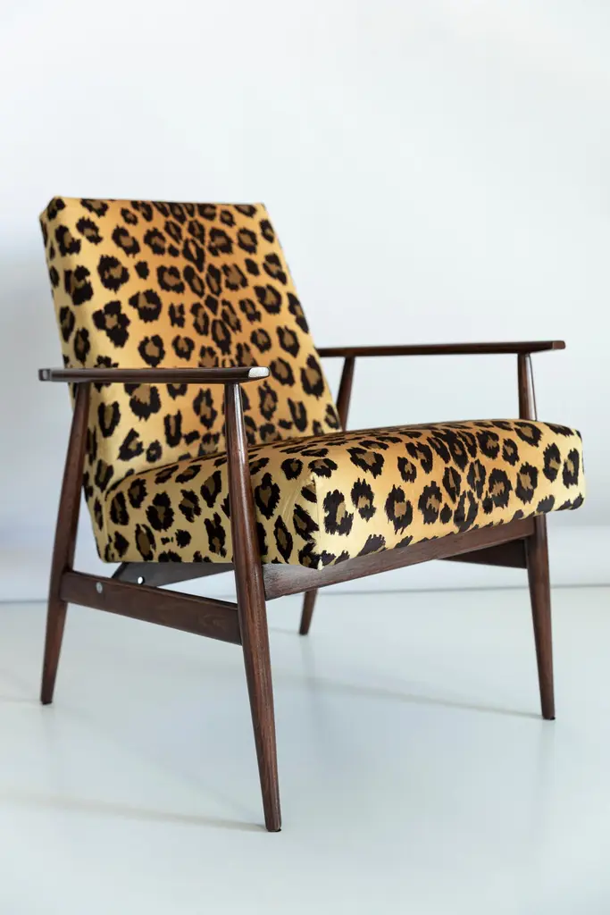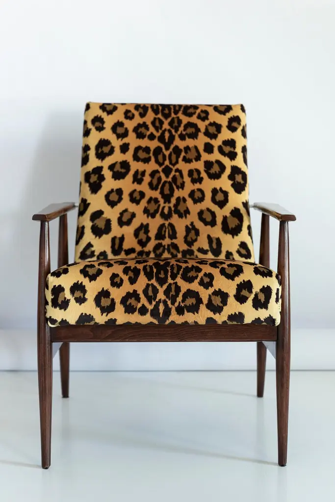A beautiful, restored armchairs designed by Henryk Lis. Furniture after full carpentry and upholstery renovation. The fabric, which is covered with a backrest and a seat, is a high-quality Italian velvet upholstery printed in leopard pattern. The armchairs will be perfect in Minimalist spaces, both private and public. We can prepare this armchairs in different color of fabric and wood.