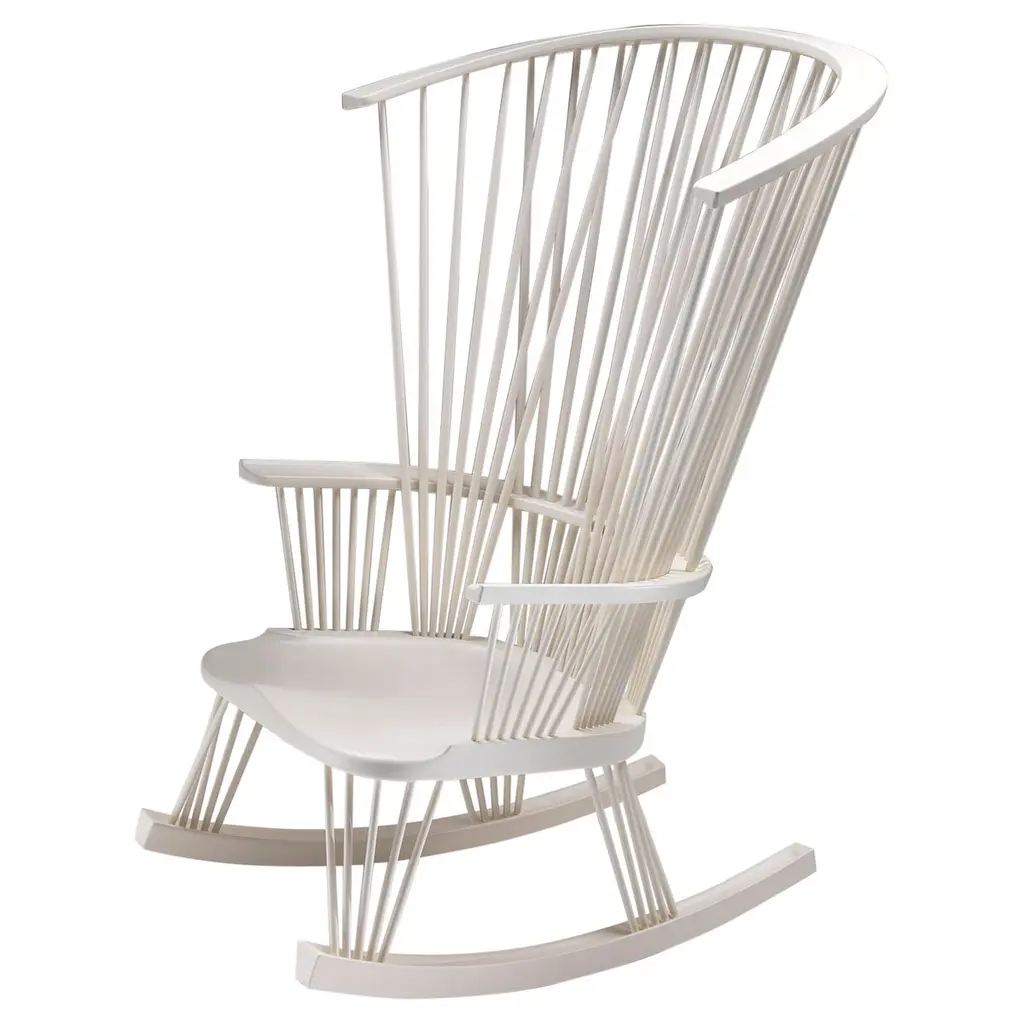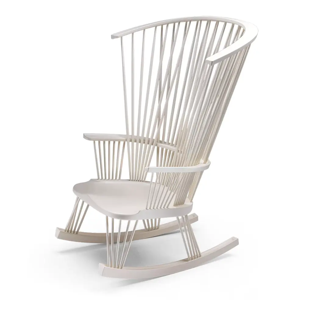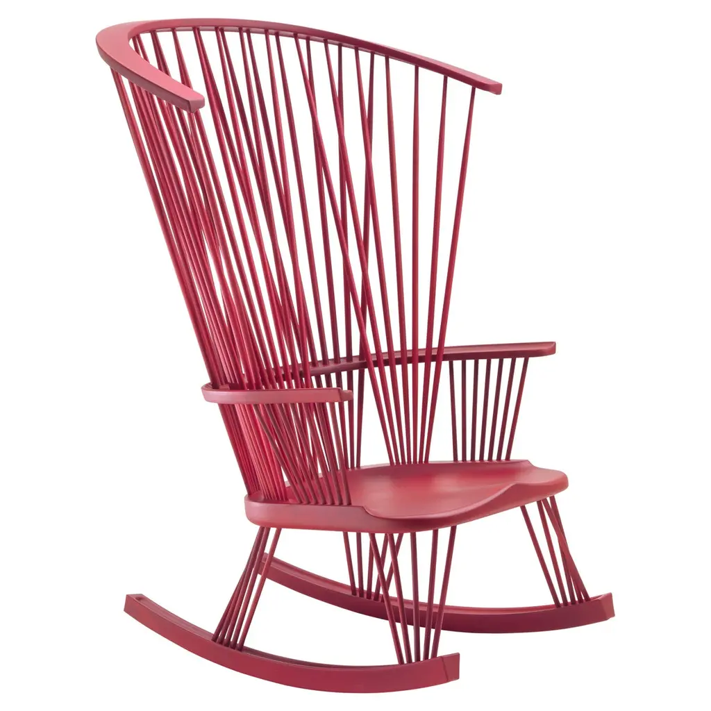 Sitlali draws its inspiration from the archetype of the English Windsor chair, conceived at the end of the 18th century as a country furnishing and evolving throughout the decades to come. The back, designed as a fan of thin overlapping rods, is the distinctive character of the project. The same structure was designed for the base of the chair, making up the legs that end in the curve of the rocker, creating a coherent constructive unit. Finished in Lacquered 20 gloss on a dripped structure.