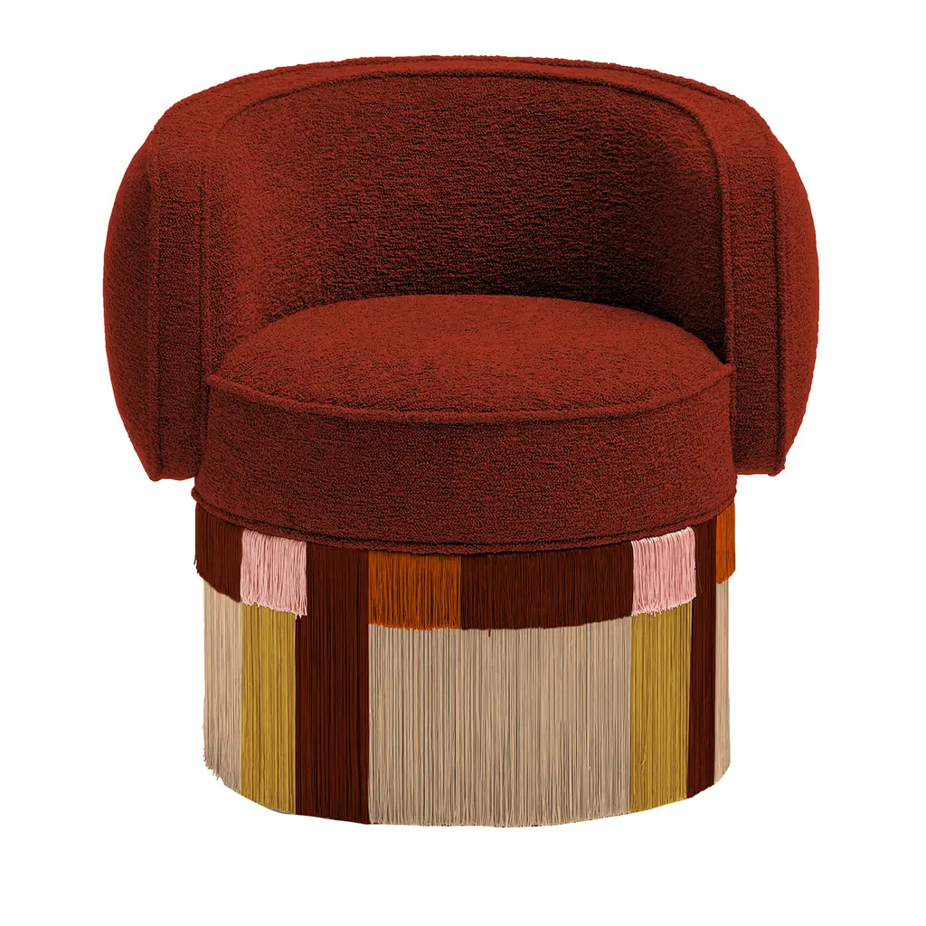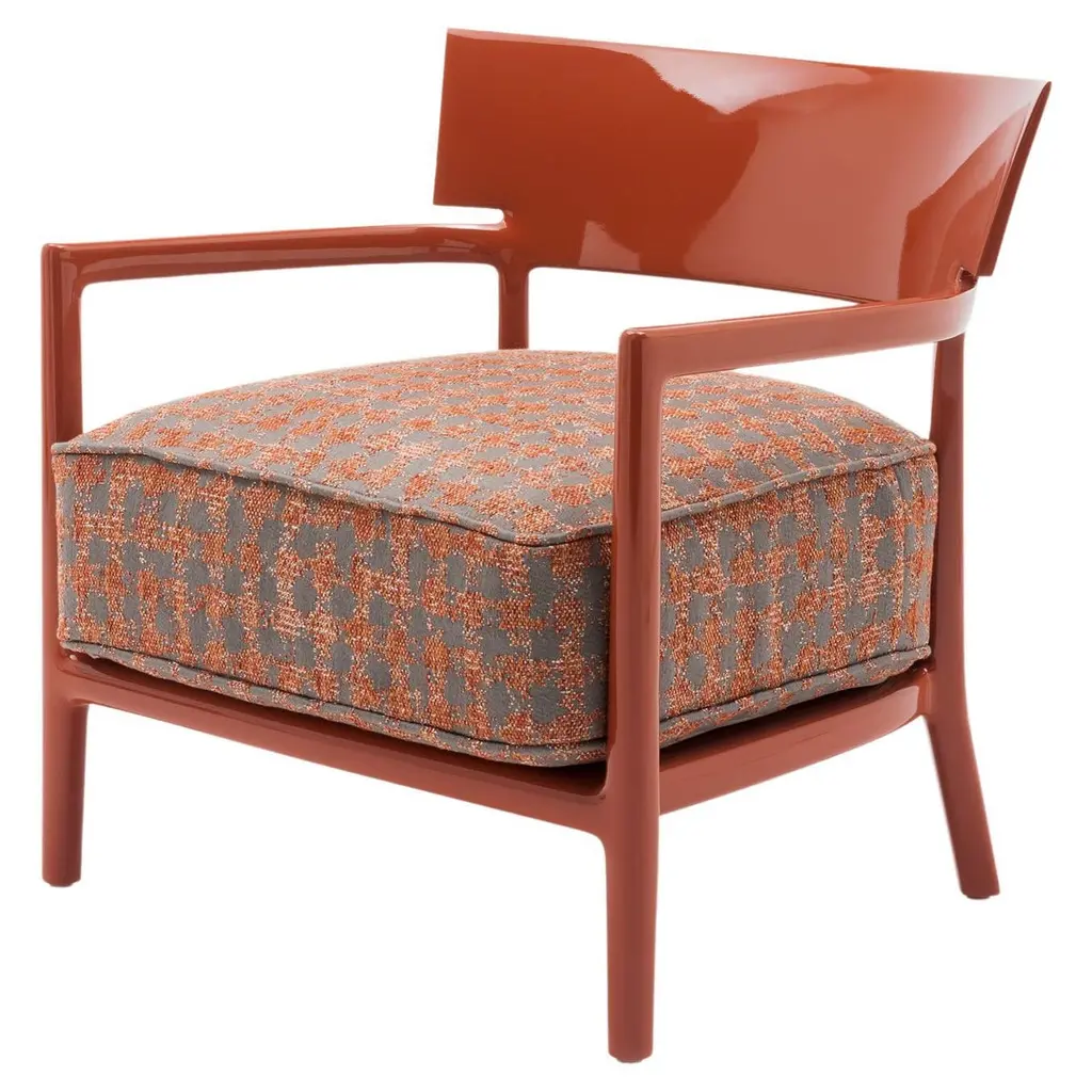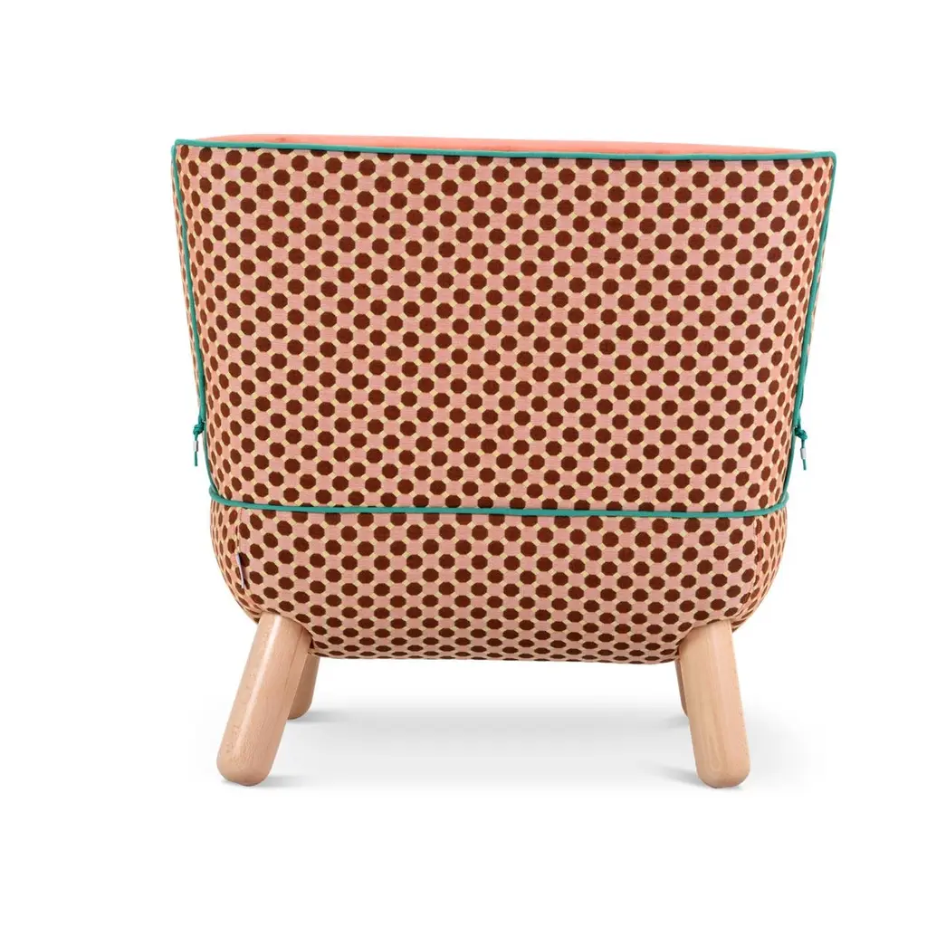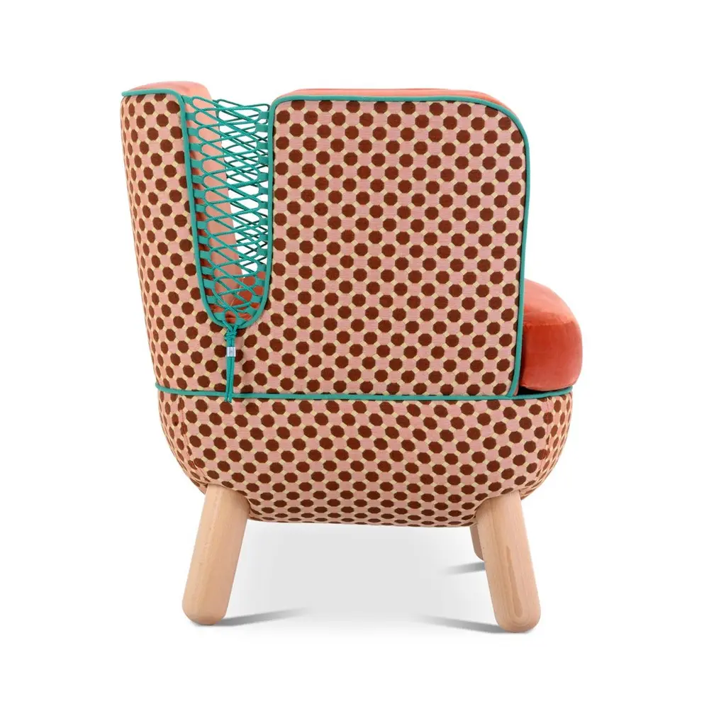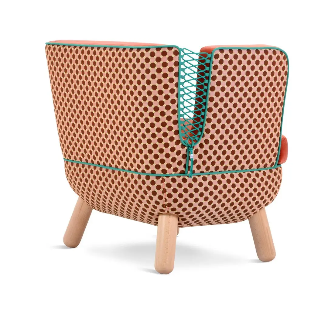 With its enveloping shape, this designer armchair is characterized by the slits on the back, which is available in a high or low version. The slits are closed with polypropylene cords in various colors. The legs shown here in natural beechwood are also available in other finishes and there is also a range of options for the upholstery of the body, with an array of fabric and color choices.