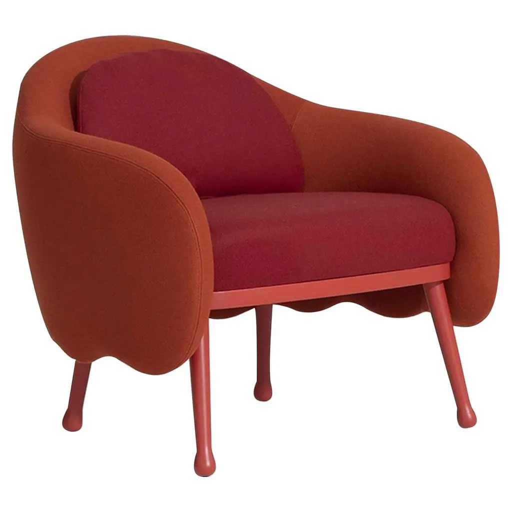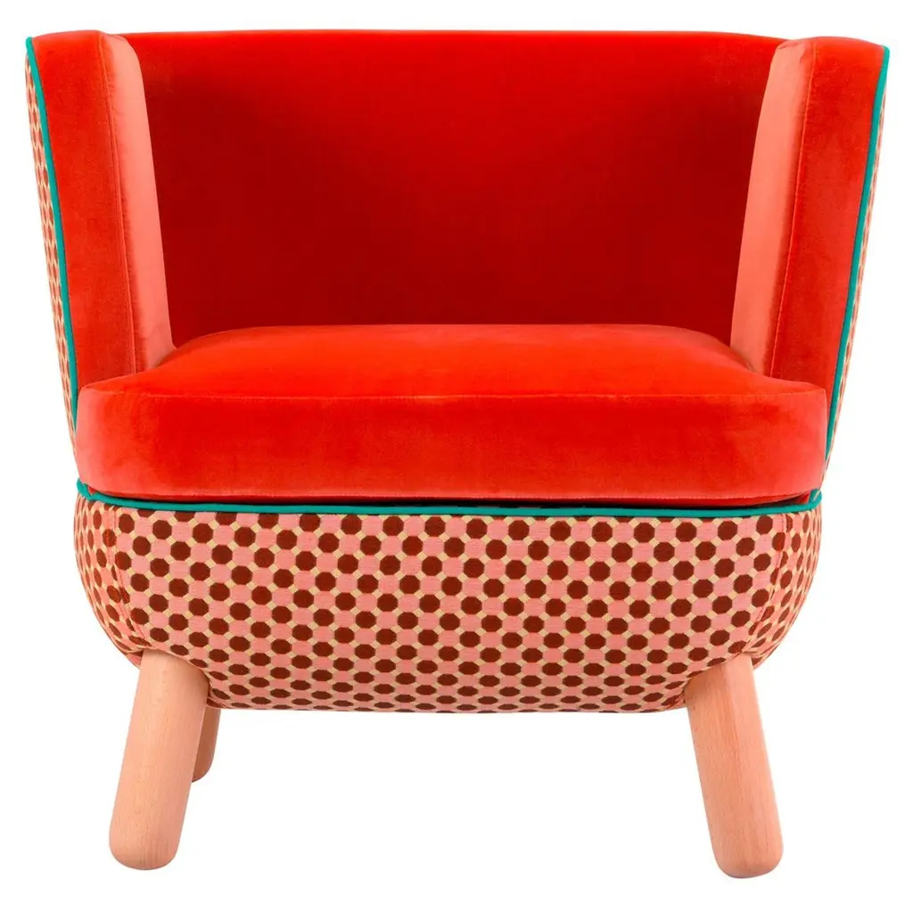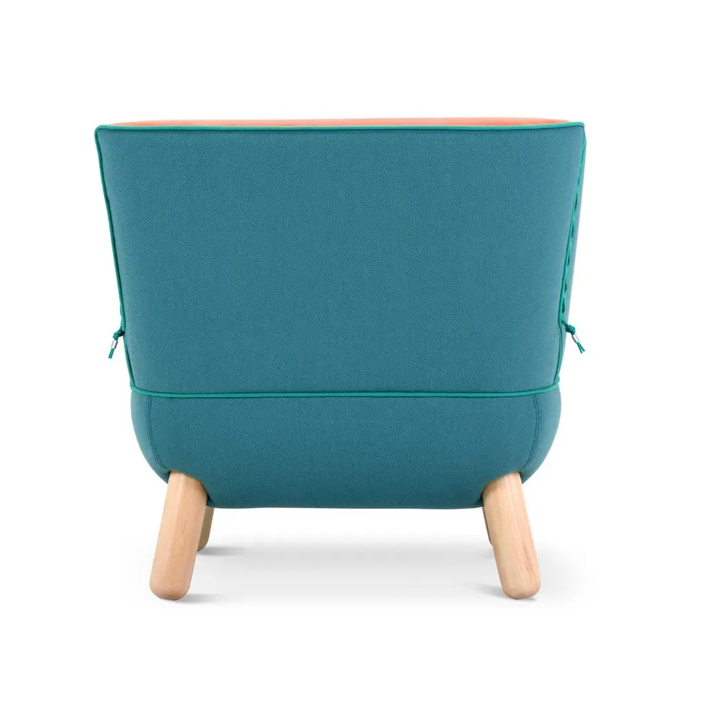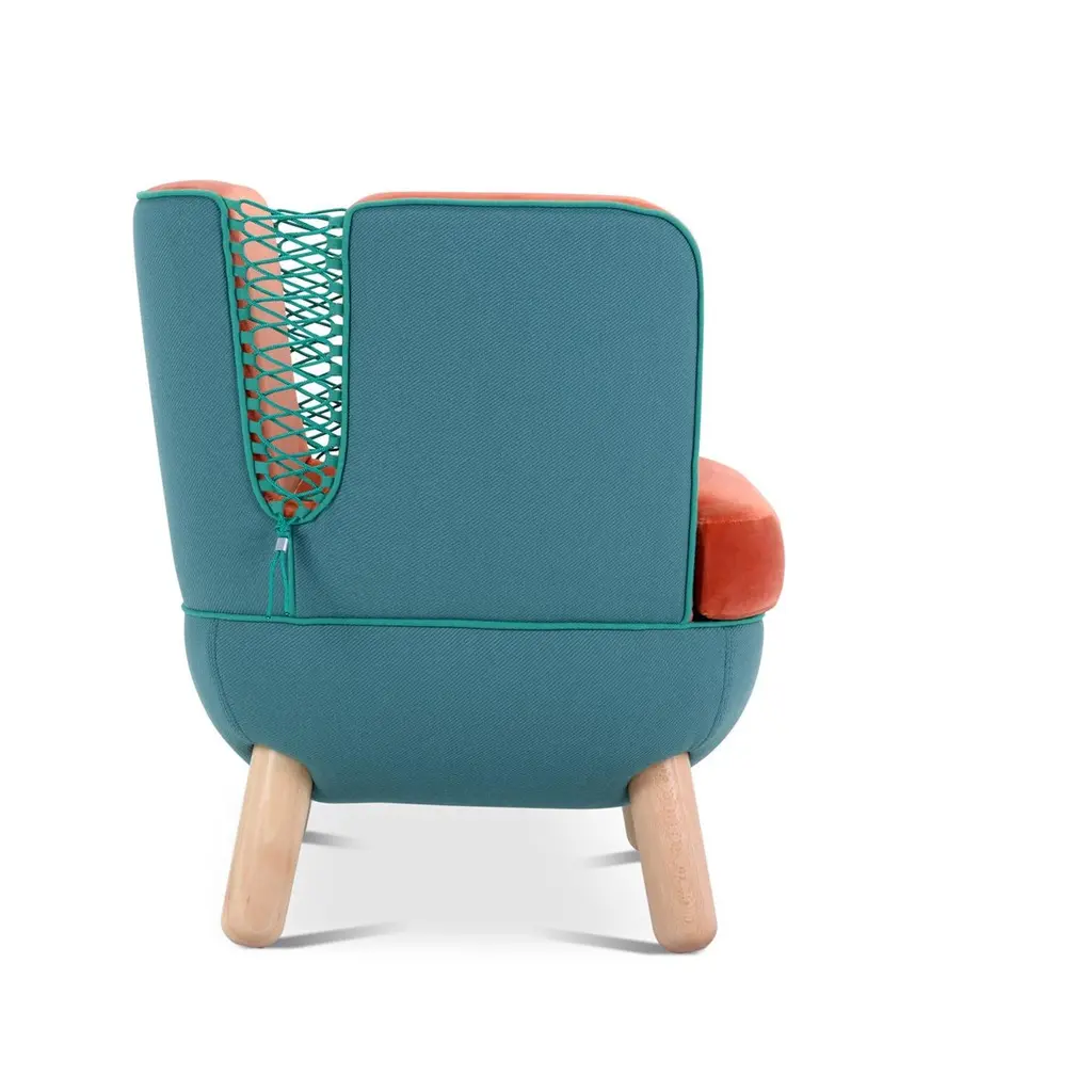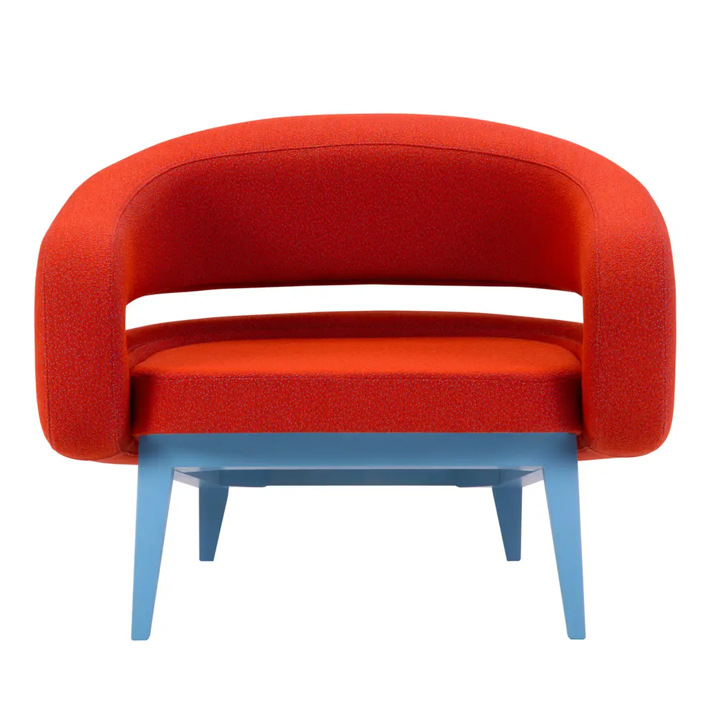 Full curves and an enveloping shape are what characterize the sly armchair. The back, available in a low or high version, features slits closed with interwoven polypropylene cords available in orange, red, purple, blue, dark green, light green, gray and black. The feet are in natural beechwood and also available in other finishes. The two-tone upholstery may be chosen from an array of colored fabrics.