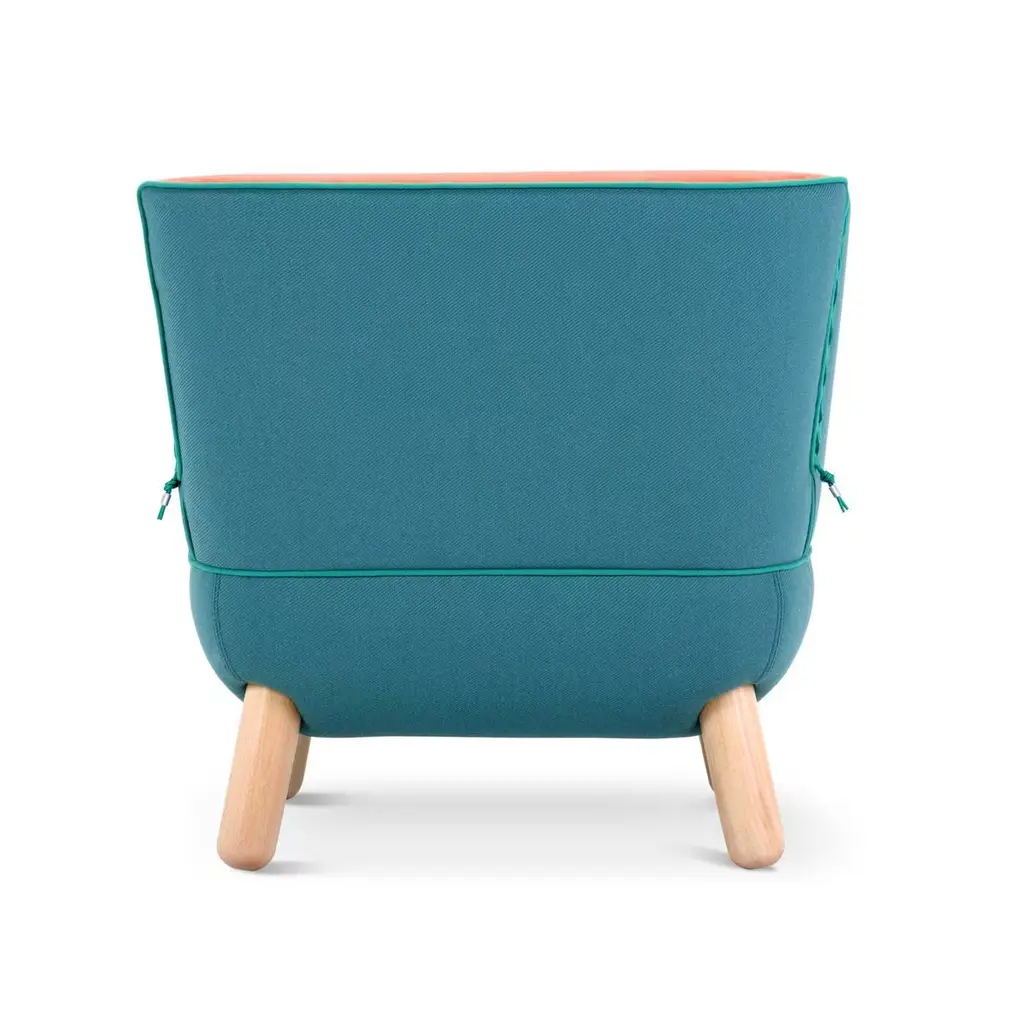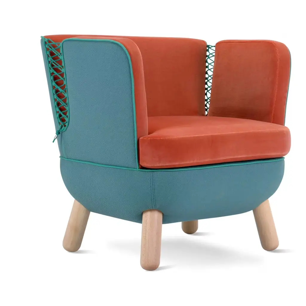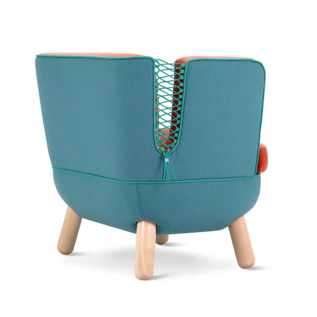 Full curves and an enveloping shape are what characterize the Sly armchair. The back, available in a low or high version, features slits closed with interwoven polypropylene cords available in orange, red, purple, blue, dark green, light green, gray and black. The feet are in natural beech wood and also available in other finishes. The two-tone upholstery may be chosen from an array of colored fabrics.