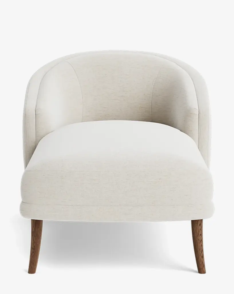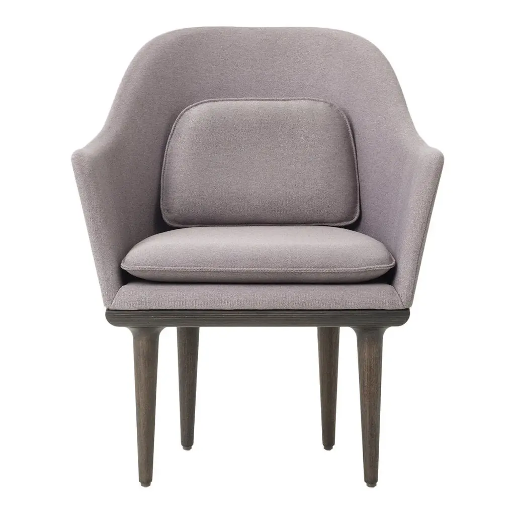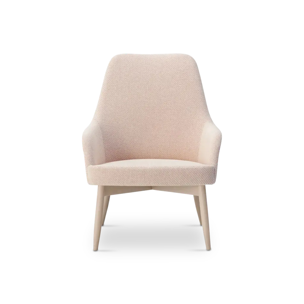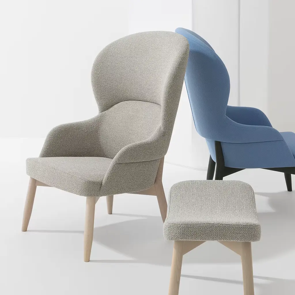 This elegant design defined by soft curves is an invitation to relax while sipping a good glass of wine. Four tapered legs in whitened beech - same material composing the armchair's frame - sustain the welcoming seat (height 43 cm) fully enveloped by an imposing backrest, whose wavy profile gracefully proceeds downwards including the sloping armrests.