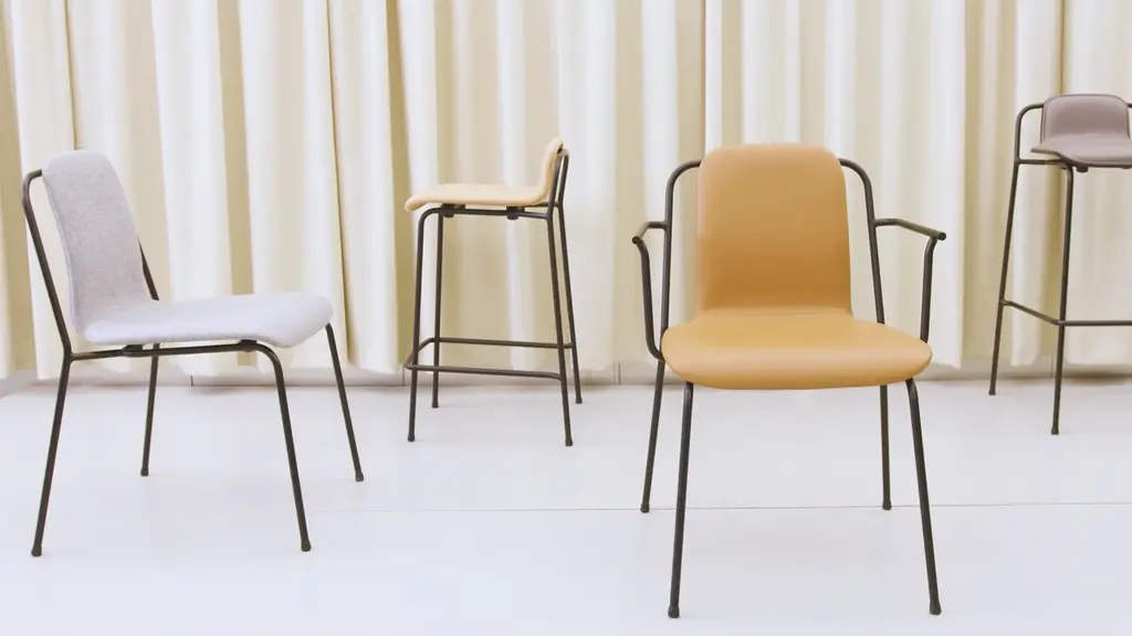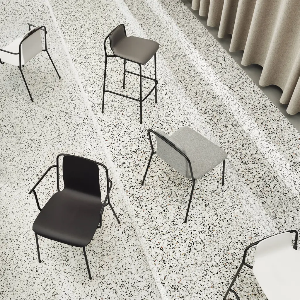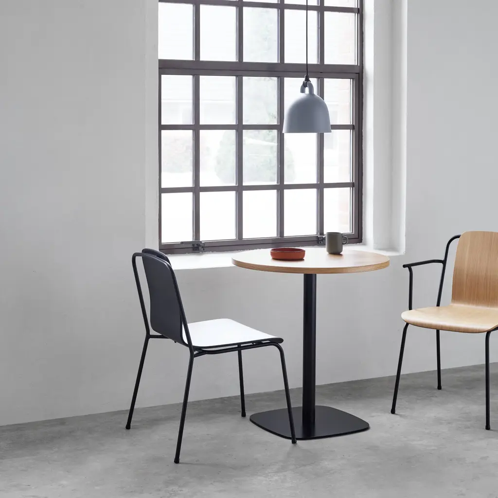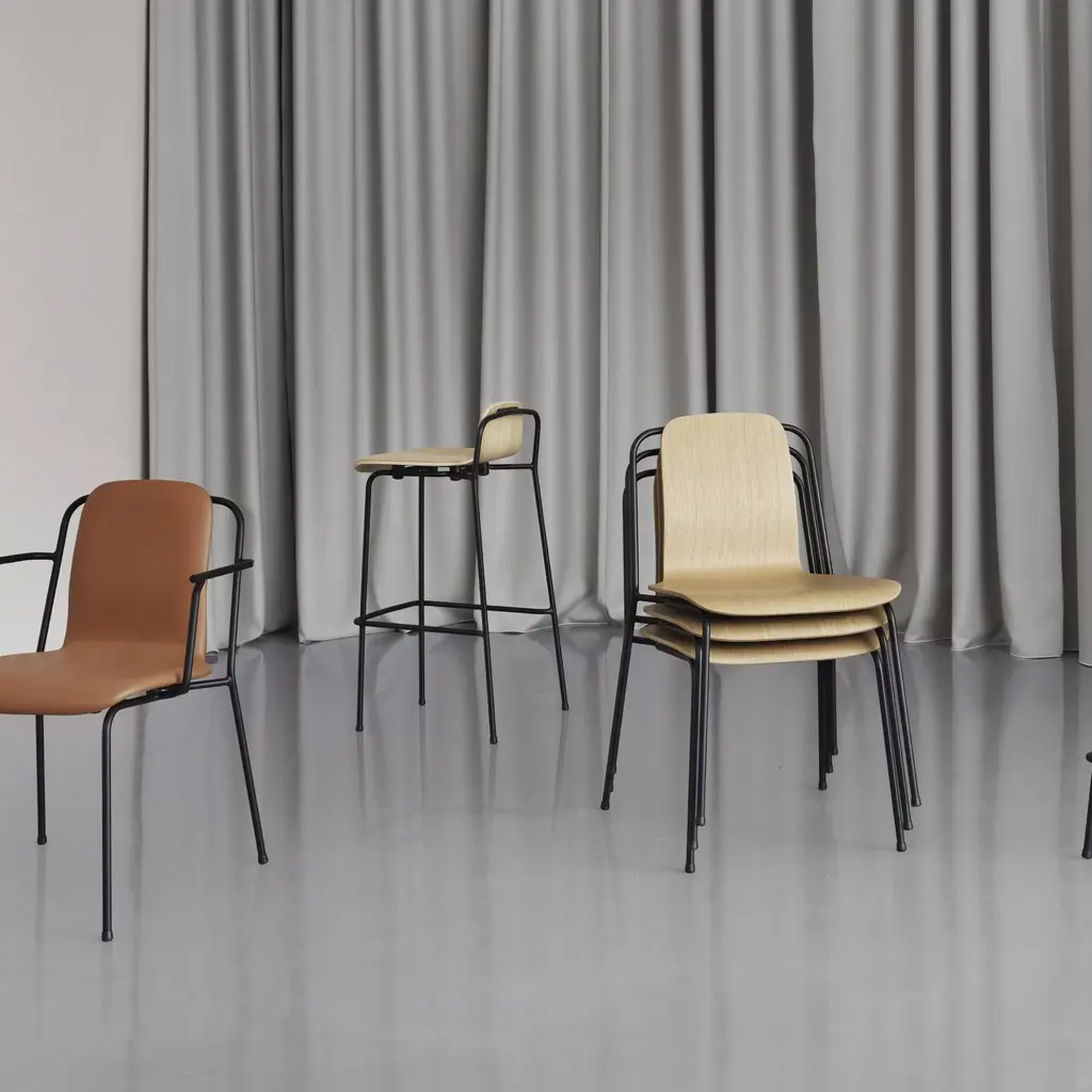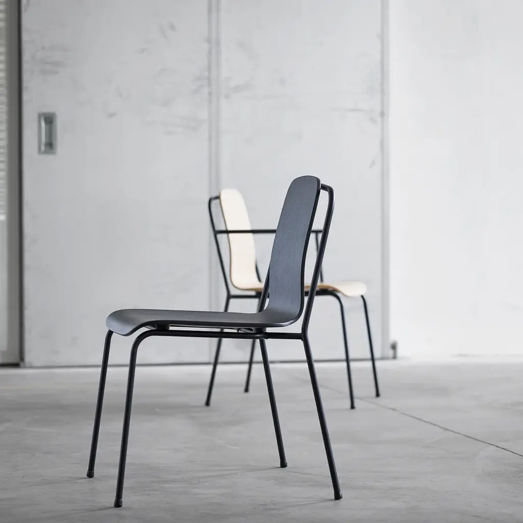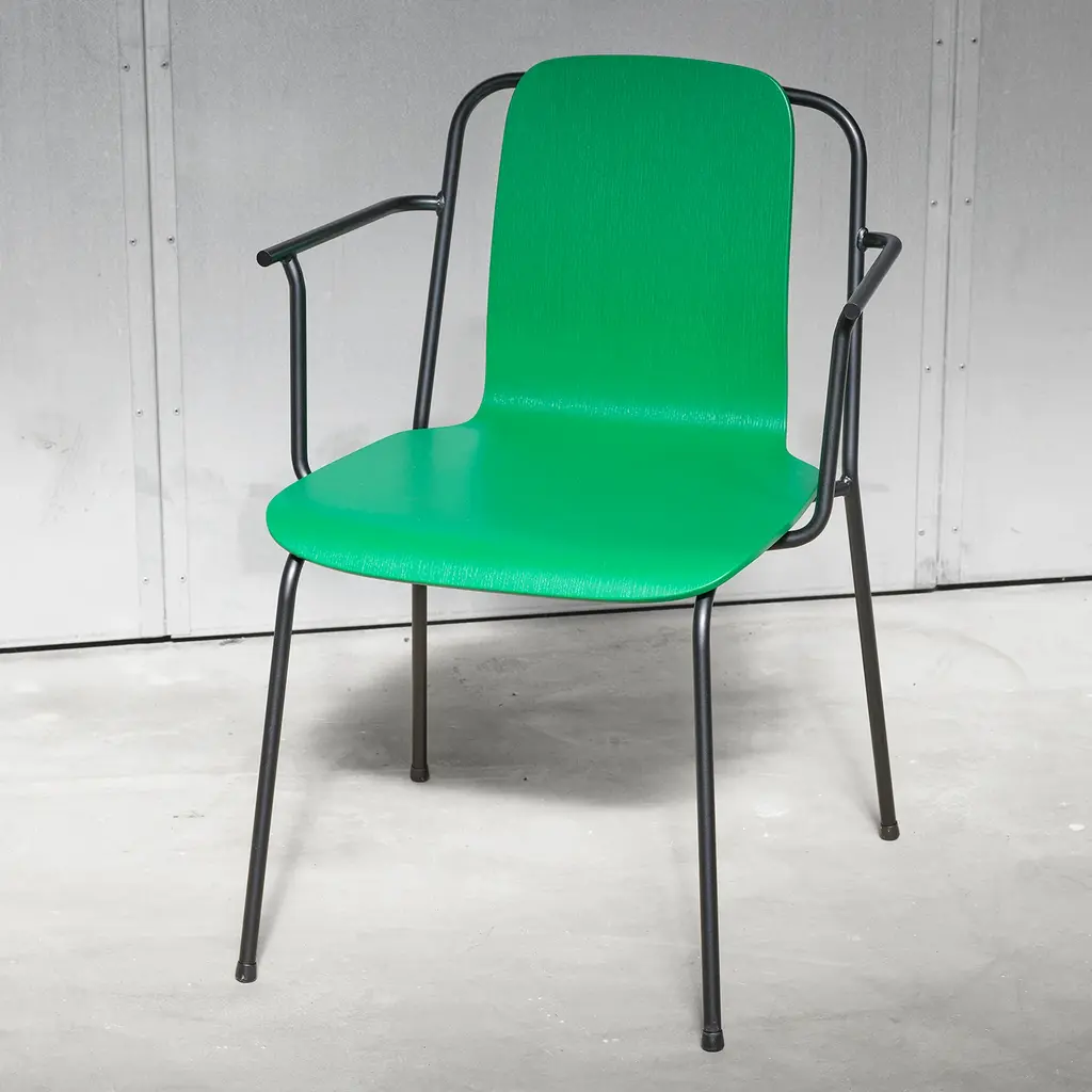 With a nod to vintage European industrial style, Studio armchair adds a tubular steel frame to the redoubtable shell seat. Molded in oak veneer, it comes in either a clear lacquer or painted finish while the black frame is powder-coated. Completely stackable, the armchair is an apropos choice for contract environments but its attractive lines are just as at home in residential settings.