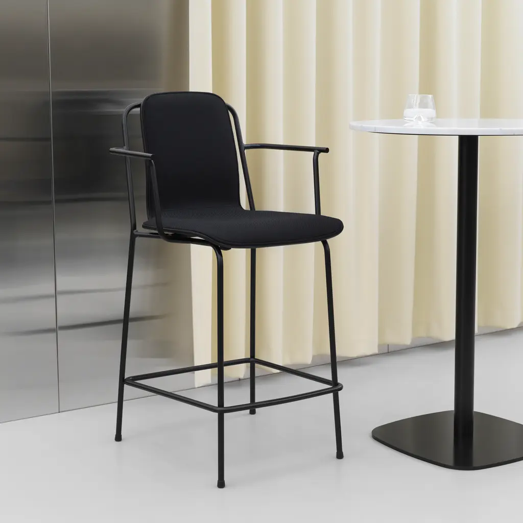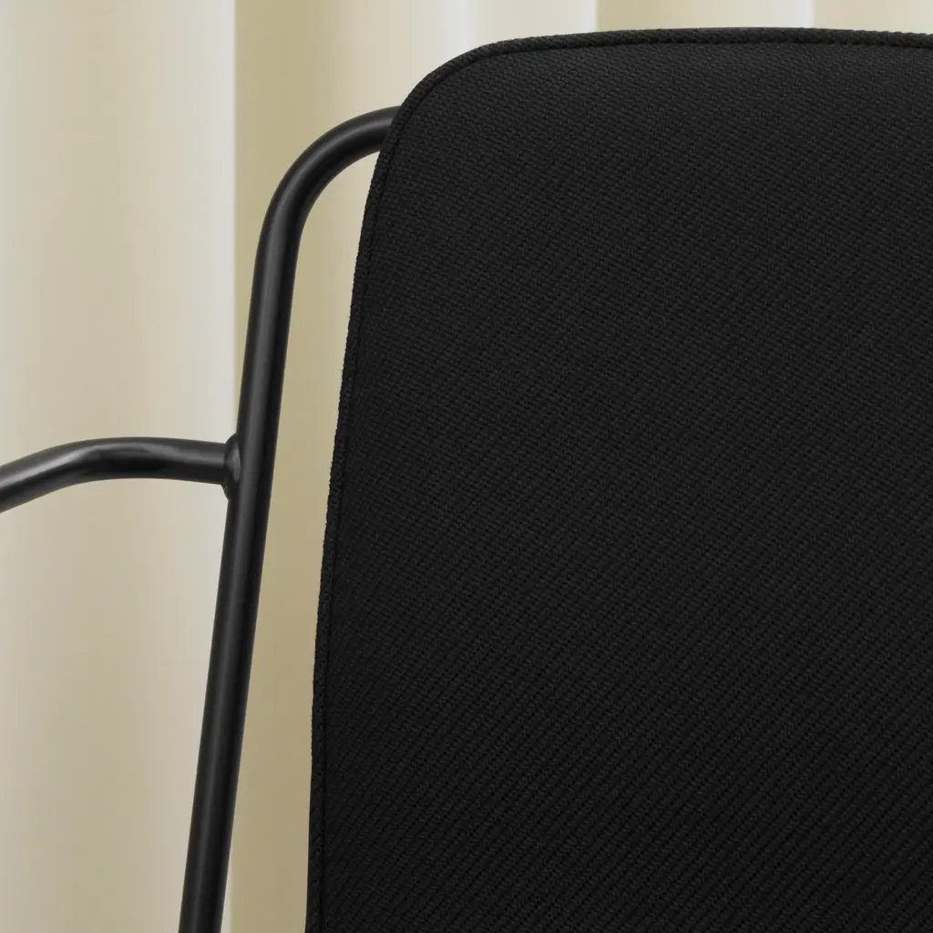 Normann Copenhagen adapts its Studio template to a comfortable full-armchair version of its bar and counter seating with the addition of custom front upholstery. The molded plywood seat is covered in fine fabric or naturally treated leather in this elevated take on industrial French factory chairs. Deceptively simple construction in matte black steel tubing defines the shape of designer Simon Legald's choice offering for home and public spaces alike.