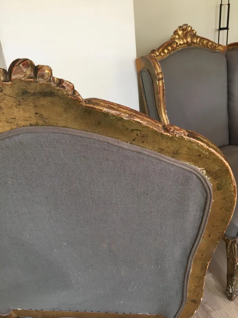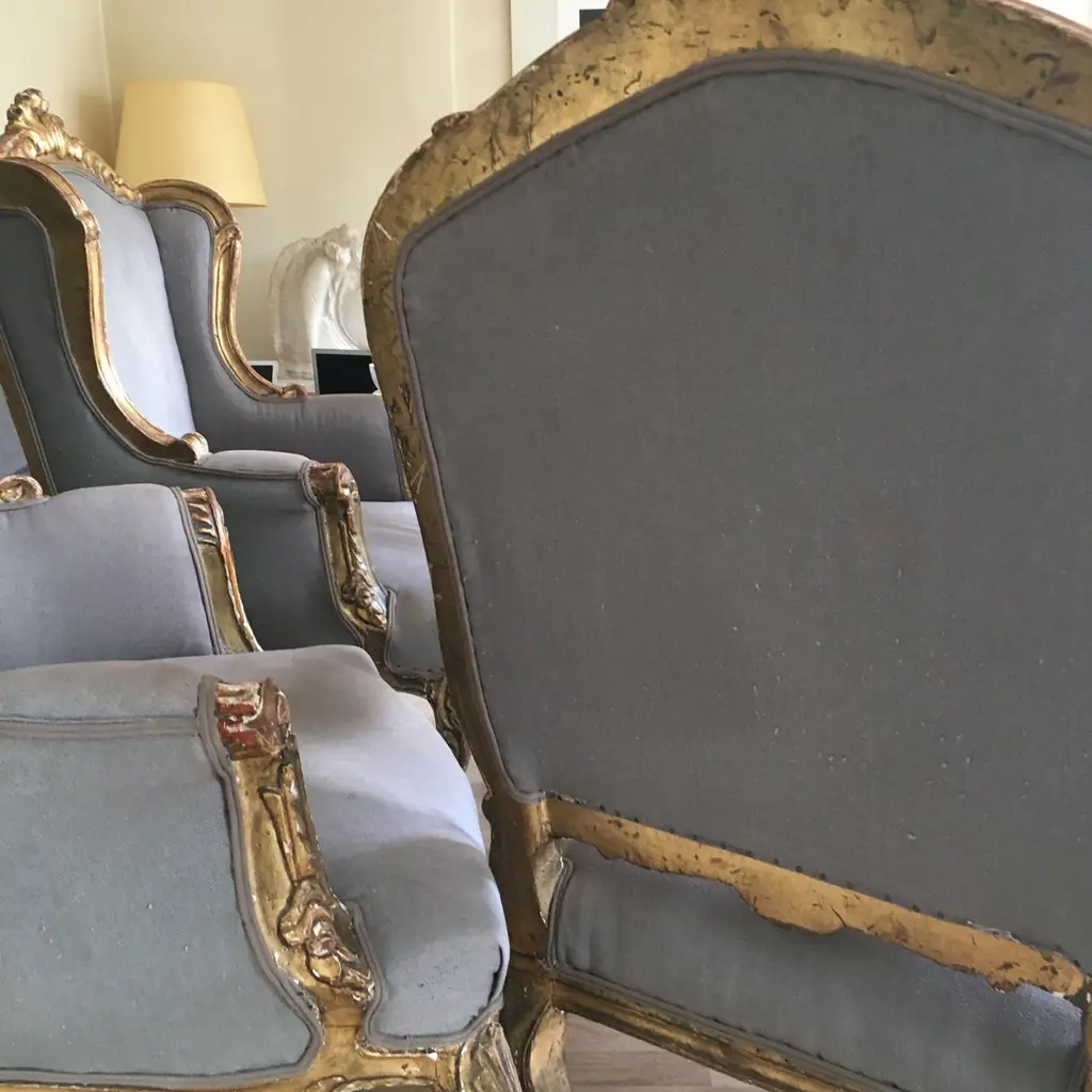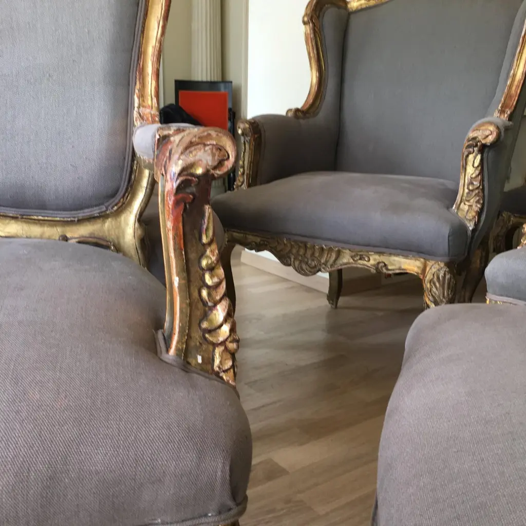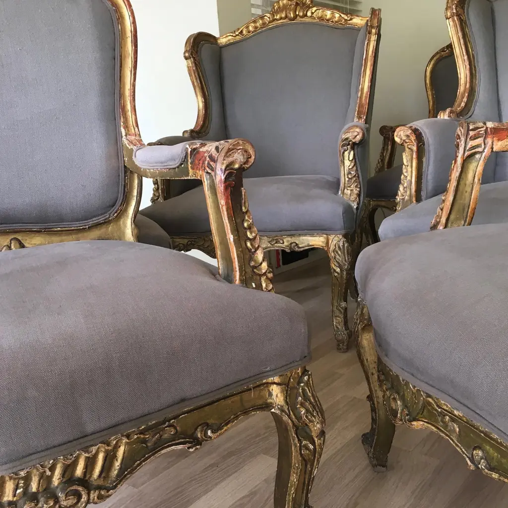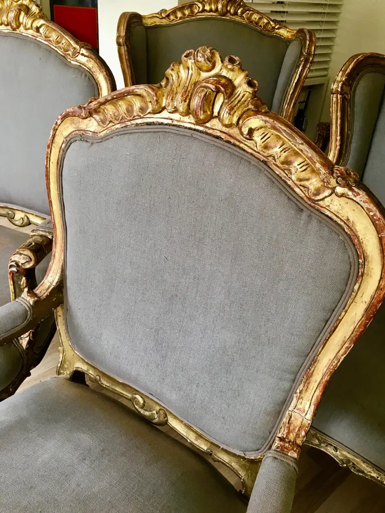 Fine set of of four Baroque Rococo "Cabriolet" armchairs.Gilt carved wood. Original vintage grey fabric (canvas).Italy, end of the 19th century.