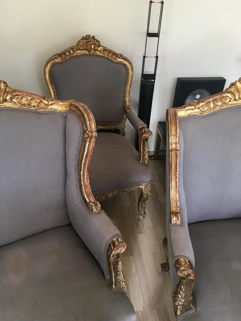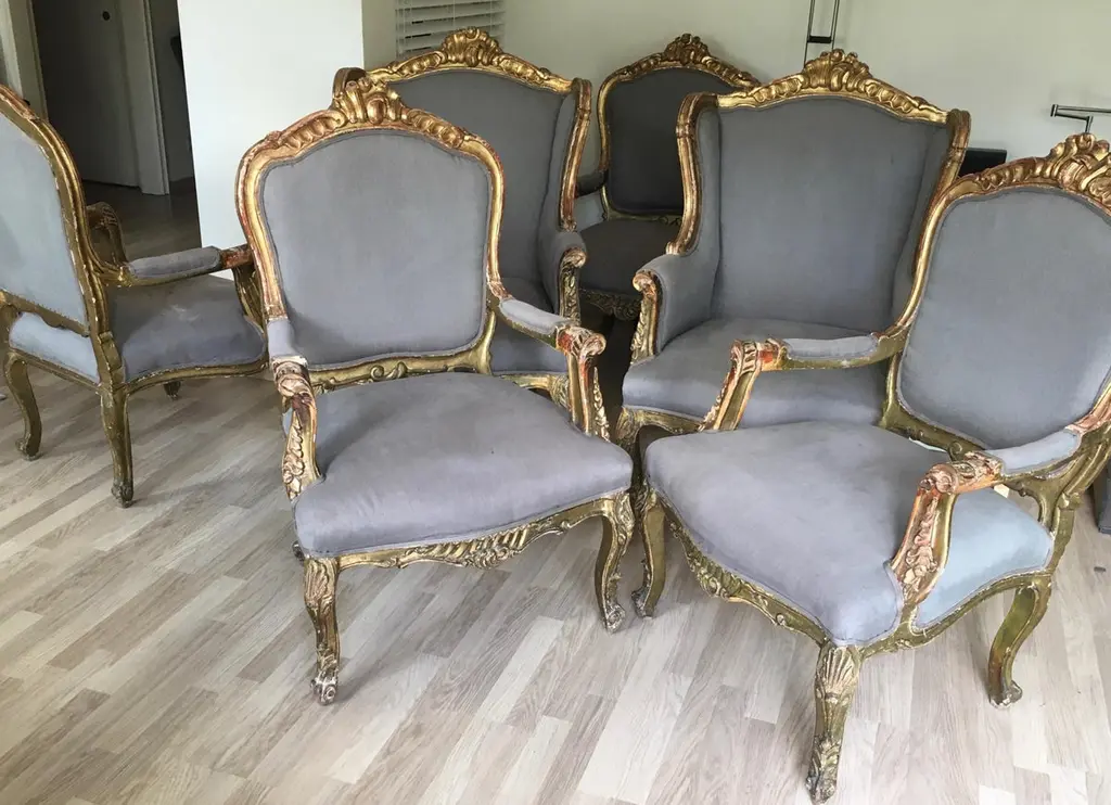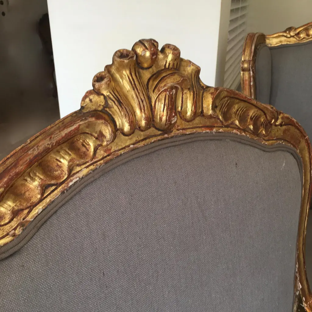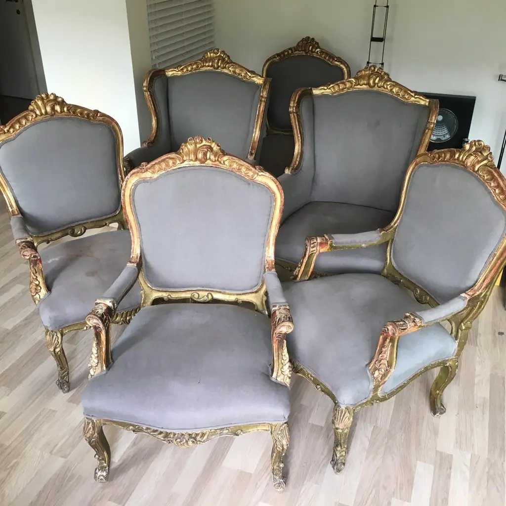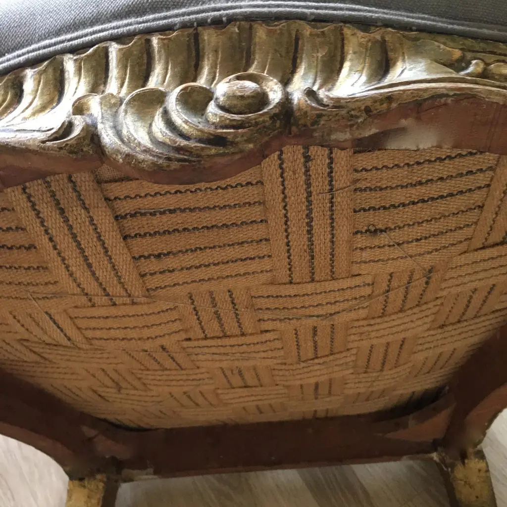 Fine set of of four Baroque Rococo "Cabriolet" armchairs.Gilt carved wood. Original vintage grey fabric (canvas).Italy, end of the 19th century.