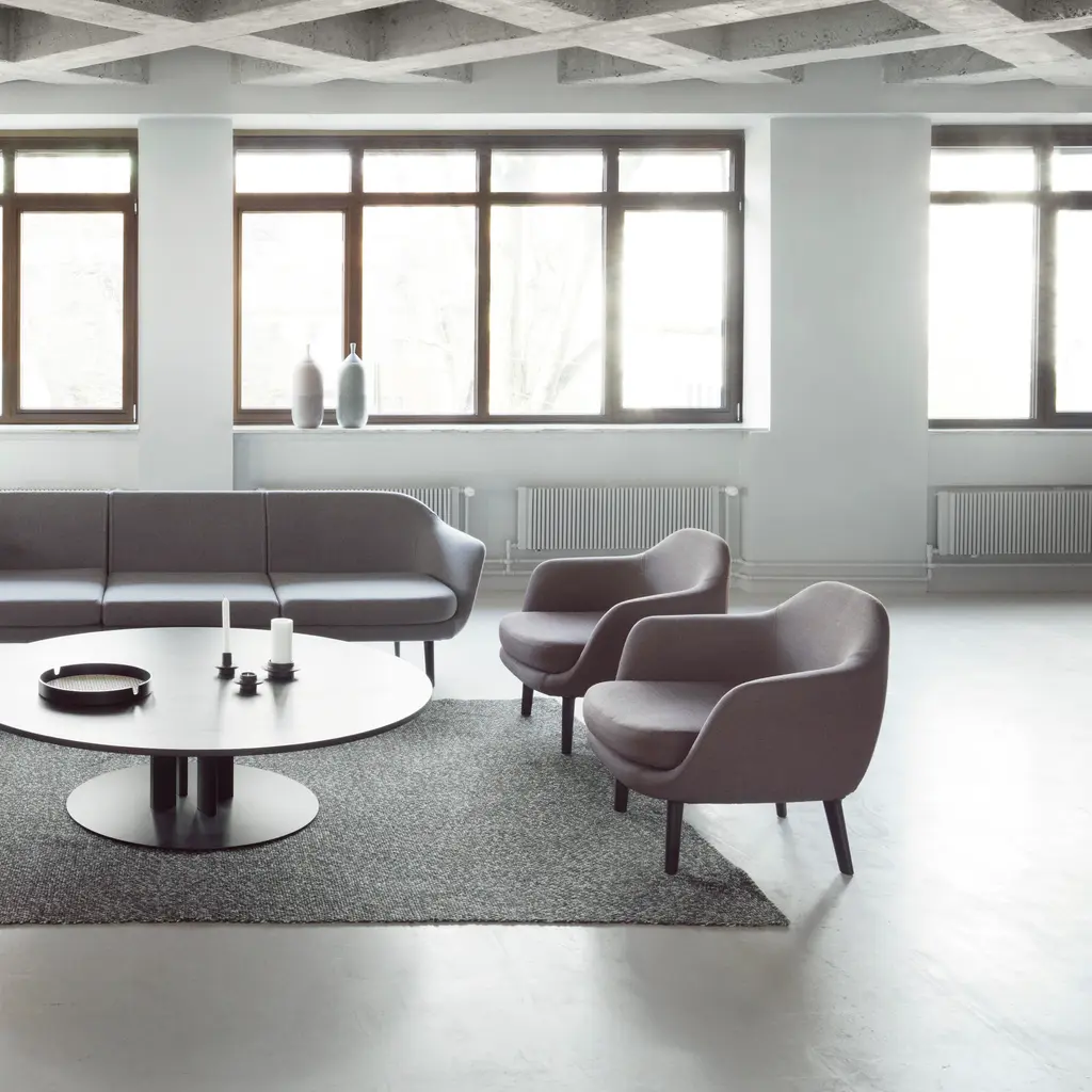 Simon Legald's companion armchair to his Sum modular sofa has the same gracefully open character. Invitingly angled armrests and the generous contours of the curved upholstered surfaces bespeak long-lasting comfort. Slim angled legs in aluminum hold the seating aloft, making for an unprepossessing but distinctive addition to a room.