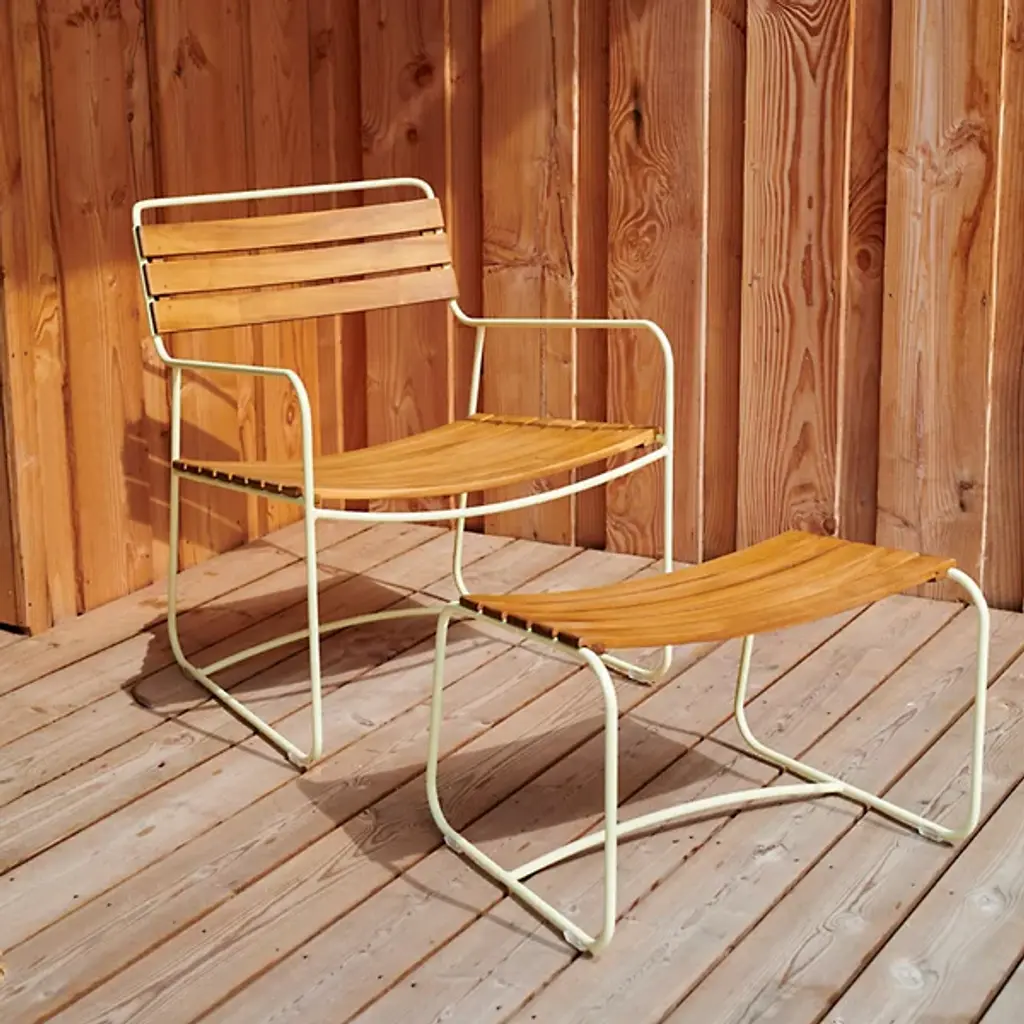 A graceful surprise. Invite classic good looks and comfort to your outdoor seating with the Surprising Teak Low Armchair by Fermob. Designer Harold Guggenbichler brings his penchant for poetic curves to this armchair design. With its graceful proportions and elegant curves, this low armchair showcases a slatted back and seat in warm, natural Teak. The ergonomically curved seat provides comfort for relaxing with a cold drink on the patio and the Steel rod frame with its sleigh base and crossbar provide stability. Pair this deck chair with the Surprising Teak Footrest for the ultimate lounging comfort when relaxing poolside with a book or catching up with friends on a breezy summer’s eve.