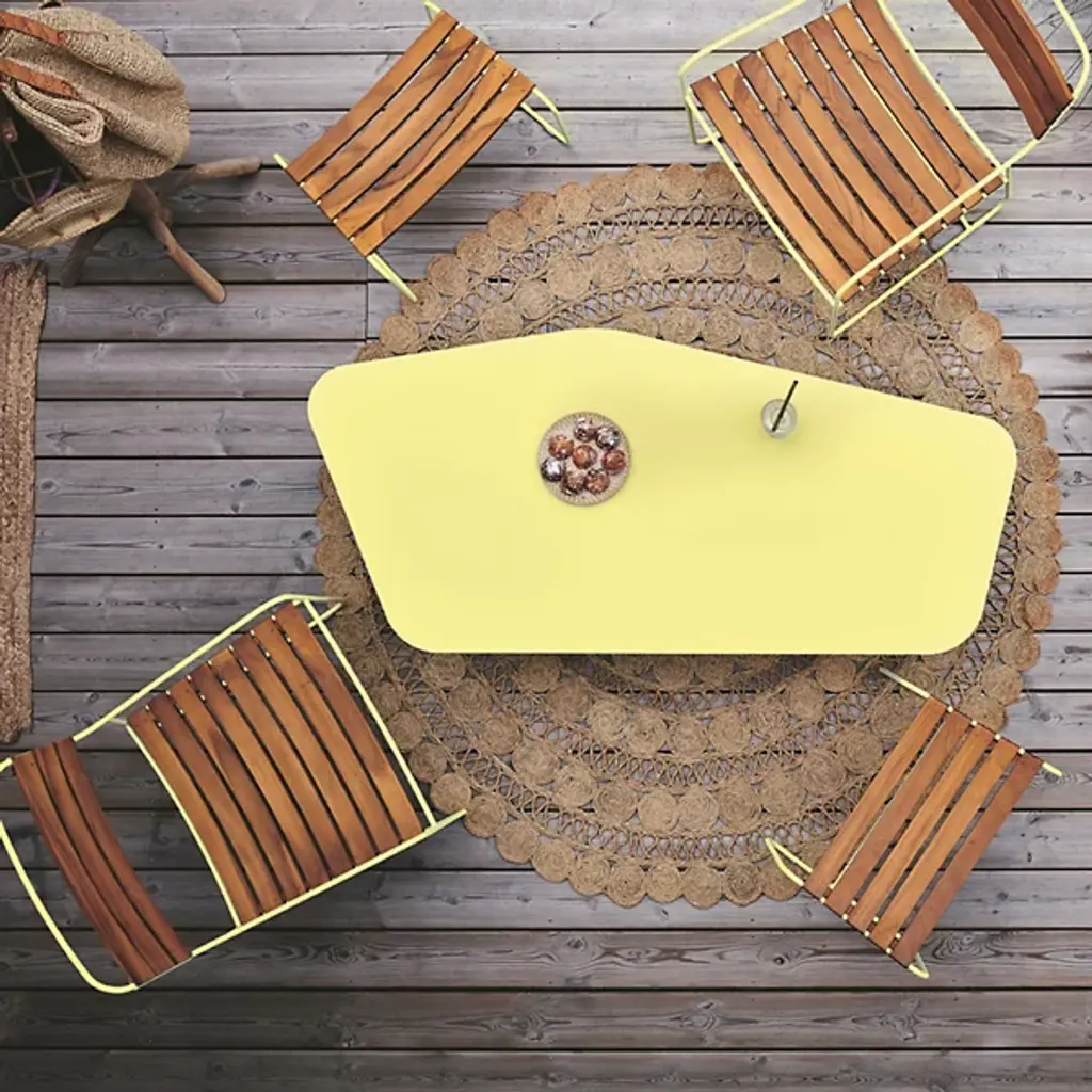 A graceful surprise. Invite classic good looks and comfort to your outdoor seating with the Surprising Teak Low Armchair by Fermob. Designer Harold Guggenbichler brings his penchant for poetic curves to this armchair design. With its graceful proportions and elegant curves, this low armchair showcases a slatted back and seat in warm, natural Teak. The ergonomically curved seat provides comfort for relaxing with a cold drink on the patio and the Steel rod frame with its sleigh base and crossbar provide stability. Pair this deck chair with the Surprising Teak Footrest for the ultimate lounging comfort when relaxing poolside with a book or catching up with friends on a breezy summer’s eve.