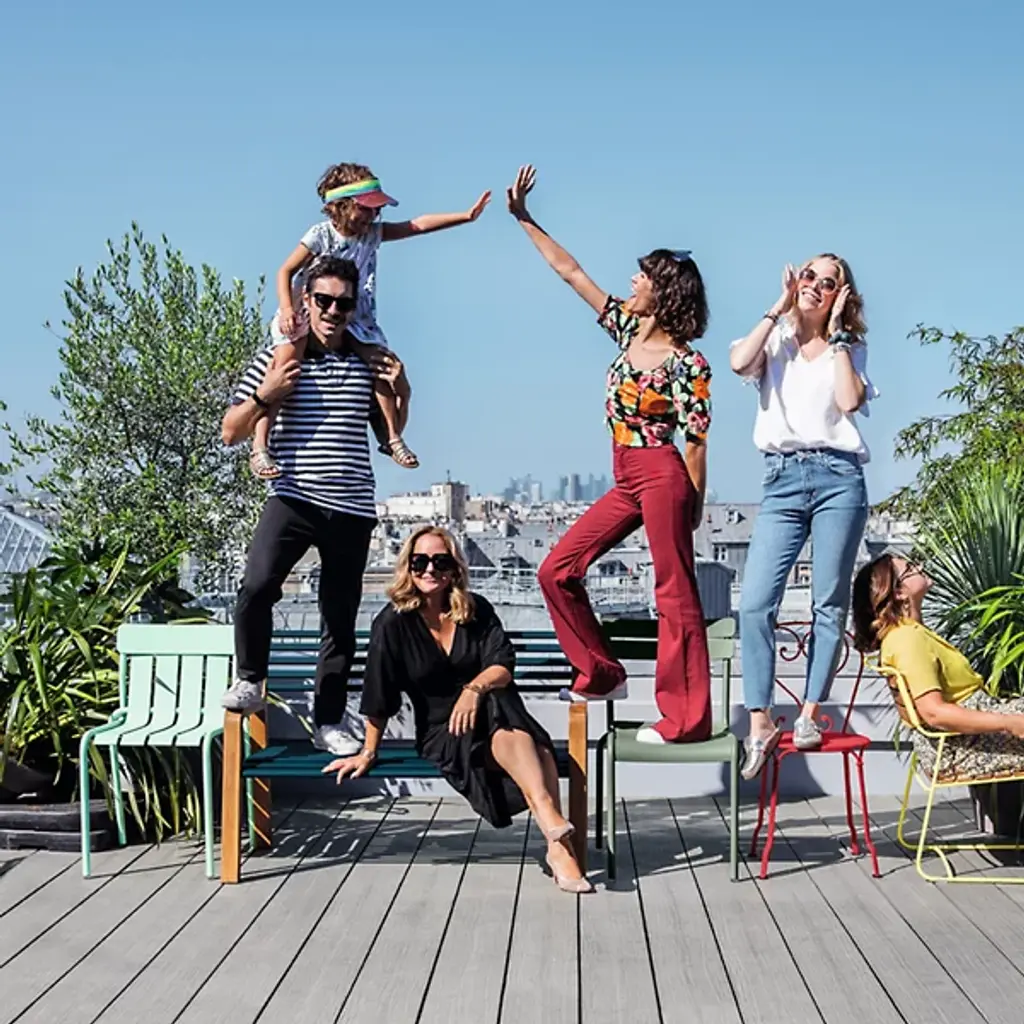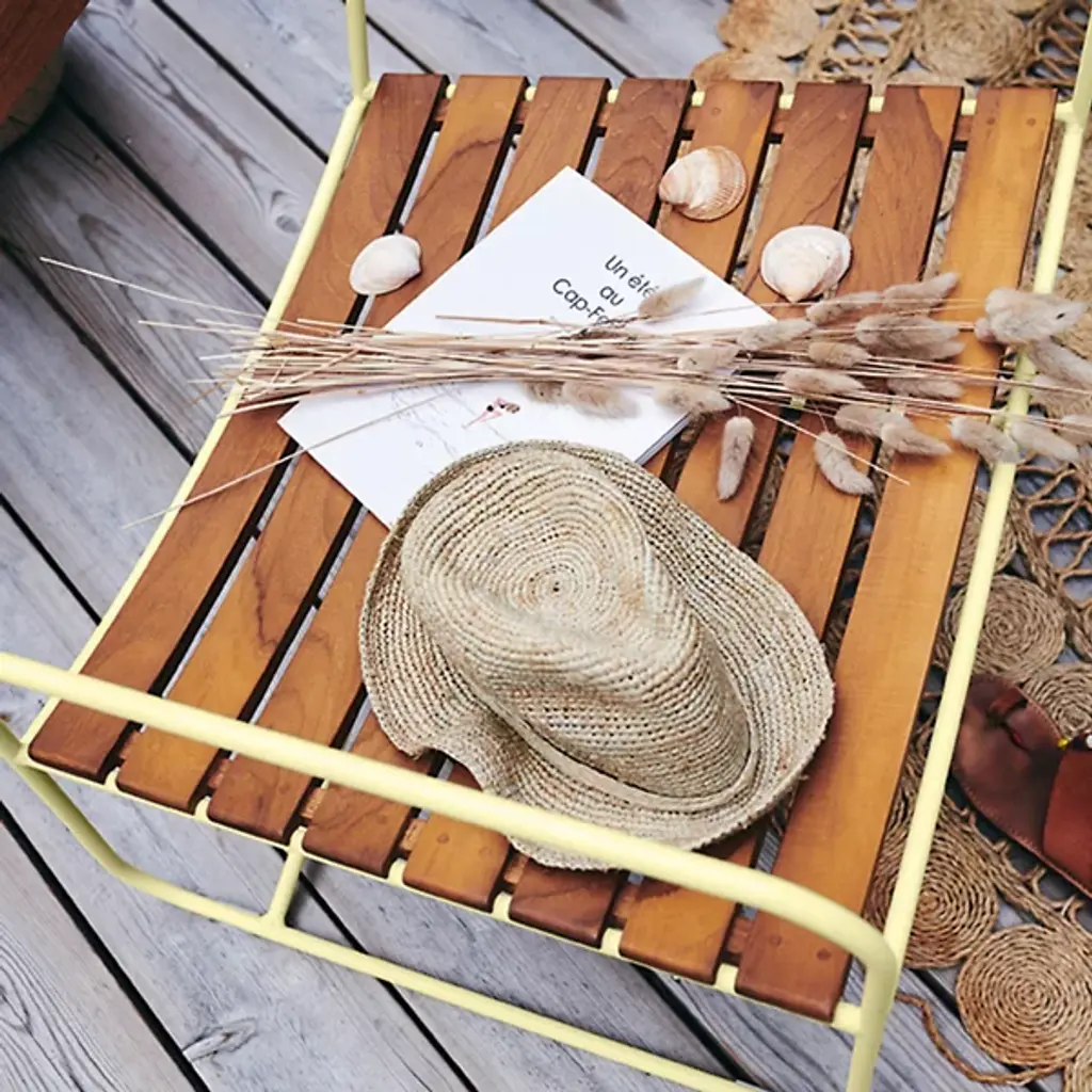 A graceful surprise. Invite classic good looks and comfort to your outdoor seating with the Surprising Teak Low Armchair by Fermob. Designer Harold Guggenbichler brings his penchant for poetic curves to this armchair design. With its graceful proportions and elegant curves, this low armchair showcases a slatted back and seat in warm, natural Teak. The ergonomically curved seat provides comfort for relaxing with a cold drink on the patio and the Steel rod frame with its sleigh base and crossbar provide stability. Pair this deck chair with the Surprising Teak Footrest for the ultimate lounging comfort when relaxing poolside with a book or catching up with friends on a breezy summer’s eve.