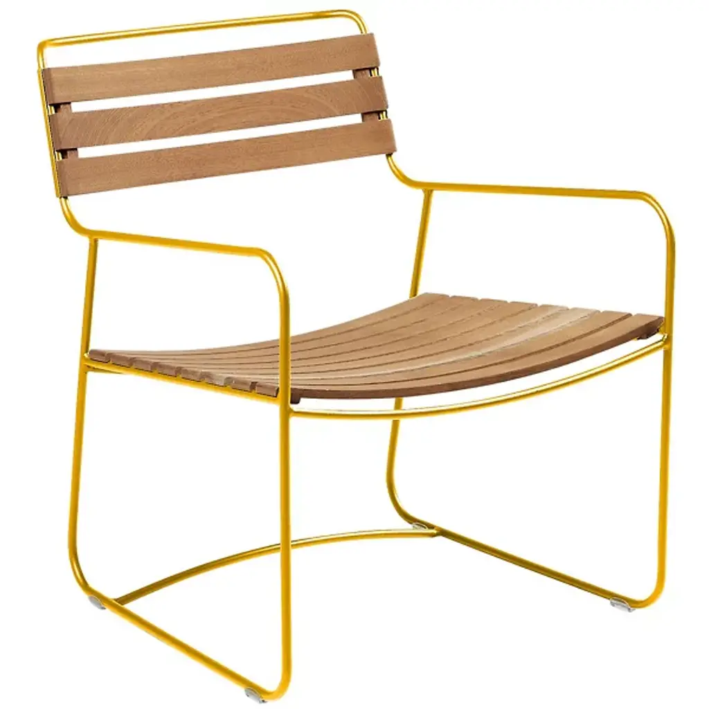 A graceful surprise. Invite classic good looks and comfort to your outdoor seating with the Surprising Teak Low Armchair by Fermob. Designer Harold Guggenbichler brings his penchant for poetic curves to this armchair design. With its graceful proportions and elegant curves, this low armchair showcases a slatted back and seat in warm, natural Teak. The ergonomically curved seat provides comfort for relaxing with a cold drink on the patio and the Steel rod frame with its sleigh base and crossbar provide stability. Pair this deck chair with the Surprising Teak Footrest for the ultimate lounging comfort when relaxing poolside with a book or catching up with friends on a breezy summer’s eve.