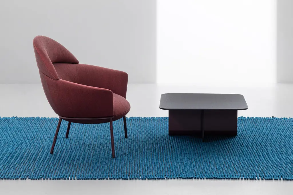Thanks to an abundant and generous structure, the Swale armchair evokes relaxed conversation scenarios for residential and contract environments. The comfort of the seating is given by its large and enveloping shapes, expertly reproduced in the seat and back elements. In its version with headrest, Swale represents a refined reading sitting; the low back, on the other hand, allows effective use in contract environments, where Swale brings the best features of a domestic upholstery.Additional Info:Material: Upholstery, Lacquered steelFinish: Cat. Maxi, Uniform MélangeBase finish: PlumDimensions: 98 W x 80 D x 92 H cmSeat height: 44 cmAvailable in other upholstery optionsAvailable in other structural optionsAvailable in other base finish options: Ivory, mud, pitch black
