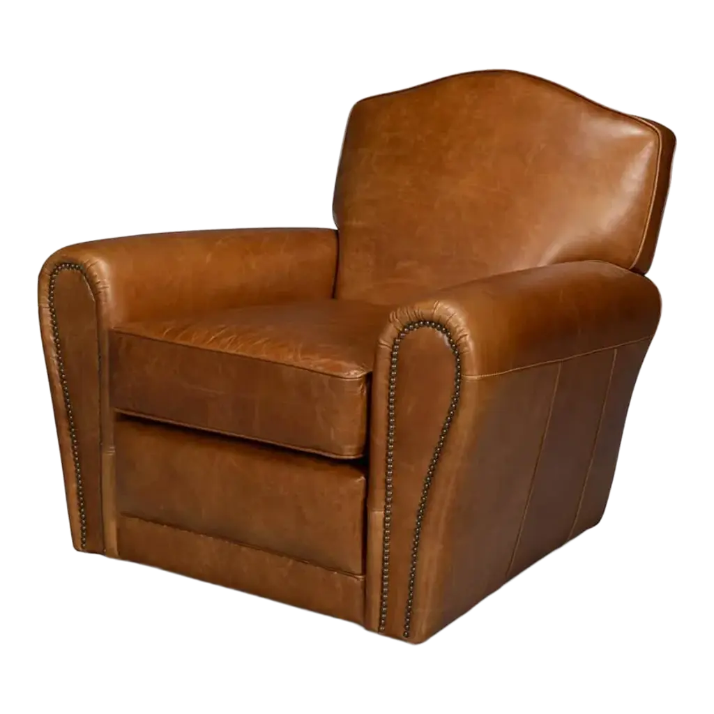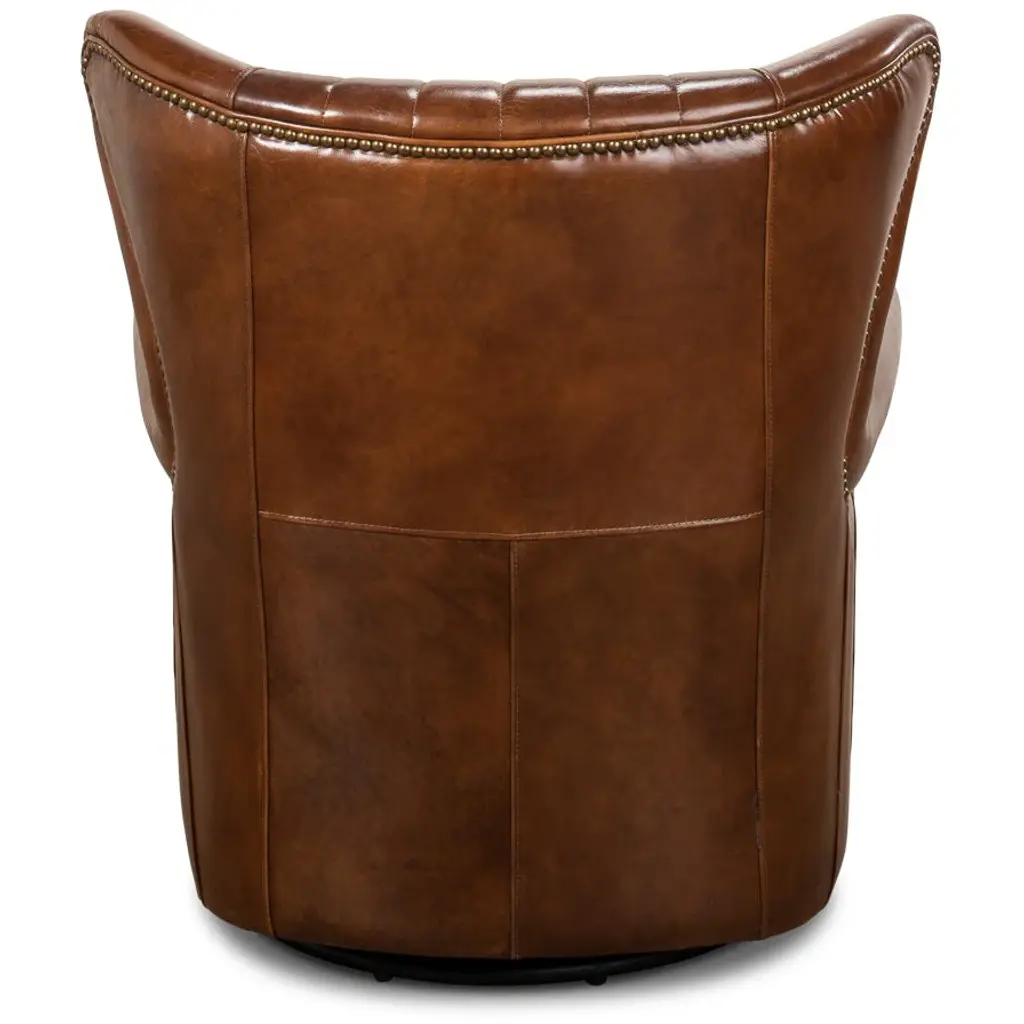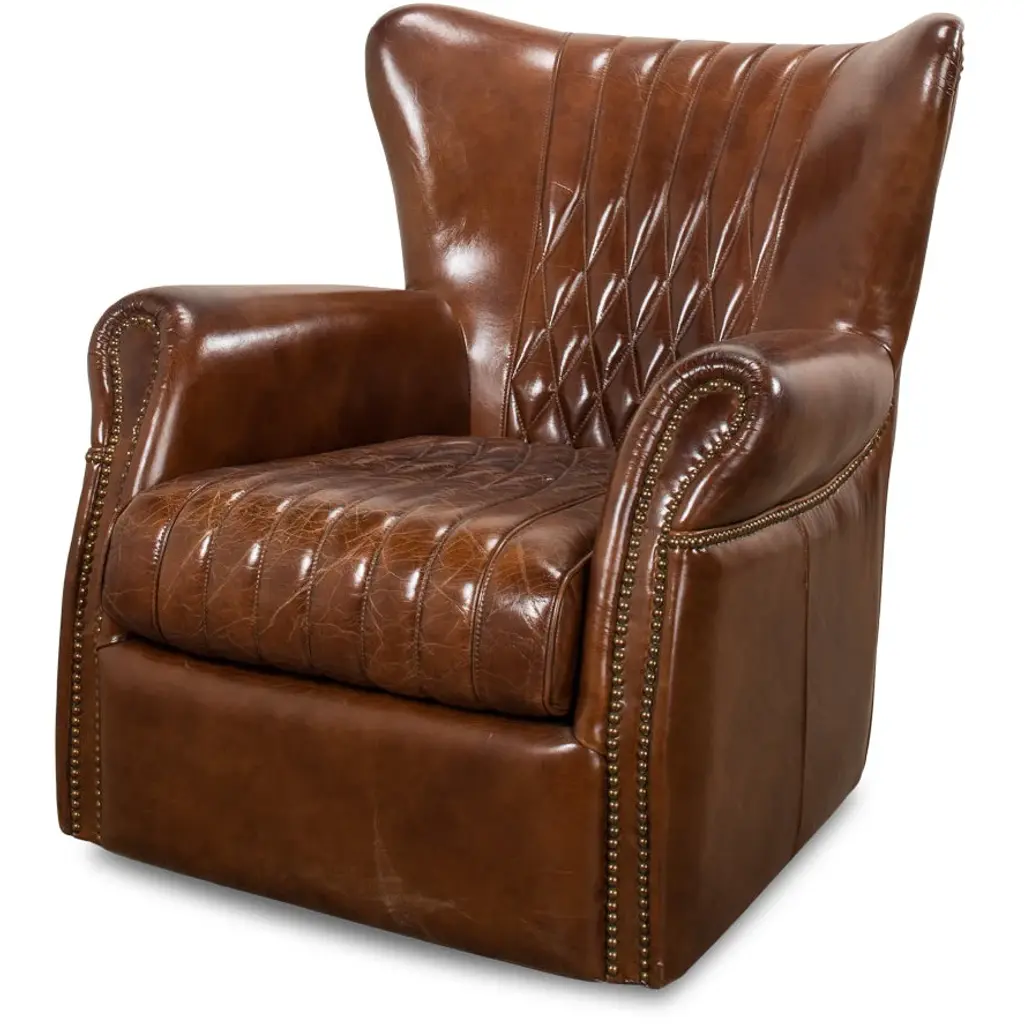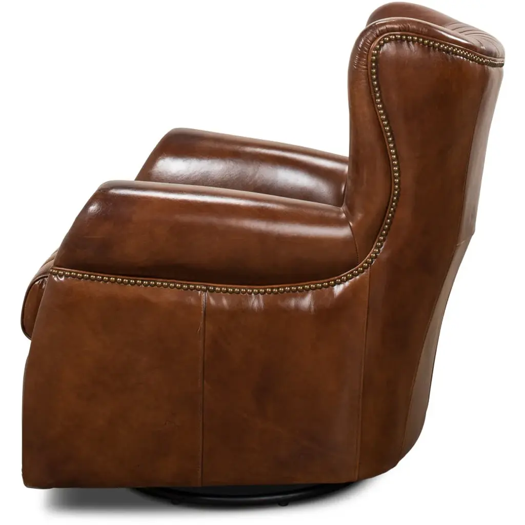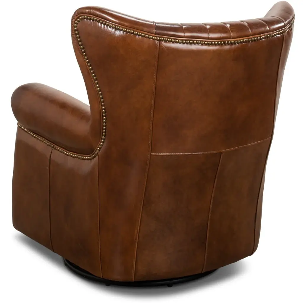 Lending welcoming warmth and serious comfort, this handsome brown leather swivel wing chair, is always in style. Detailed stitching and antiqued brass nail tacks elevate this iconic design. Try this in multiples for a cozy conversation pit. Due to the organic nature of leather and hides there may be slight variances in color and pattern as well as scarring which is considered a unique attribute of the material and not a defect.