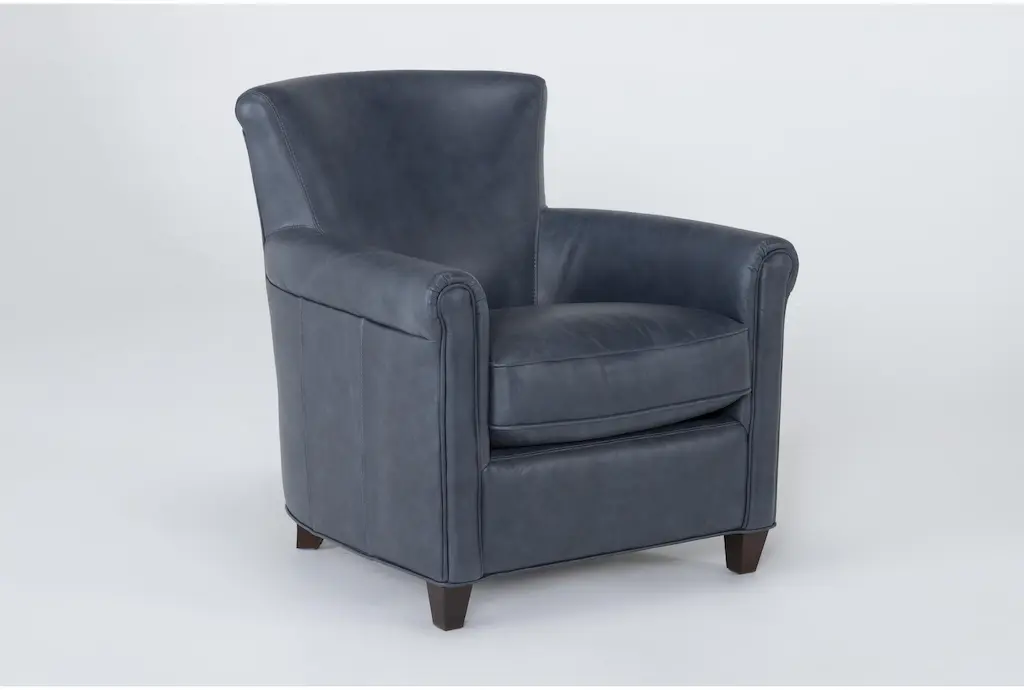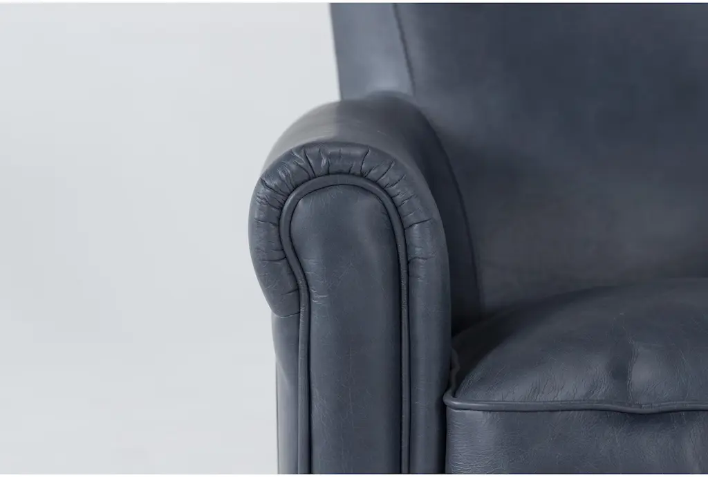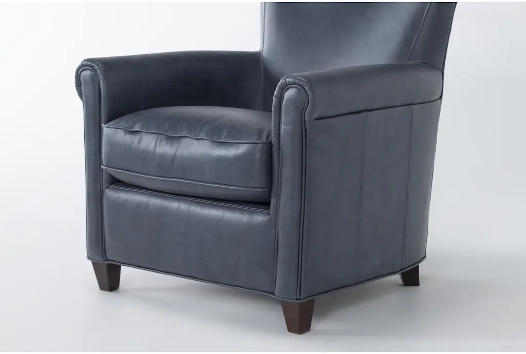 Discover the Theodore Blue Leather Arm Chair, a timeless addition to any living room or bedroom. This traditional club chair features a deep blue leather upholstery that brings a touch of sophistication and comfort to your home. With its firm foam cushions and classic rolled arms, this chair offers both style and support for your lounging needs.